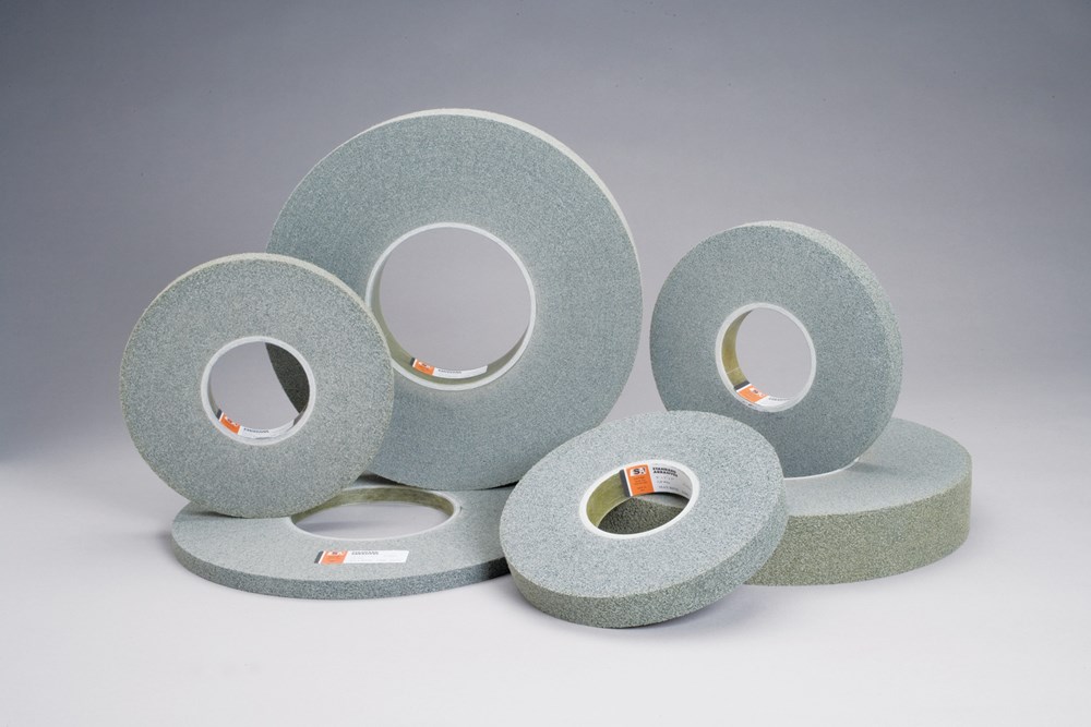The wheel utilizes either silicon carbide or aluminum oxide – and are available in medium to hard densities, ranging from 8 to 10. Together, these properties combine to cut aggressively, maintain wheel shape and stand up to edges. Nylon fibers in the open web break down while deburring the surface, exposing fresh, sharp mineral. The wheel breakdown contributes to consistent cutting action. Gaps between the nylon fibers allow swarf and debris to escape, keeping the mineral sharp and preventing blunt or dull edges that might gouge or blemish the surface of the workpiece. Subsequently, smear-resistant finishes result.