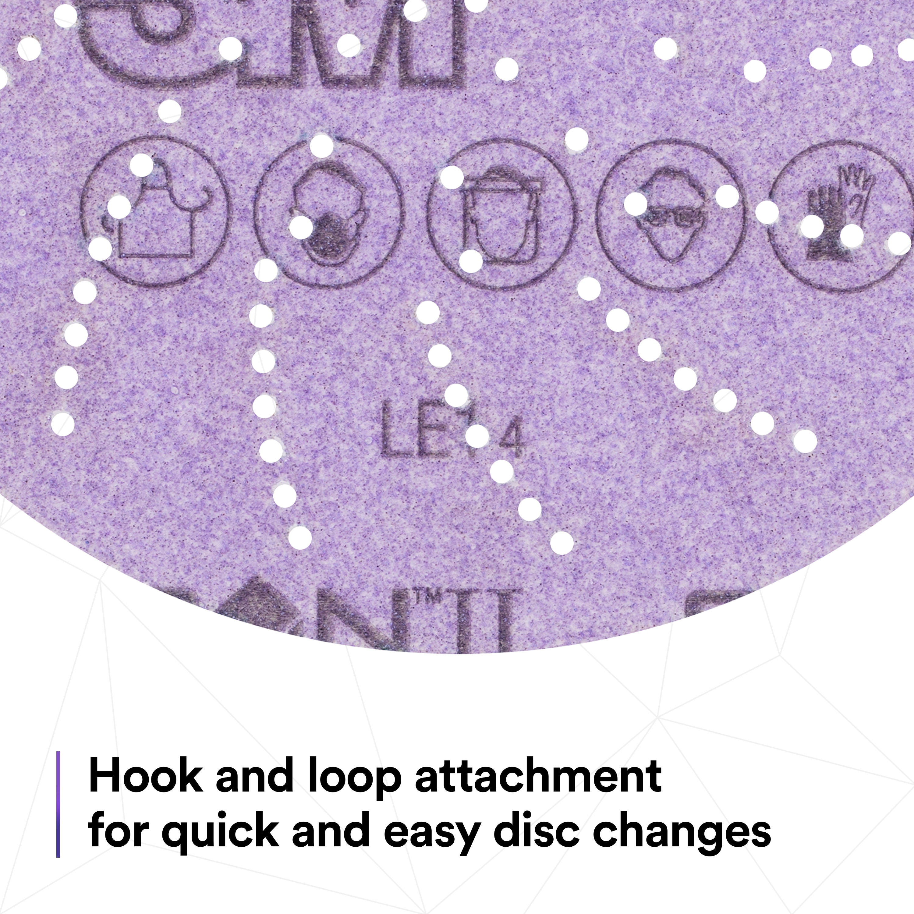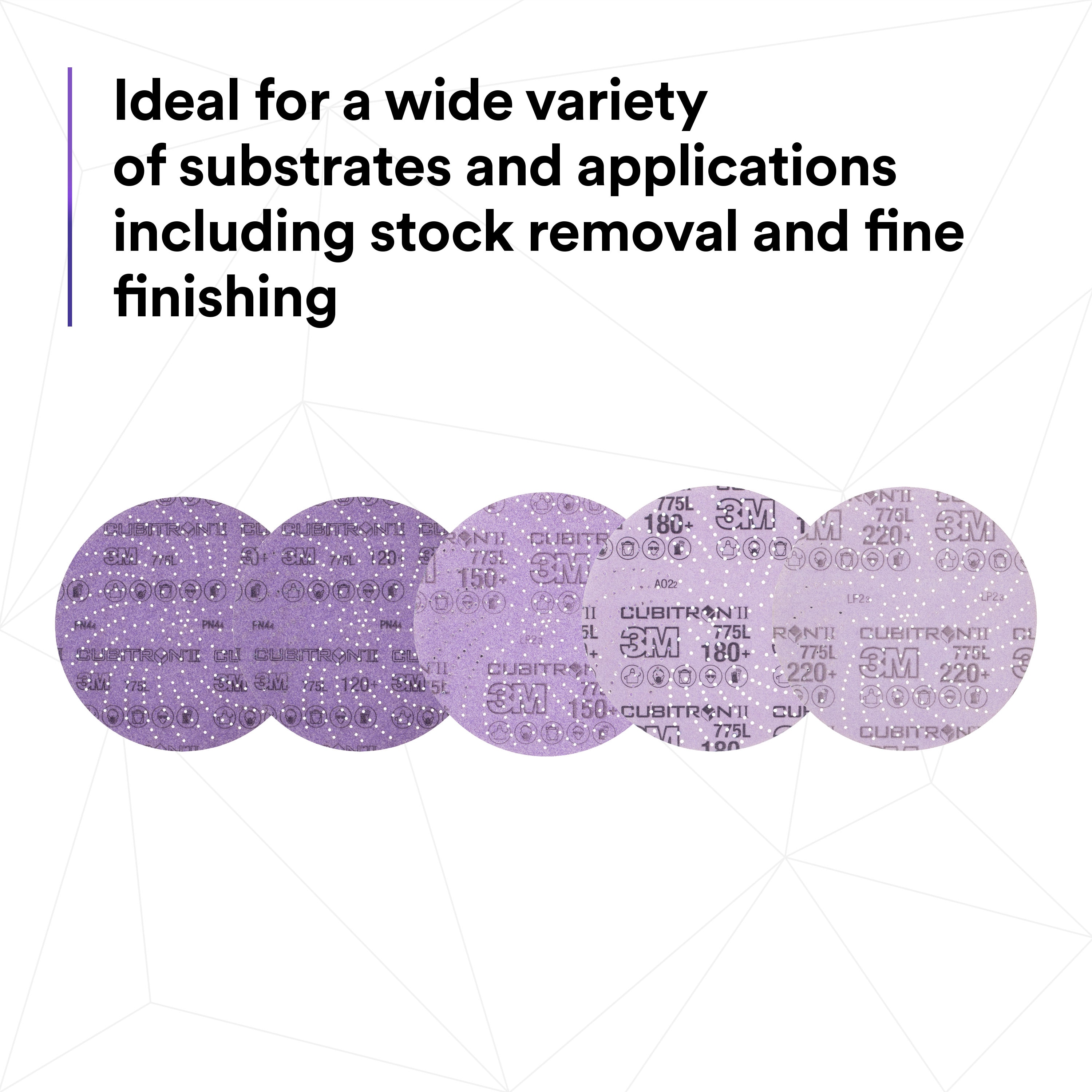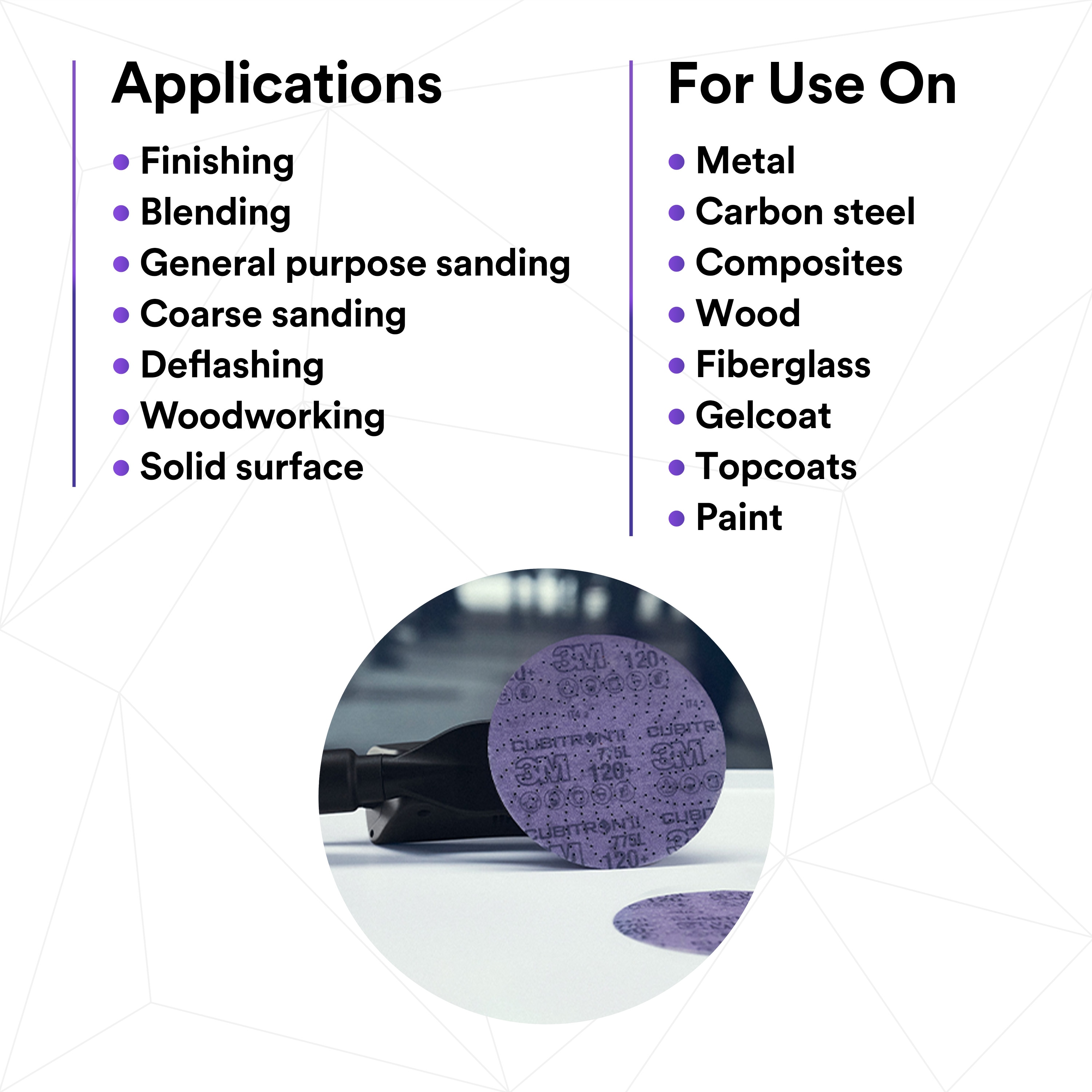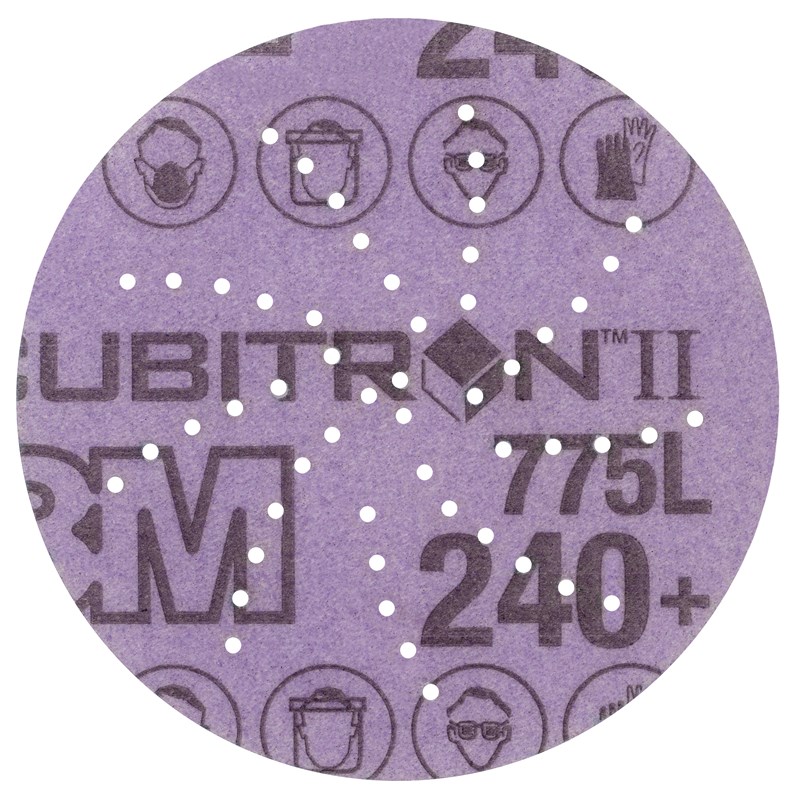 The 3M Xtract Cubitron II Disc 775L is a part of the 3M Xtract Series, meaning that it is specially designed for optimal dust removal. Featuring an innovative, multi-hole pattern that extracts dust better than 5 or 6-hole products, this product delivers dramatically increasing disc life — without the need to align the disc pad holes. This product also uses ceramic 3M Precision-Shaped Grain, a revolutionary advancement in abrasive technology comprised of triangular-shaped ceramic mineral designed to slice through the substrate, rather than gouging or 'plowing' like conventional abrasives. This results in a disc that cuts quickly and efficiently. Additionally, the 3M Xtract Cubitron II Disc 775L has a film backing that delivers outstanding tear resistance, flexibility, and a consistent, uniform finish on a variety of substrates, including metals, composites, gelcoat, and whitewood. For best results, pair this disc with a 3M Xtract Random Orbital Sander.