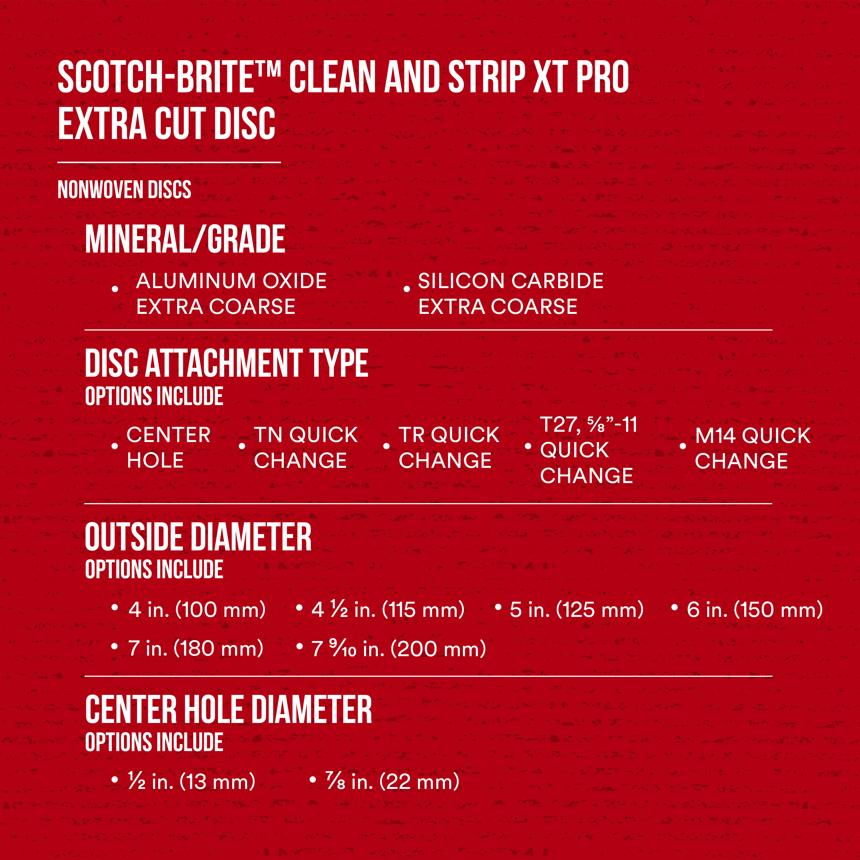 Take Advantage of High Conformability. With its re-engineered fiber web, the Scotch-Brite™ Clean and Strip XT Pro Extra Cut TN Quick Change Disc allows operators to take advantage of all the benefits that come with increased conformability without compromising strength. With increased conformability, this disc achieves a larger contact area with the workpiece for faster removal rates. It also conforms to weld bead ripples to polish welds without removing them and works in hard-to-reach areas without damaging the substrate. In addition to its high conformability, the Scotch-Brite™ Clean and Strip XT Pro Extra Cut Disc offers low vibration, decreased chunking, a high-speed rating and long life. That all adds up to a disc you can spin onto your angle grinder with confidence. Save Time with Aluminum Oxide. We designed our Scotch-Brite™ Clean and Strip XT Pro Extra Cut Disc with aluminum oxide abrasive mineral because of its ability to remove heavy coatings and simultaneously scratch and clean to the bare metal underneath without leaving divots. This means that operators can remove a coating from a workpiece and get it ready for welding or adhesive application with the same disc – saving the time of switching abrasives. Spongy Web, Sharp Mineral. To engineer our Scotch-Brite™ Clean and Strip XT Pro Extra Cut Disc, aluminum oxide mineral is combined with nonwoven nylon fibers using resin. Aluminum oxide is a very hard mineral that delivers a high cut rate, commonly used in high-pressure applications like cutting and weld removal. The resin bond strengthens the fiber web and allows it to gradually break down to reveal new fibers and sharp mineral – delivering a consistent cut over the life of the abrasive. The combination of fiber strands, resin and abrasive mineral forms a thick, open web. Gaps in the web allow swarf to escape, minimizing loading of the abrasive. Applications include removing heavy rust, removing rust pits, removing thick paint, removing corrosion, removing weld discoloration, and weld cleanup