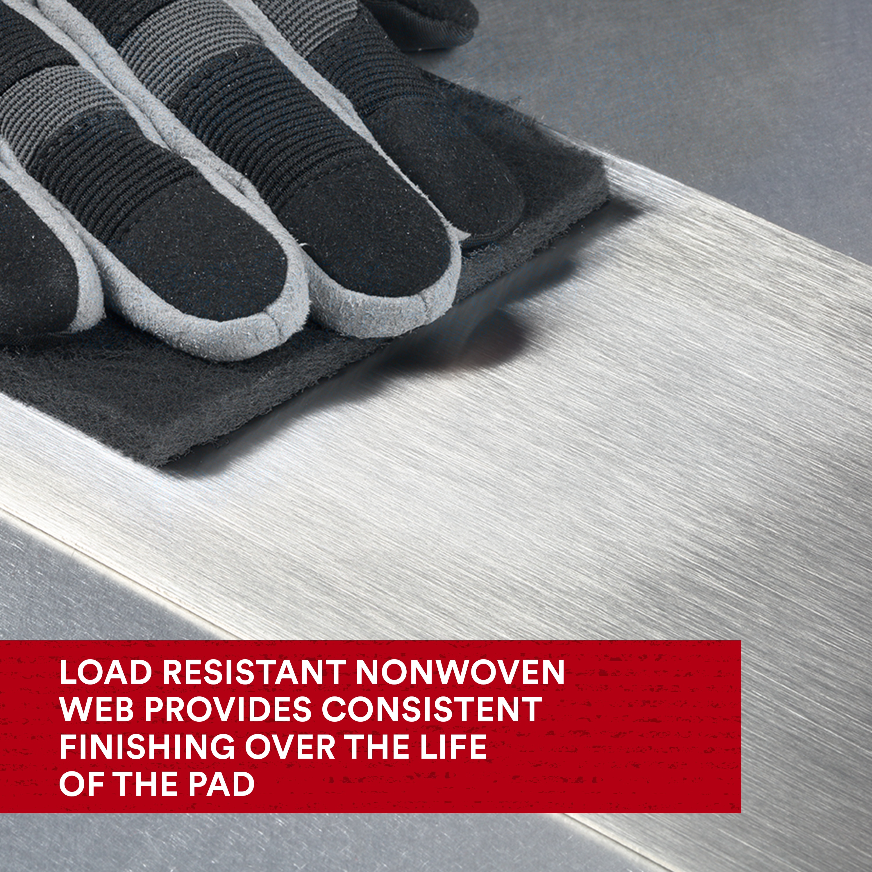 CONSISTENT PERFORMANCE OVER TIME: Load resistant nonwoven web provides consistent finishing over the life of the pad