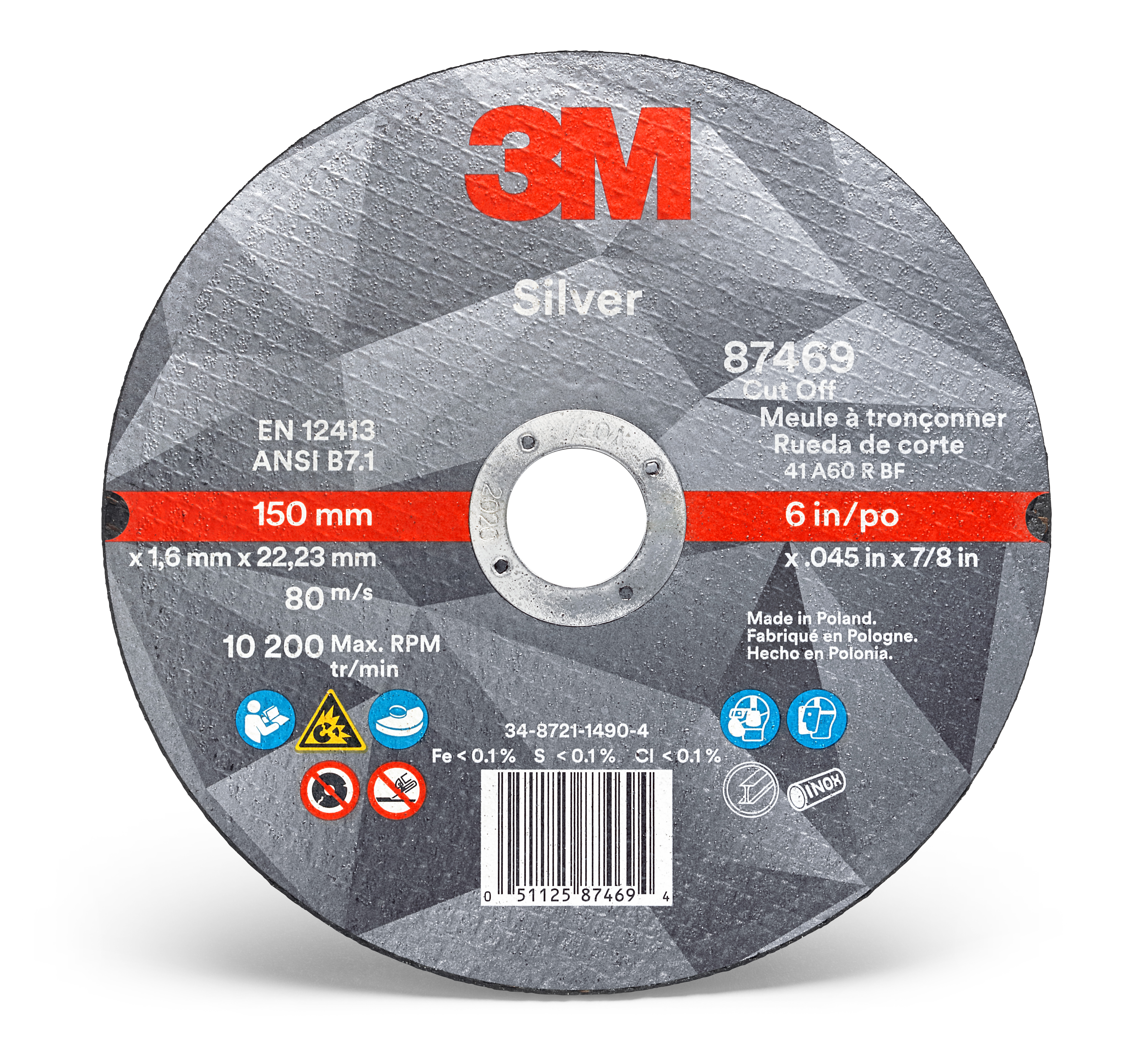 All Products>Abrasives>3M™ Silver Cut-Off Wheel, 87469, 36+, T1, 6 in x 0.045 in x 7/8 in, 25/Carton, 50 ea/Case