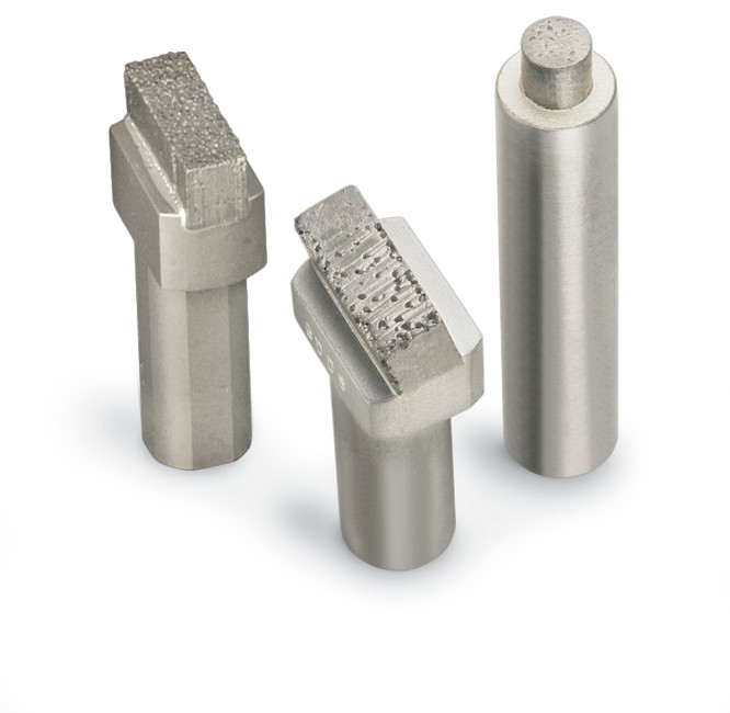 This diamond dressing tool was engineered by combining durable diamond grit with a metal bond matrix in straight or offset configurations. It comes in three shapes, so operators can tailor their approach to dressing. The three shapes include: 15 degree angle, straight and cylindrical straight round. The fine-grained diamond mineral is adhered to the head of each shape, ready to softly scrape away resin and debris and unearth the sharp wheel mineral beneath. Compared to multi-point dressing tools — where the diamond mineral is raised on the head — the diamond mineral on an impregnated tool is finer and more inset, making it a good option when light-pressure dressing, almost brush-like, is desirable.