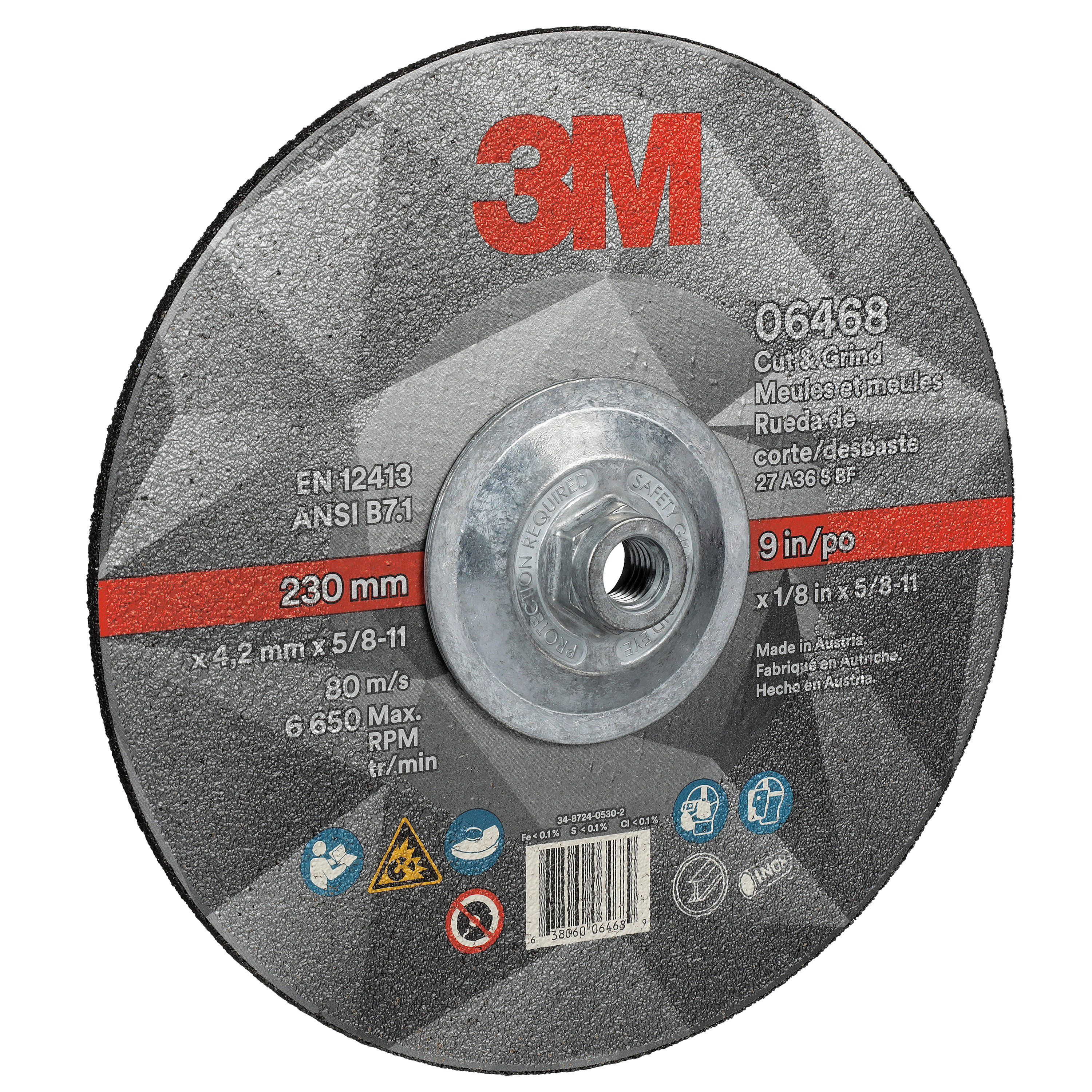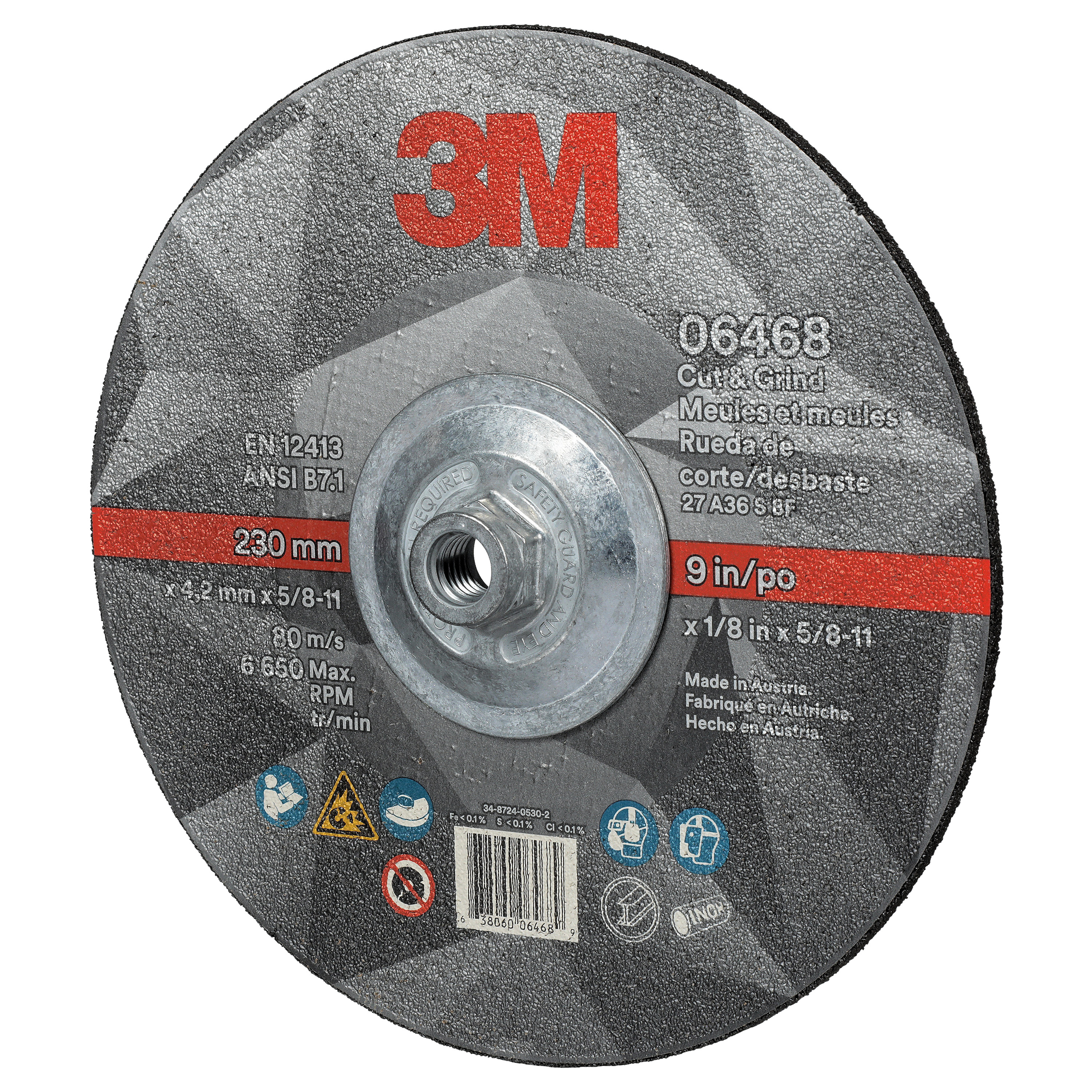 All Products>Abrasives>3M™ Cut & Grind Wheel, 06468, 36+, T27 Quick Change, 9 in x 1/8 in x 5/8 in-11, 10/Carton, 20 ea/Case