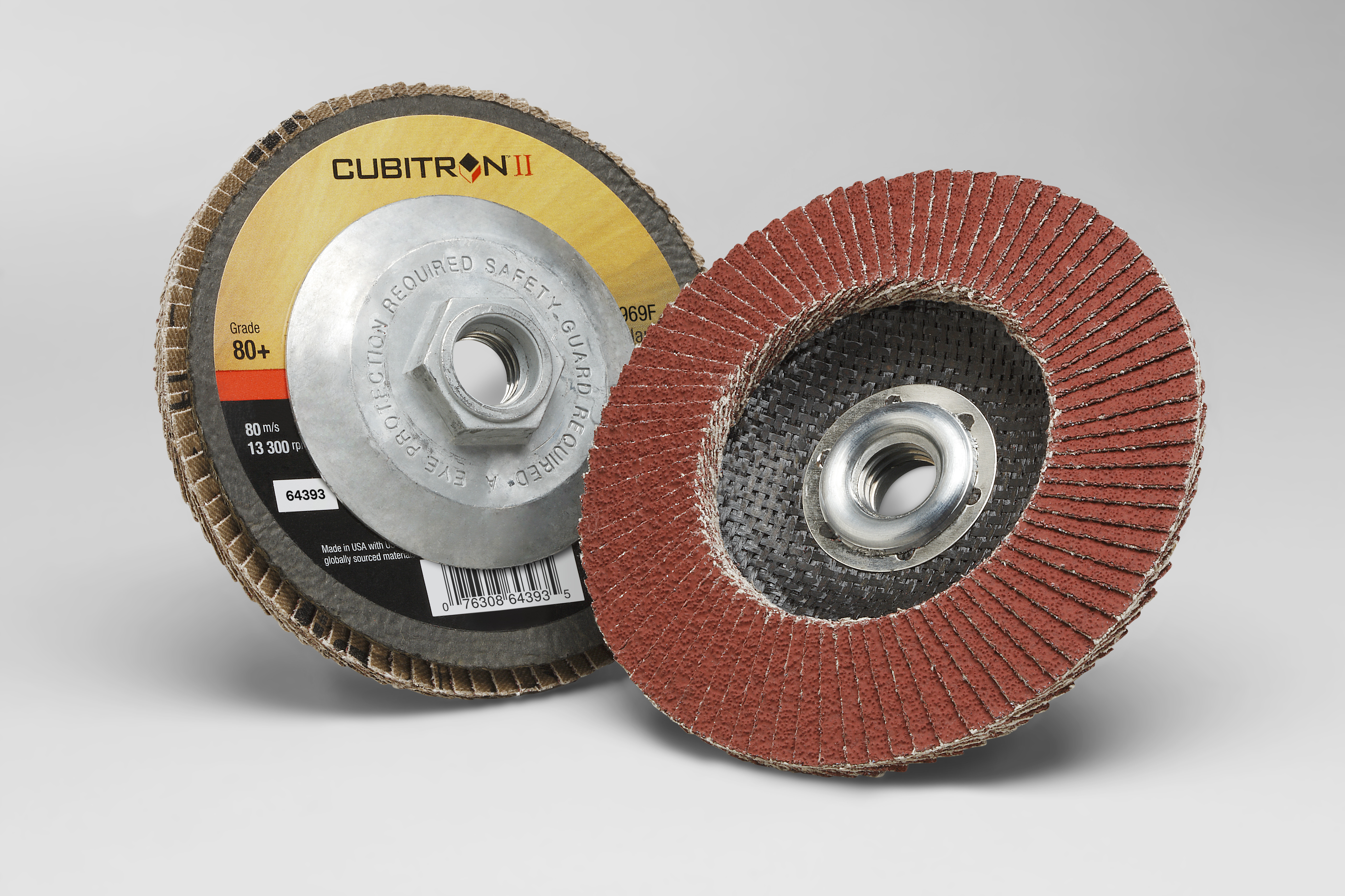 Keeps Cutting After Other Discs Quit3M™ Cubitron™ II Flap Disc 969F – powered by 3M Precision-Shaped grain and a tough polyester backing – is the highest-performing 3M flap disc for demanding applications like heavy grinding, edge deburring and beveling. It also features a grinding aid that helps it run cool to maintain cutting efficiency on heat-sensitive metals. All of these attributes make 3M™ Cubitron™ II Flap Disc 969F a good match for projects that require an equally durable and versatile abrasive disc. Flap Disc DesignFlap discs are the ideal choice for a wide range of applications on a variety of metals. The abrasive flaps offer a long-lasting supply of fresh abrasives in a load-resistant design. Designed for use with a right-angle grinder, flap discs allow you to breeze through a wide range of applications with less chance of gouging – even for less-experienced grinders. Powered by 3M Precision-Shaped Grain3M™ Cubitron™ II Flap Disc 969F features proprietary 3M Precision-Shaped Grain – a grain design that continually fractures into sharp points that slice cleanly through metal, unlike traditional abrasives which tend to plow through the substrate. The grains fracture evenly and continuously to expose new sharp edges to keep the disc cutting efficiently. The result is that 3M™ Cubitron™ II products out-cut and outlast conventional ceramic industrial abrasives. Applications