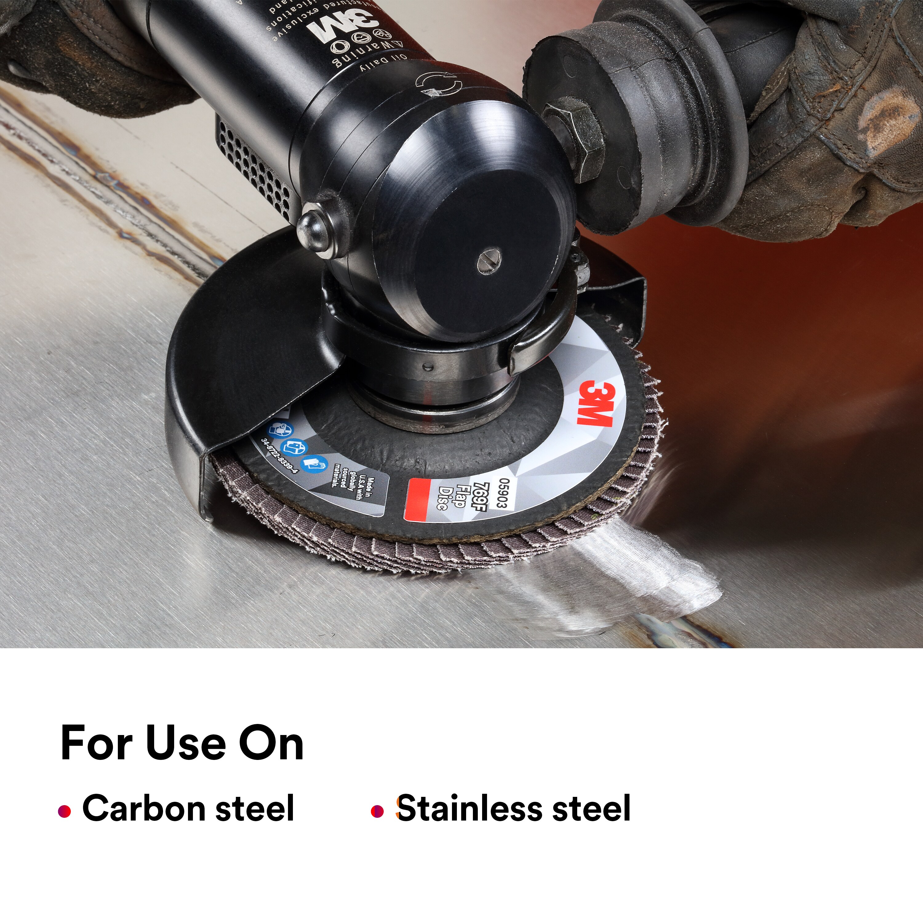 3M™ Flap Disc 769F is a long-lasting, versatile abrasive disc that includes all the advantages you expect from a flap disc, including conformability and ease of use with a lower risk of gouging. Featuring 3M Precision-Shaped Grain and a durable polyester backing, 3M™ Flap Disc 769F lasts long and holds up strong to high-pressure applications like beveling, weld grinding and edge deburring. Plus, it leaves a finish that makes it a great choice for applications like blending and surface prep.