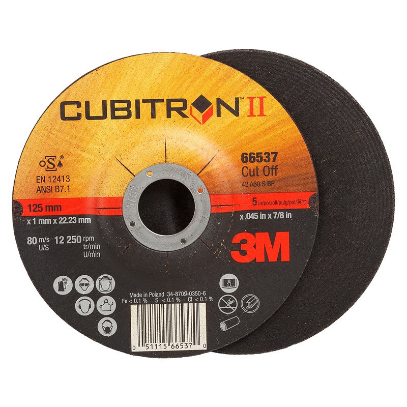 All Products>Abrasives>3M™ Cubitron™ II Cut-Off Wheel, 66537, 36, T42, 125 mm x 1.6 mm x 22.23 mm, 25/Inner, 50 ea/Case