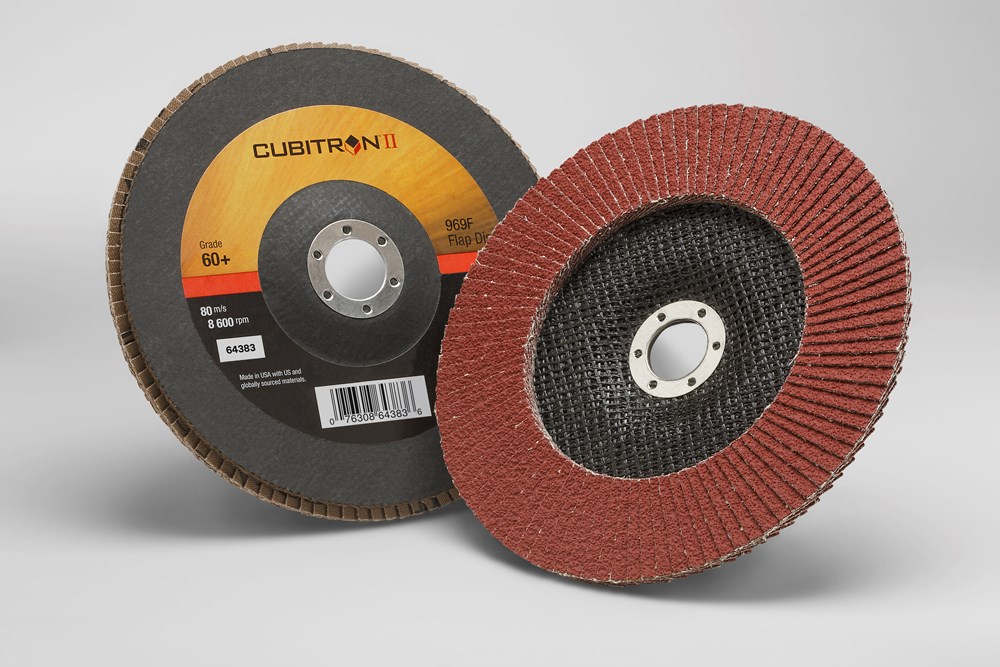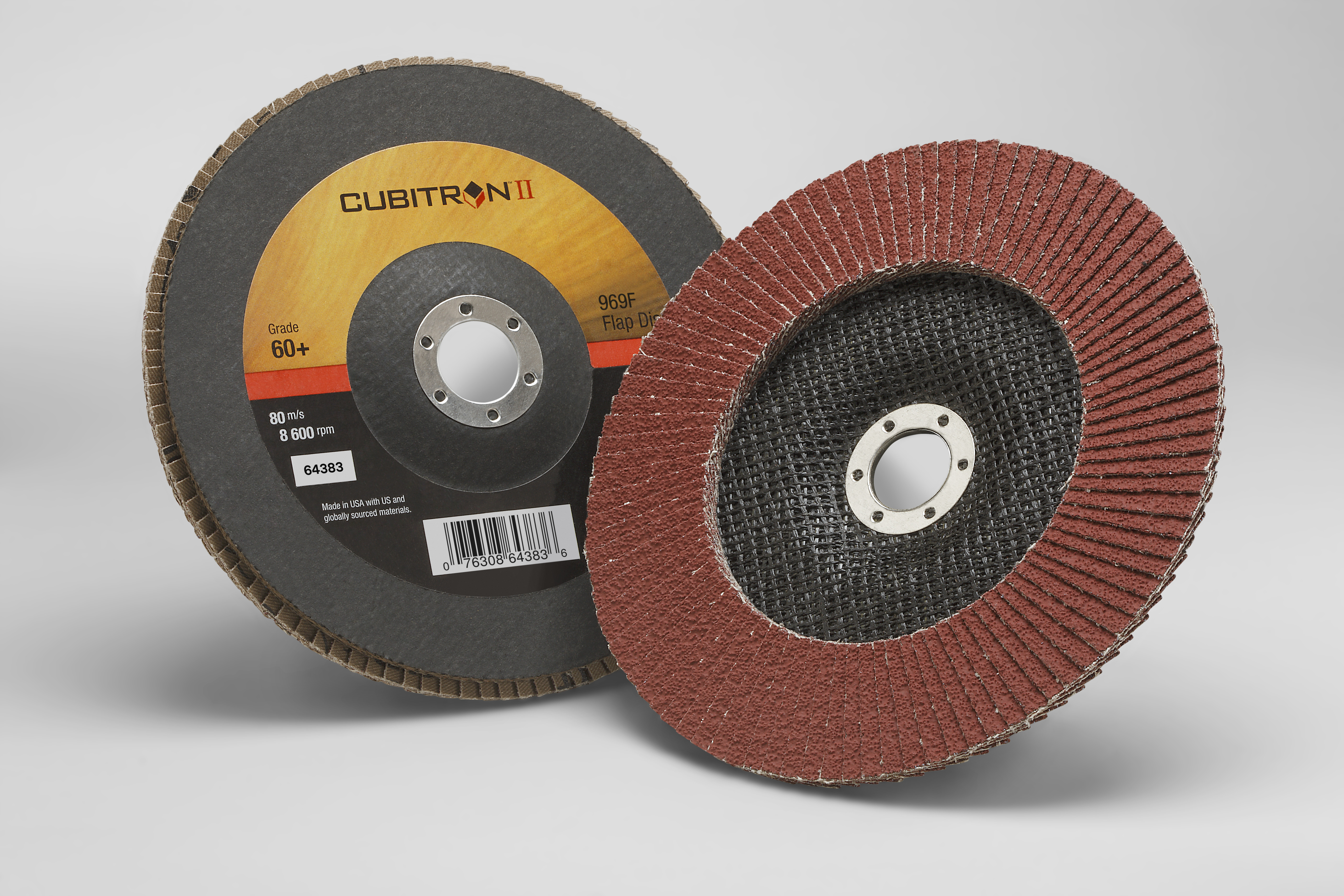 Keeps Cutting After Other Discs Quit3M™ Cubitron™ II Flap Disc 969F – powered by 3M Precision-Shaped grain and a tough polyester backing – is the highest-performing 3M flap disc for demanding applications like heavy grinding, edge deburring and beveling. It also features a grinding aid that helps it run cool to maintain cutting efficiency on heat-sensitive metals. All of these attributes make 3M™ Cubitron™ II Flap Disc 969F a good match for projects that require an equally durable and versatile abrasive disc. Flap Disc DesignFlap discs are the ideal choice for a wide range of applications on a variety of metals. The abrasive flaps offer a long-lasting supply of fresh abrasives in a load-resistant design. Designed for use with a right-angle grinder, flap discs allow you to breeze through a wide range of applications with less chance of gouging – even for less-experienced grinders. Powered by 3M Precision-Shaped Grain3M™ Cubitron™ II Flap Disc 969F features proprietary 3M Precision-Shaped Grain – a grain design that continually fractures into sharp points that slice cleanly through metal, unlike traditional abrasives which tend to plow through the substrate. The grains fracture evenly and continuously to expose new sharp edges to keep the disc cutting efficiently. The result is that 3M™ Cubitron™ II products out-cut and outlast conventional ceramic industrial abrasives. Applications