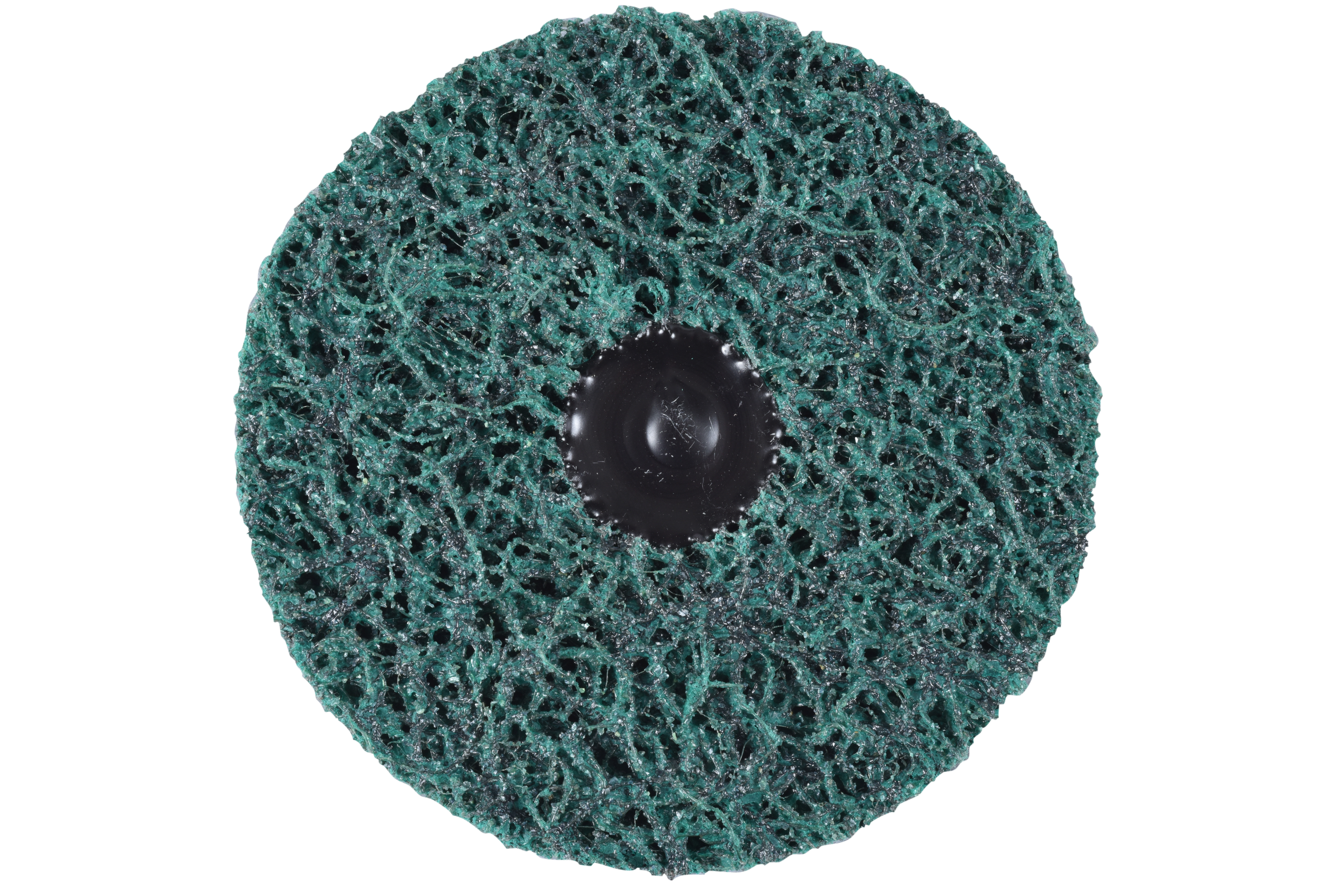 To engineer the Scotch-Brite™ Roloc™+ Clean and Strip XT Pro Extra Cut Disc, aluminum oxide mineral is combined with non-woven nylon fibers using resin. Aluminum oxide is a very hard mineral that delivers a high cut rate, commonly used in high-pressure applications like cutting and weld removal. The resin bond strengthens the fiber web and allows it to gradually break down to reveal new fibers and sharp mineral – delivering a consistent cut over the life of the abrasive. The combination of fiber strands, resin and abrasive mineral forms a thick, open web. Gaps in the web allow swarf to escape, minimizing loading of the abrasive.