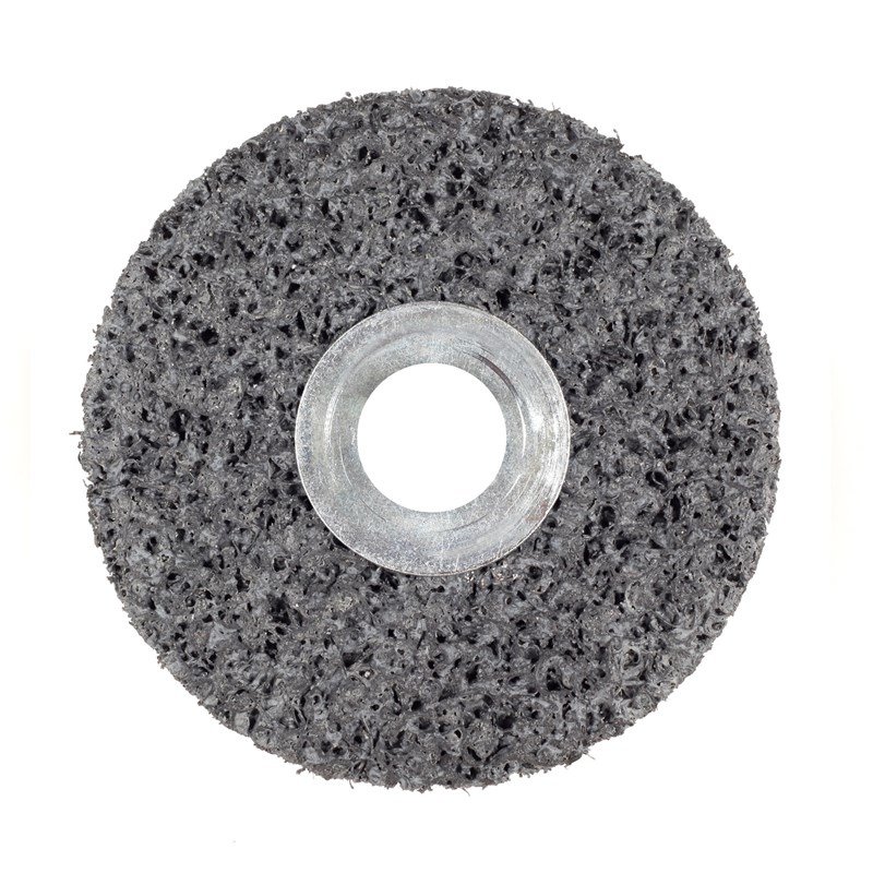 Peeling back the paint, here's how the Scotch-Brite™ Clean and Strip Unitized Wheel is engineered. To help with your toughest cleaning applications, extra coarse (XCS) silicon carbide mineral is interspersed on synthetic fibers using resin. The coarse grade helps the abrasive cut more aggressively than minerals of a finer grade. While silicon carbide breaks down faster than aluminum oxide, it produces a brighter finish. It cuts sharply to effectively remove scale, rust, surface contaminants, paints, coatings, weld discoloration and splatter.