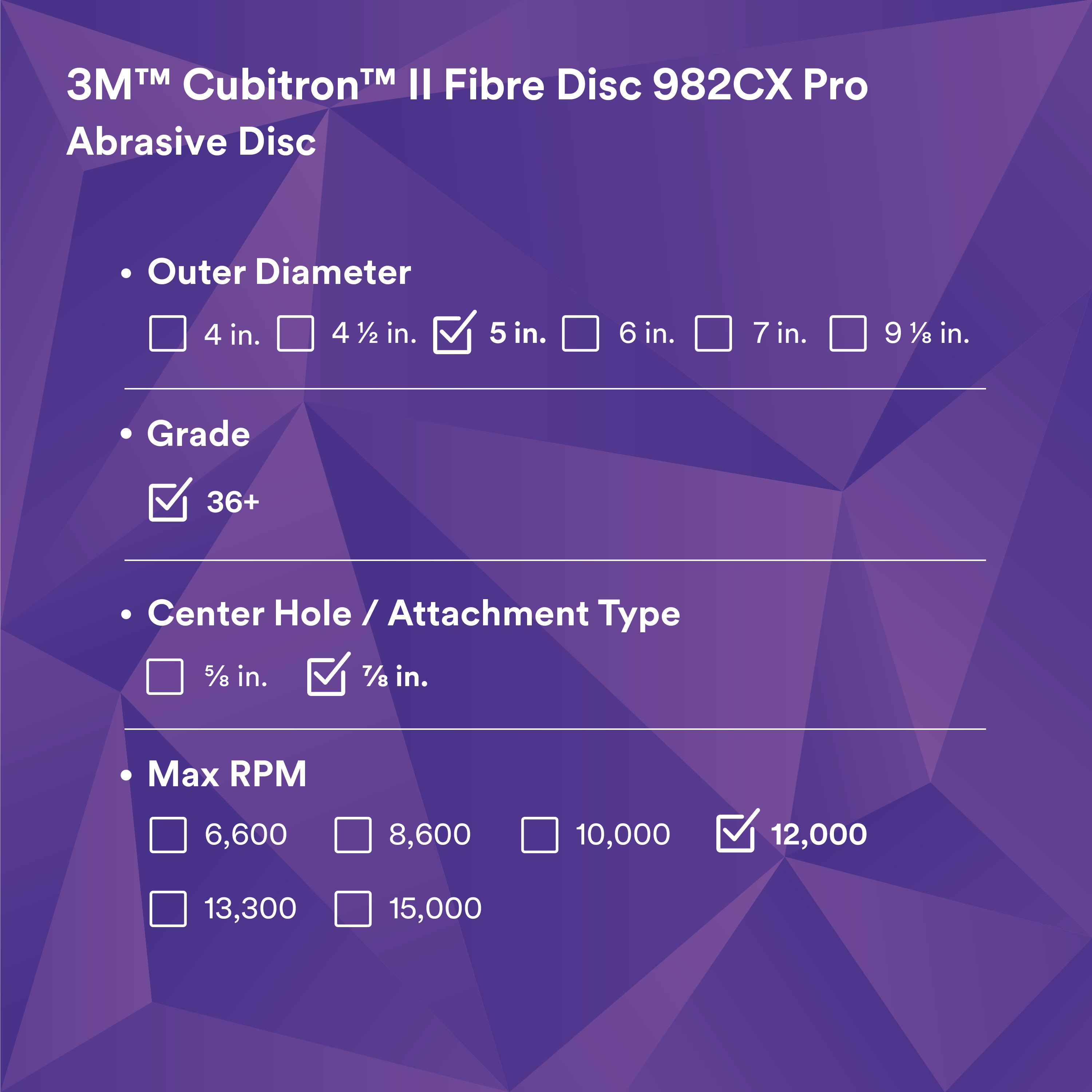 - RE-ENGINEERED 3M PRECISION SHAPED-GRAIN: Allows the 3M Cubitron II Fibre Discs 982CX Pro to provide a 33% higher cut rate and remove 31% more material with a sustained cut compared to 3M Cubitron II Fibre Disc 982C
