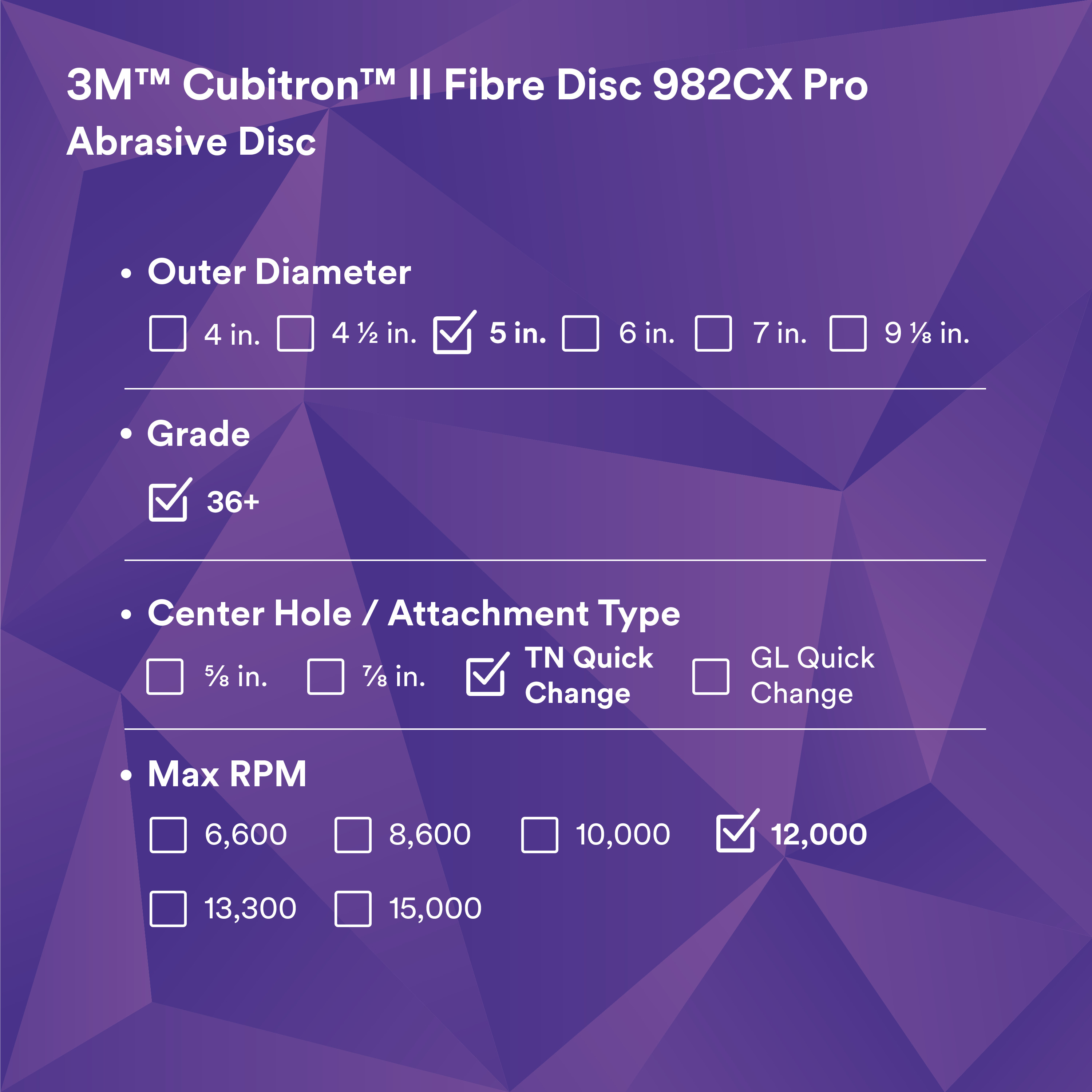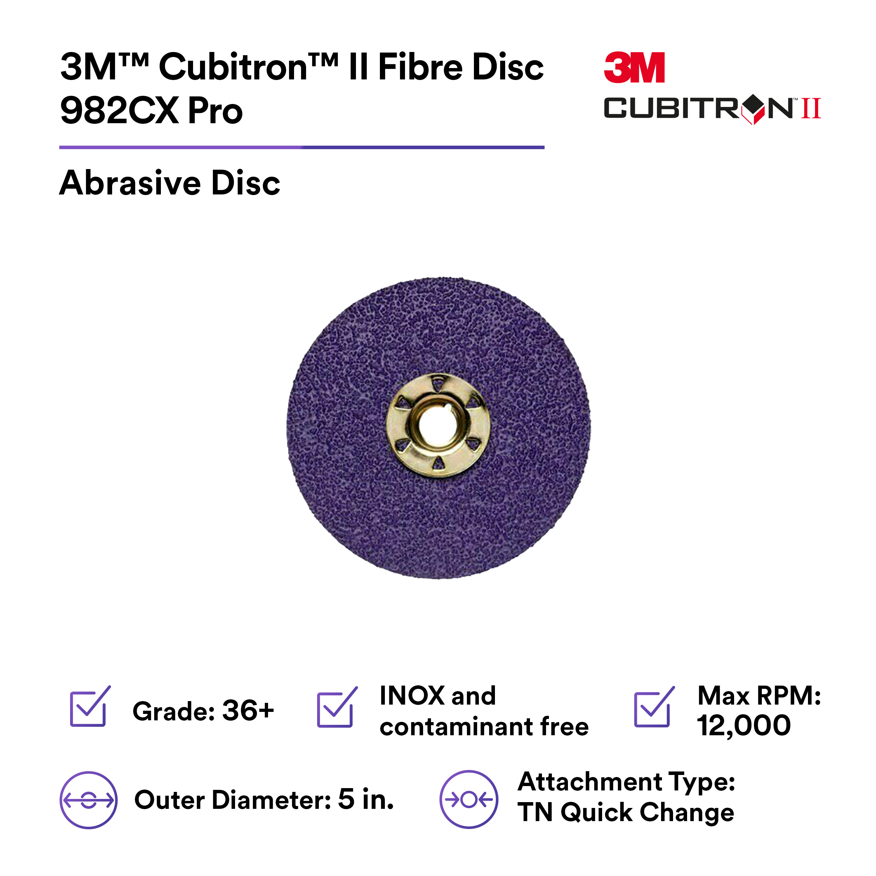 3M™ Cubitron™ II Fibre Disc 982CX Pro, 36+, TN Quick Change, 5 in, Die TN500P, 25/Bag, 100 ea/Case