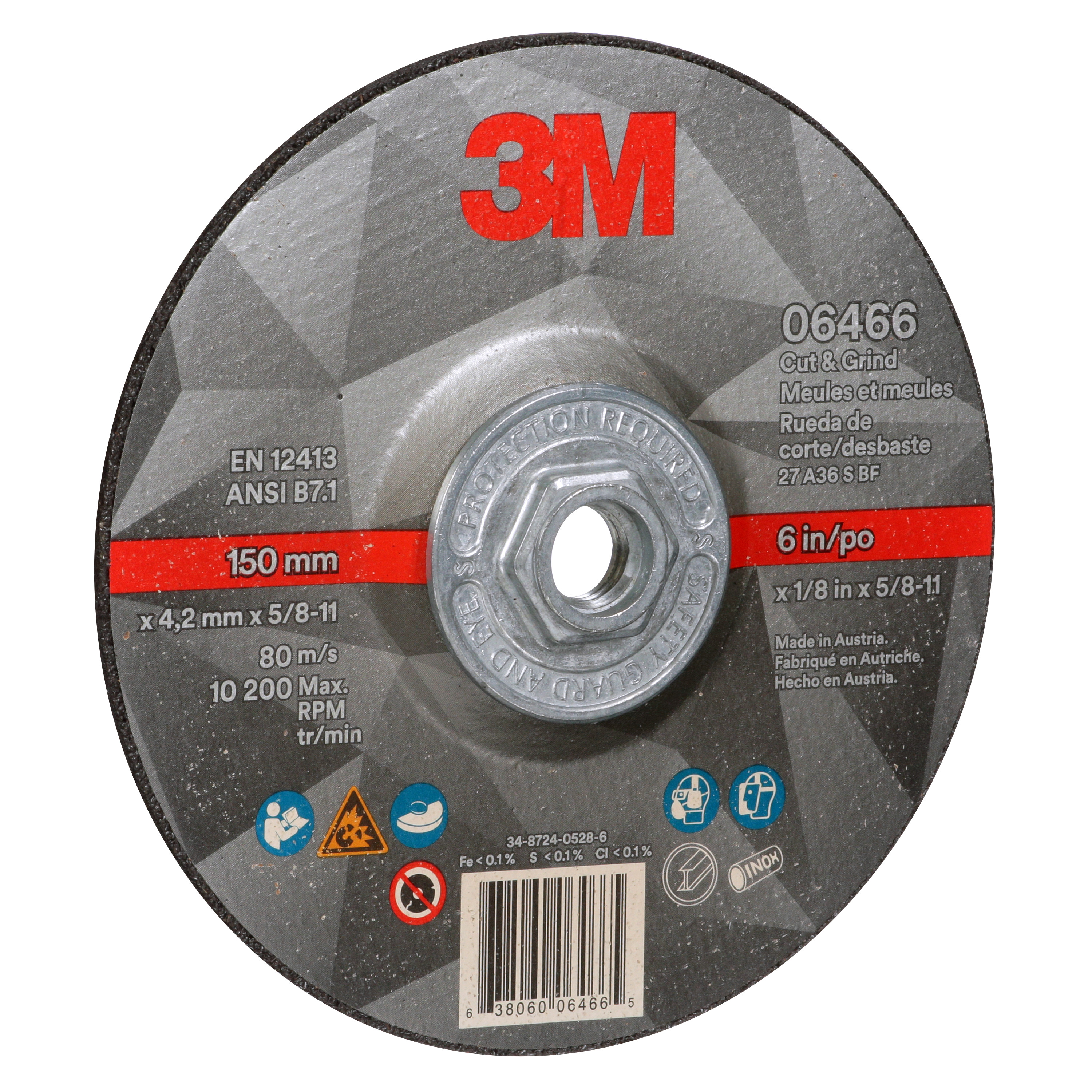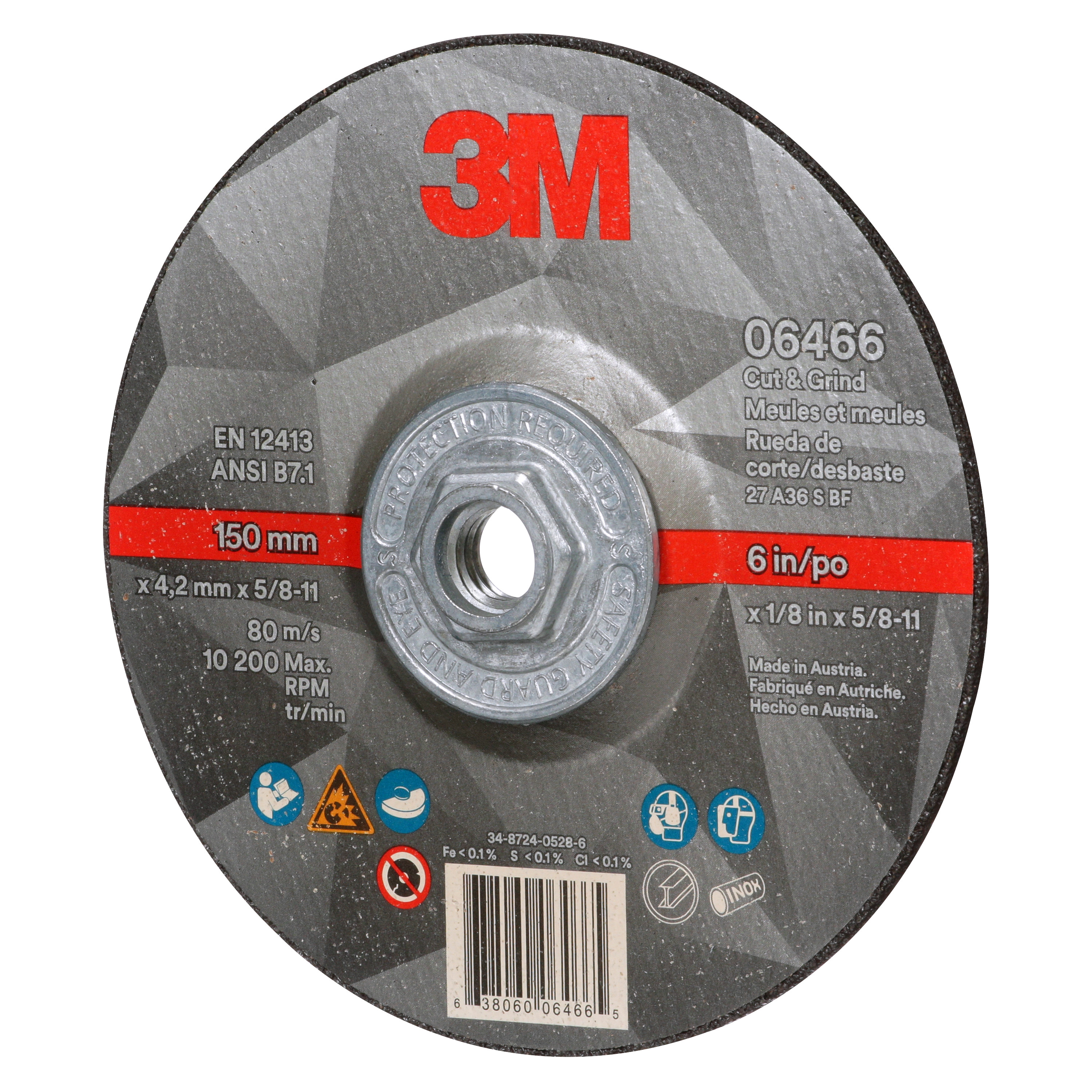 All Products>Abrasives>3M™ Cut & Grind Wheel, 06466, 36+, T27 Quick Change, 6 in x 1/8 in x 5/8 in-11, 10/Carton, 20 ea/Case