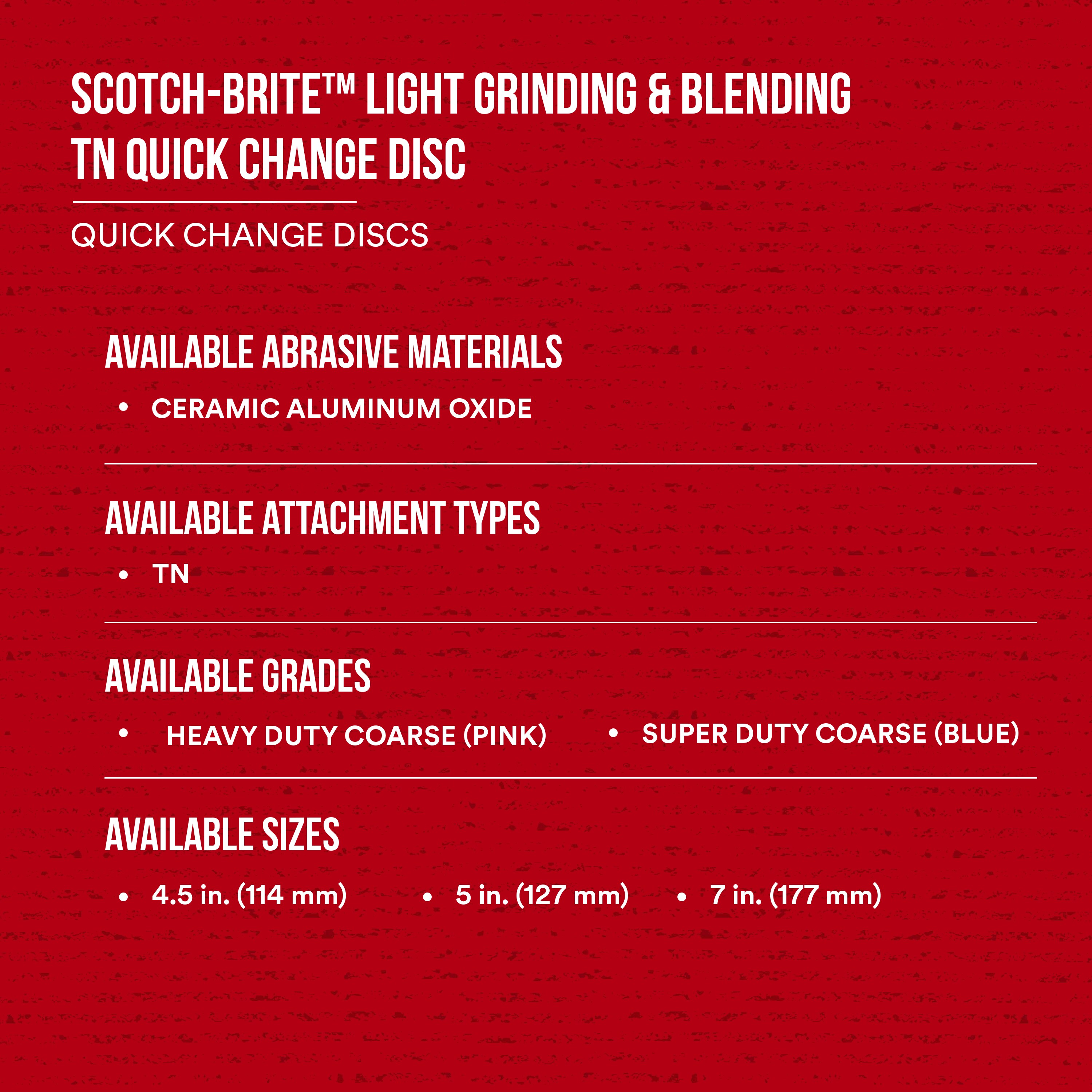 All Products>Abrasives>Scotch-Brite™ Light Grinding and Blending TN Quick Change Disc, GB-DN, Super Duty A Coarse, 4-1/2 in, 50 ea/Case