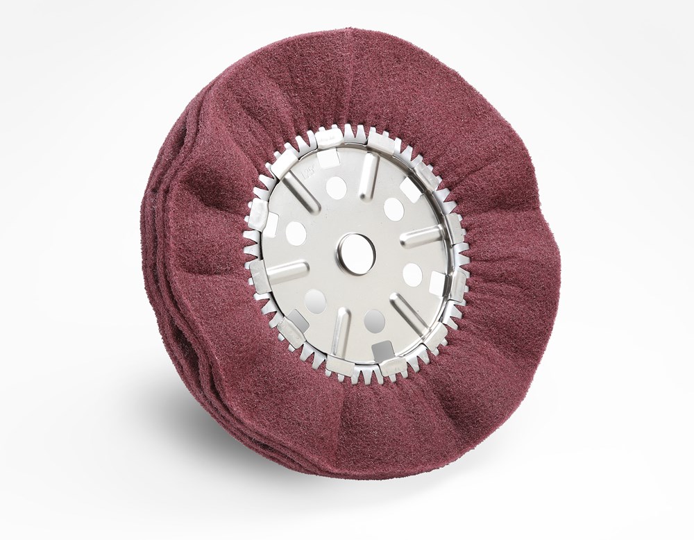 Advantages of a Pleated Design Scotch-Brite™ Satin Pleated Buff Wheel was designed with pleated nonwoven flaps attached to a steel or fiberglass core in a wave-like pattern. It can lightly finish, deburr and blend on most metals. The benefits of a pleated design are twofold. First, the spacing between the pleated layers ventilates the abrasive as it finishes. Air circulates between the layers, helping the abrasive run cool. Second, the wavy pattern decreases the potential for streaks. Other stacked discs have a slight gap between them, but the springy layers of pleated abrasive curve and undulate to ensue no gaps. Lines or traces that may result from stacked discs are eliminated.