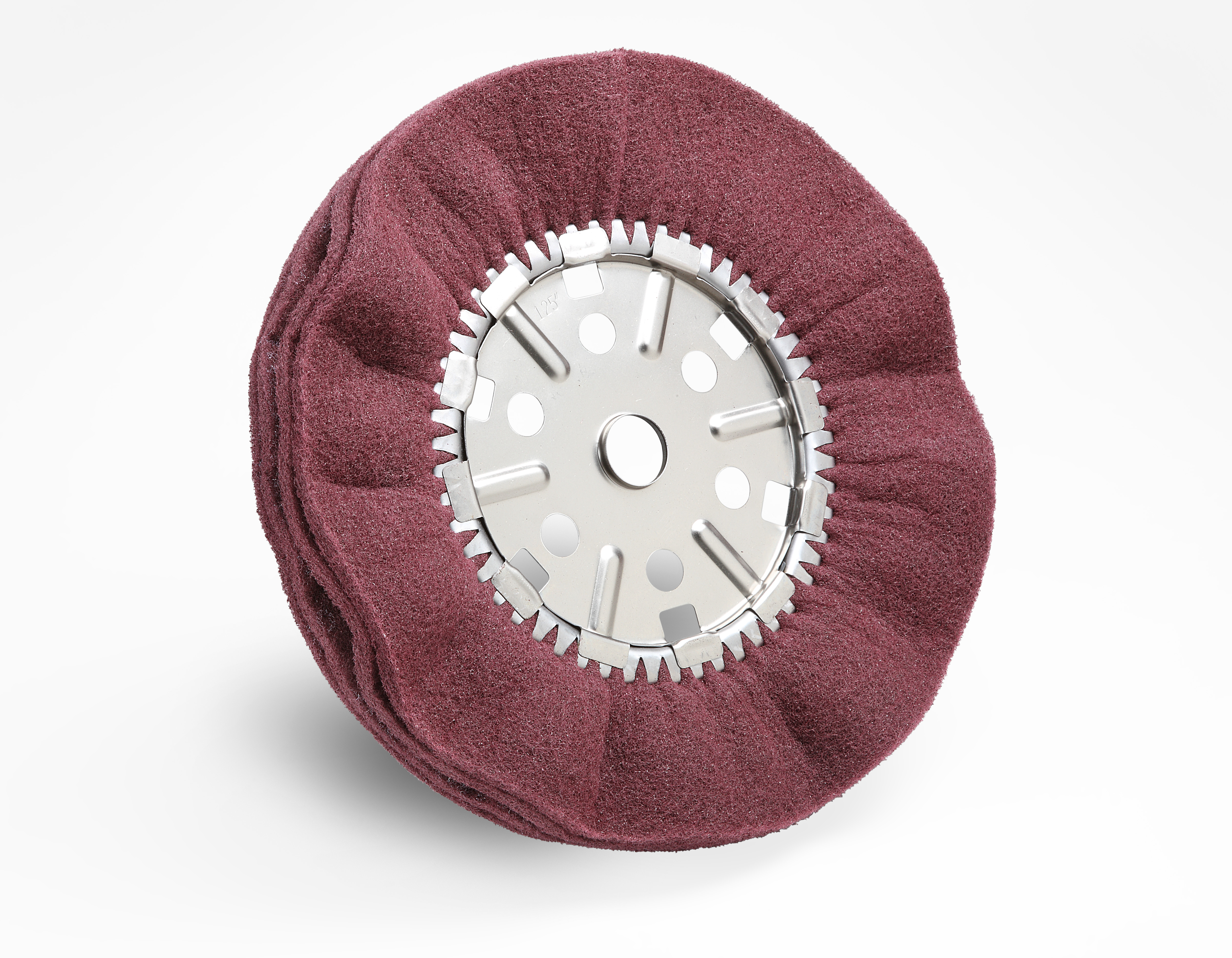 The fibrous layers on the wheel respond to surface irregularities and conform to contours – to help maintain part geometry. Available in fine (FIN) or very fine (VFN) grades, the Scotch-Brite™ Satin Pleated Buff Wheel will deliver a fine satin finish on most metals and is commonly used on builders hardware, such as faucet fixtures.