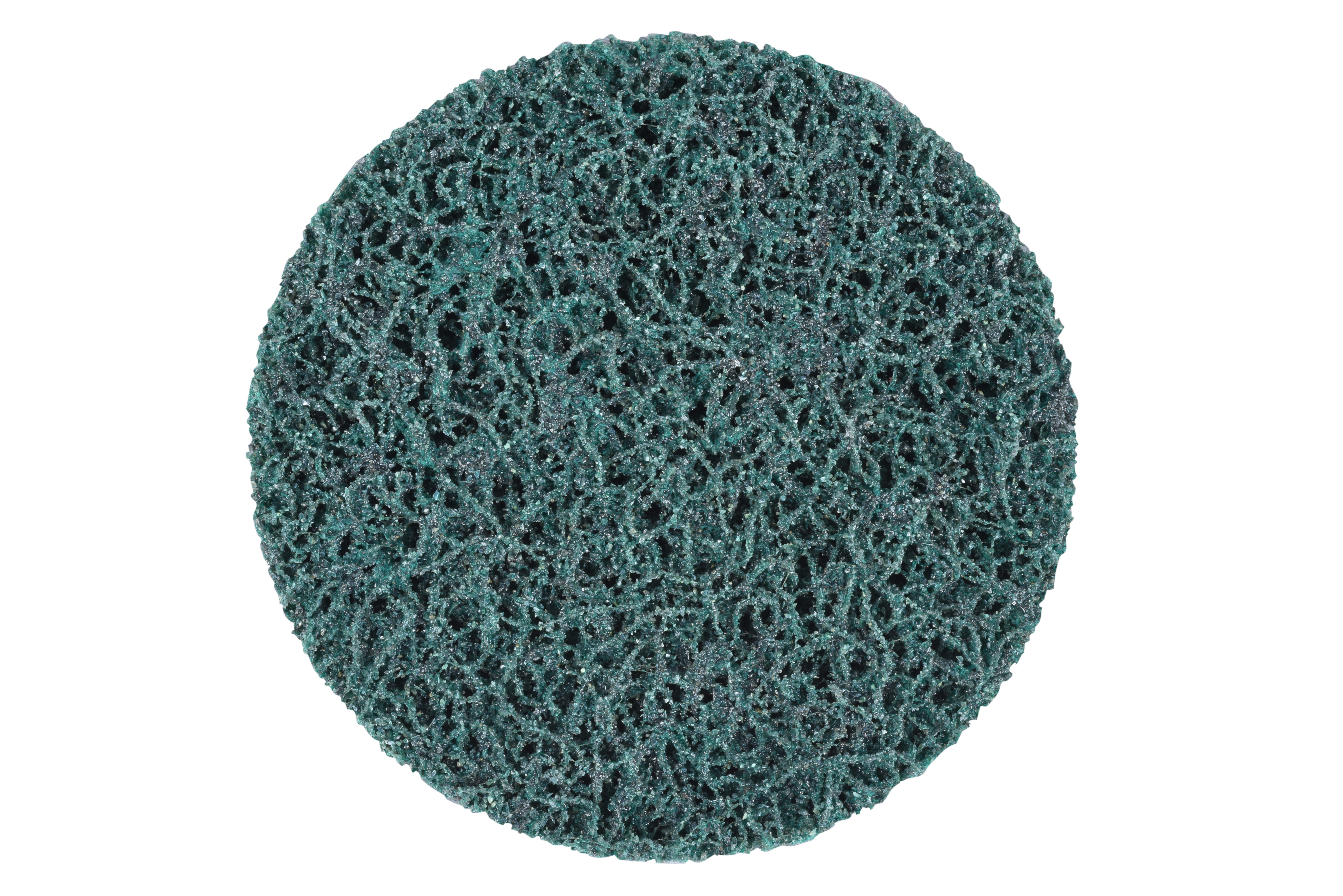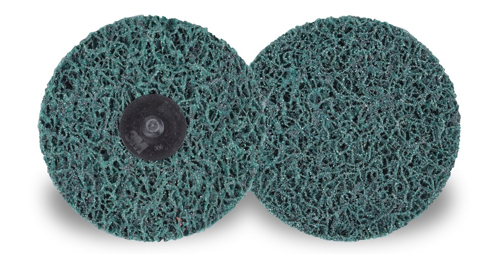 To engineer the Scotch-Brite™ Roloc™ Clean and Strip XT Pro Extra Cut Disc, aluminum oxide mineral is combined with non-woven nylon fibers using resin. Aluminum oxide is a very hard mineral that delivers a high cut rate, commonly used in high-pressure applications like cutting and weld removal. The resin bond strengthens the fiber web and allows it to gradually break down to reveal new fibers and sharp mineral – delivering a consistent cut over the life of the abrasive. The combination of fiber strands, resin and abrasive mineral forms a thick, open web. Gaps in the web allow swarf to escape, minimizing loading of the abrasive.