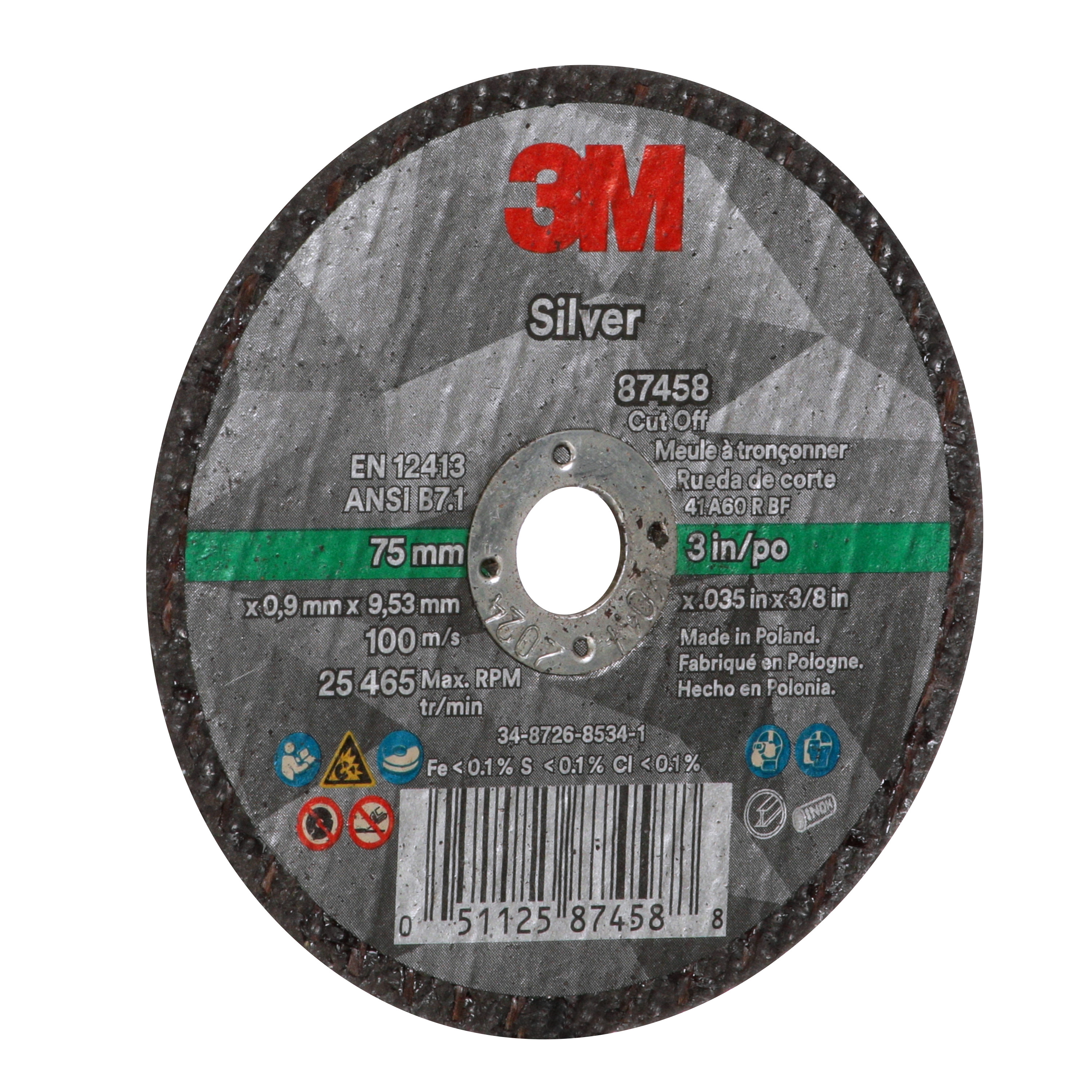 All Products>Abrasives>3M™ Silver Cut-Off Wheel, 87458, 60+, T1, 3 in x 0.035 in x 3/8 in, 50 ea/Case