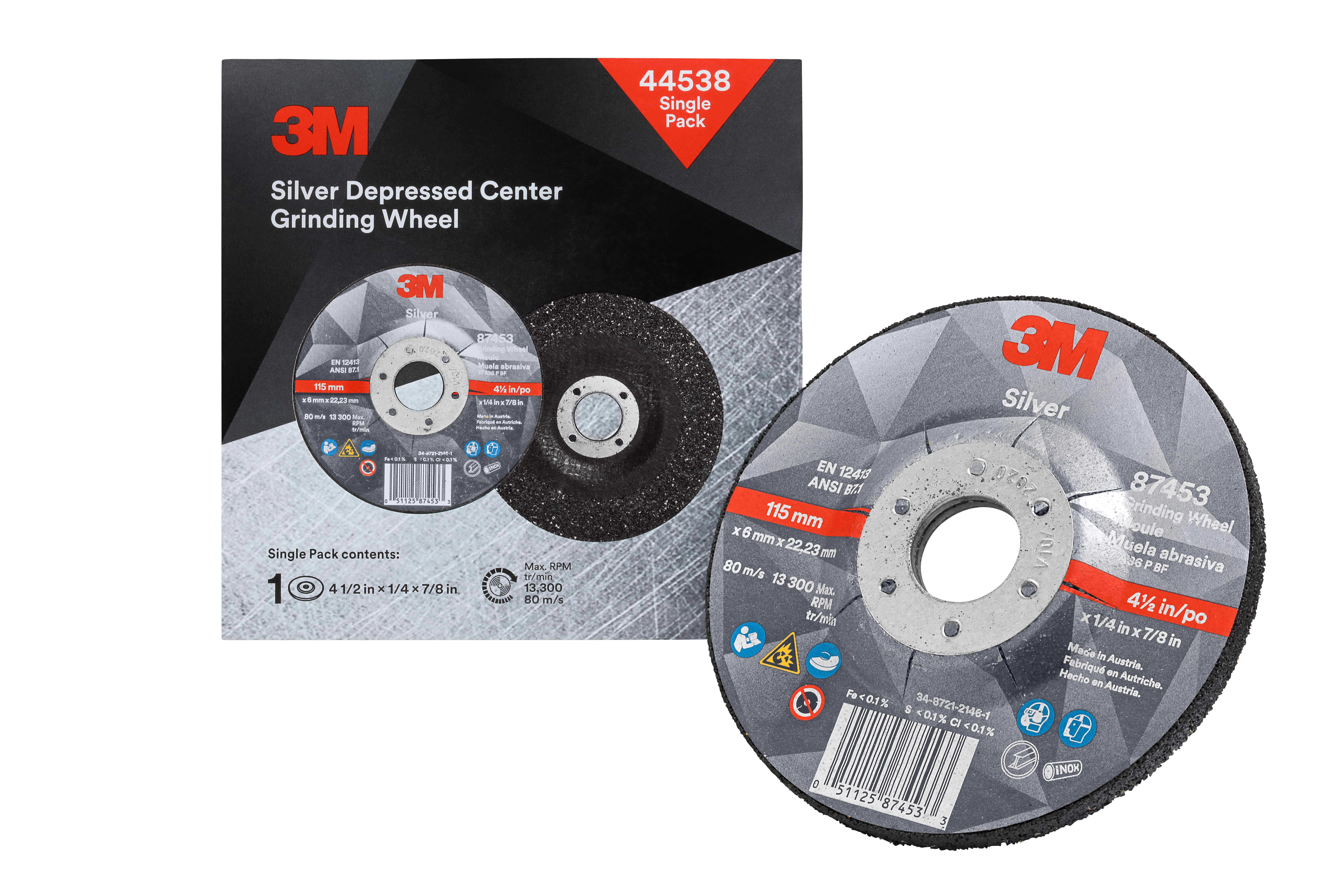 All Products>Abrasives>3M™ Silver Depressed Center Grinding Wheel, 36+, T27 4.5 in x 1/4 in x 7/8 in, Point of Purchase Display, Single Pack, 14/Pac, 1 ea/Case