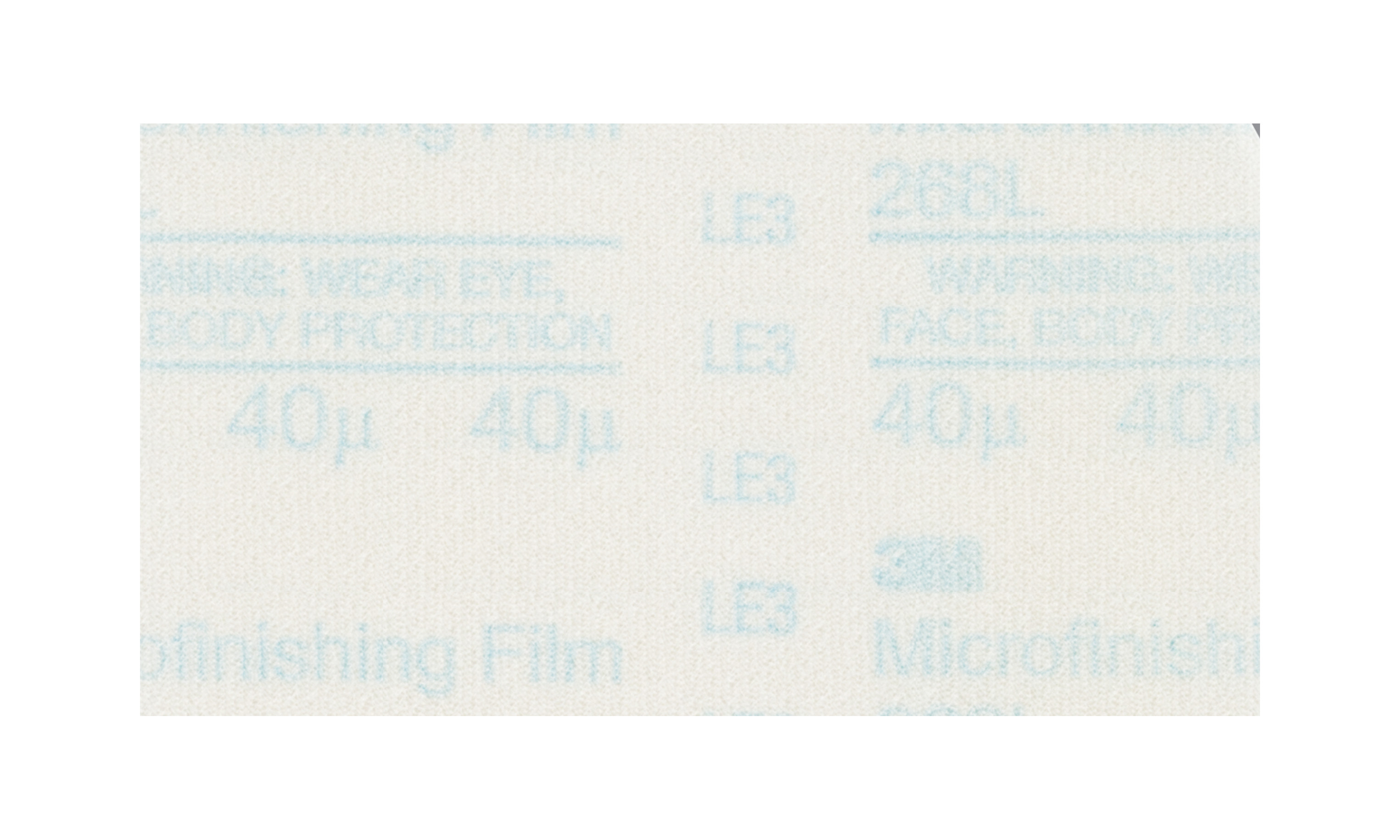 Achieve Close-Tolerance Finishes 3M™ Microfinishing PSA Film Sheet 268L features precision, micron-graded aluminum oxide, resin-bonded to a high-strength, resilient polyester film backing to produce a fast cut-rate and precise, uniform finish on wood, solid surface composites, plastic, fiberglass, metals and paint preparation. The film backing offers great flexibility without sacrificing the durability and reliable performance of the sheet. To complement the effective abrasive action, the polyester film backing flexes to help achieve a consistent finish over contours and offers greater tear-resistance than comparable paper products, making it ideal for high-production environments.