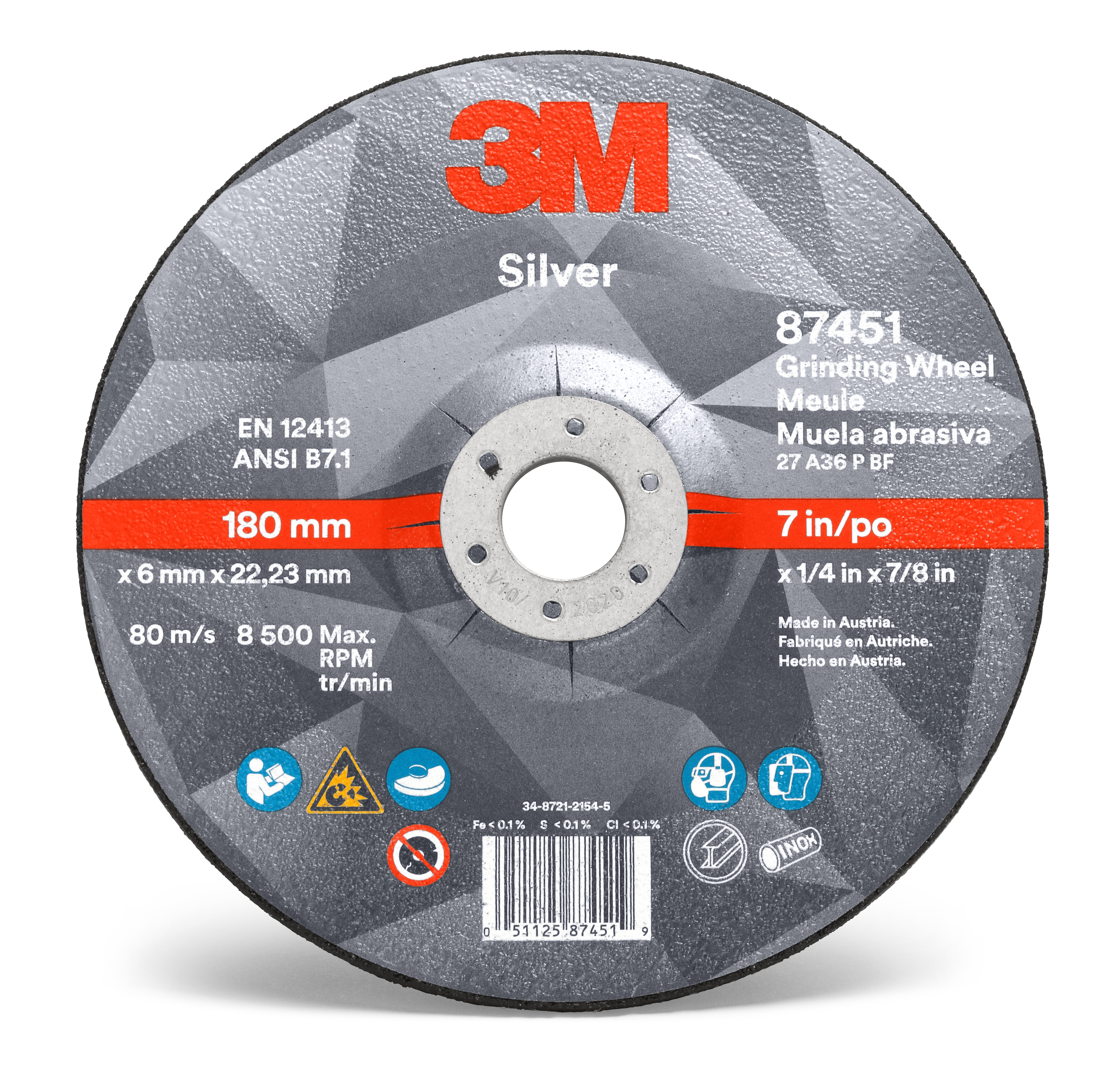 Discover the benefits of a long-lasting, value-priced grinding wheel. The 3M Silver Depressed Center Grinding Wheel is a type 27 bonded grinding wheel designed to deliver an unbeatable combination of performance and value. These long-lasting wheels use 3M Precision-Shaped Grain to deliver a fast and consistent cut during grinding and heavy stock removal on stainless steel, mild steel, aerospace alloys and more. This ceramic grain lasts exceptionally long, continuously fracturing into super-sharp points and edges that slice cleanly through metal. 3M Silver Grinding Wheels last significantly longer than grinding wheels made with conventional ceramic grain, while maintaining a high cut-rate through the life of the wheel. These 7-inch grinding wheels are suitable for use with either an electric or pneumatic angle grinder. As part of the 3M Advanced Series of abrasives, 3M Silver Depressed Center Grinding Wheels are engineered to deliver high performance at a budget-friendly price. They easily handle heavy grinding tasks like weld grinding, beveling, slag removal and edge work with either pneumatic or electric tools.