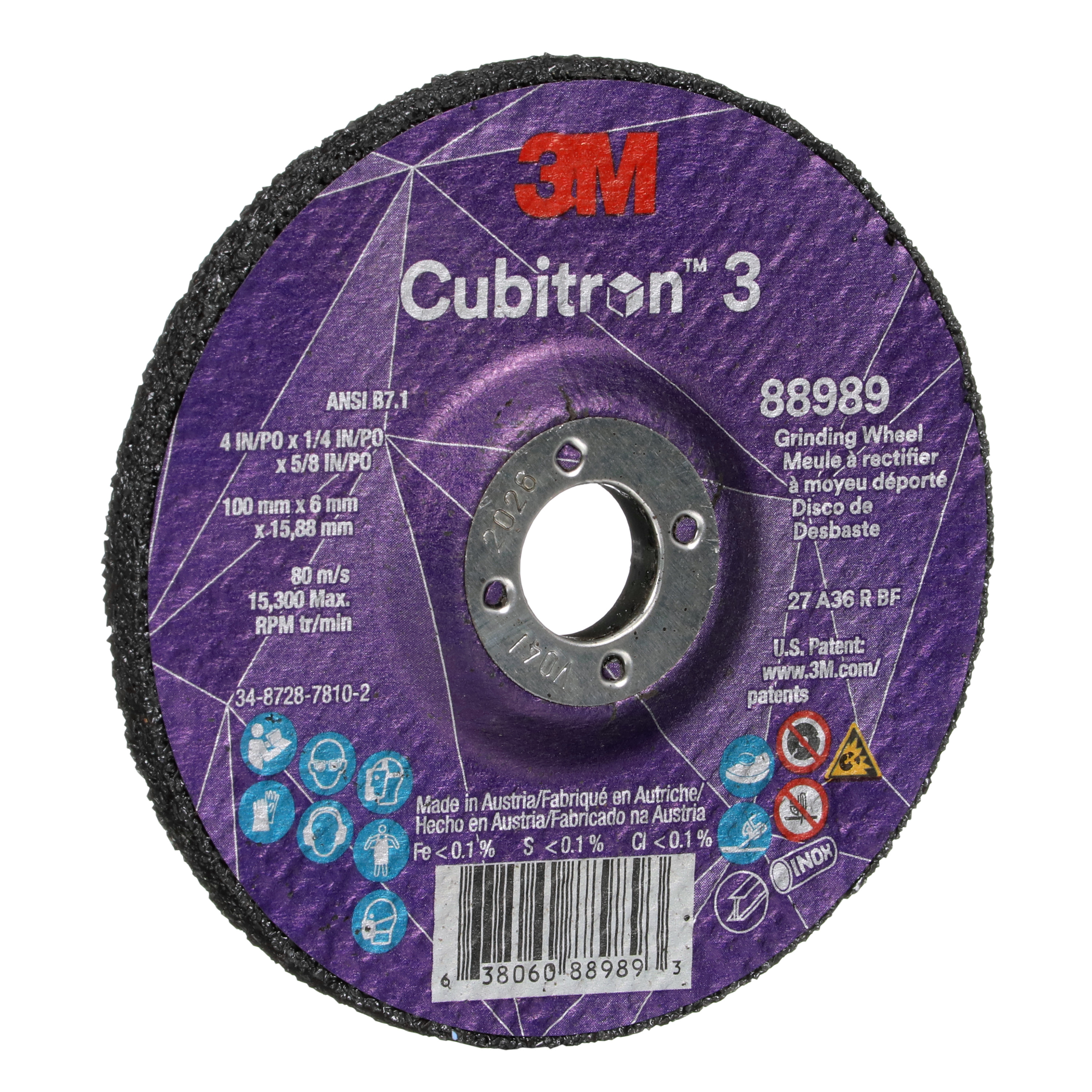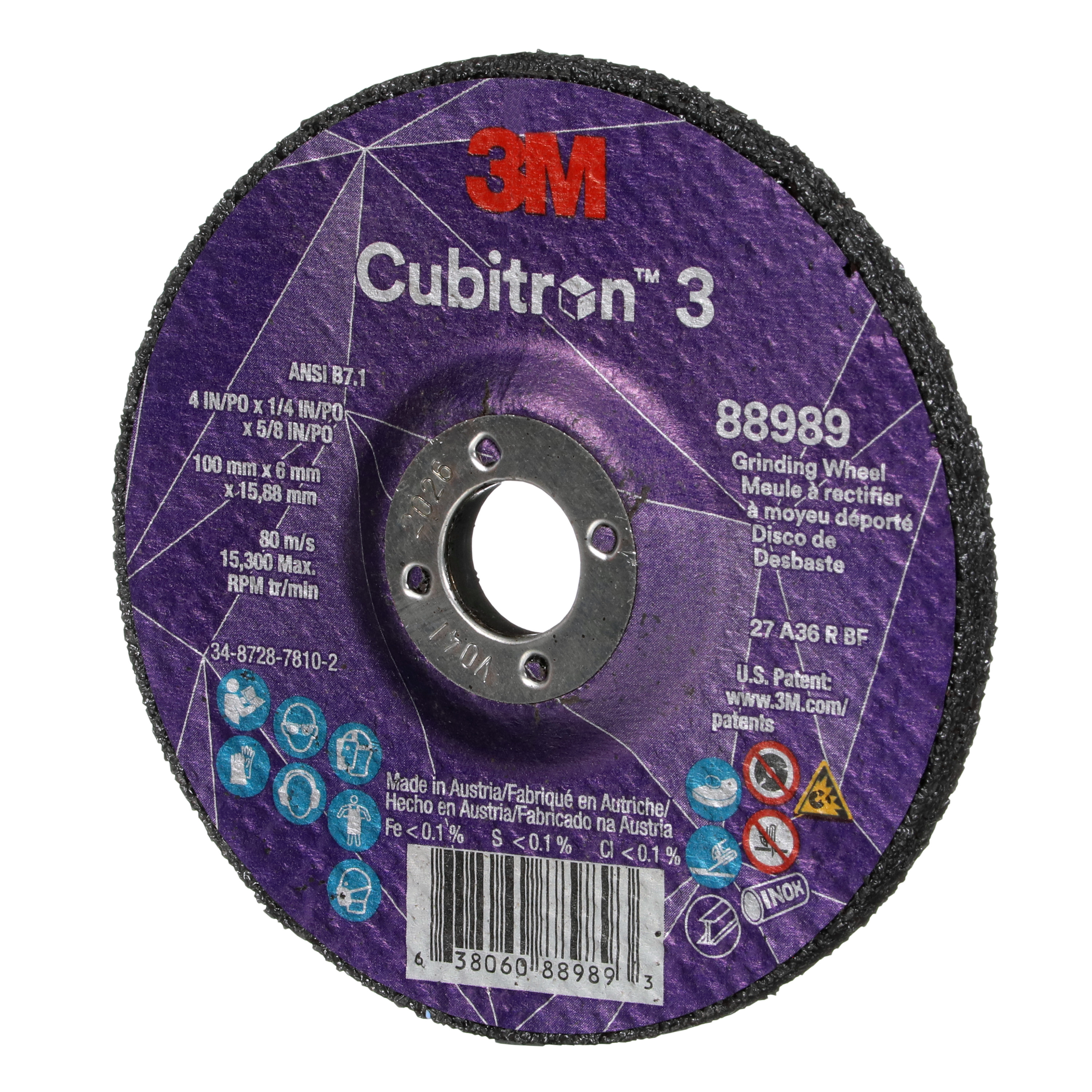 All Products>Brand>3M>Cubitron>3M™ Cubitron™ 3 Depressed Center Grinding Wheel, 88989, 36+, T27, 4 in x 1/4 in x 5/8 in (100x6x15.88mm) ANSI, 10/Pack, 20 ea/Case