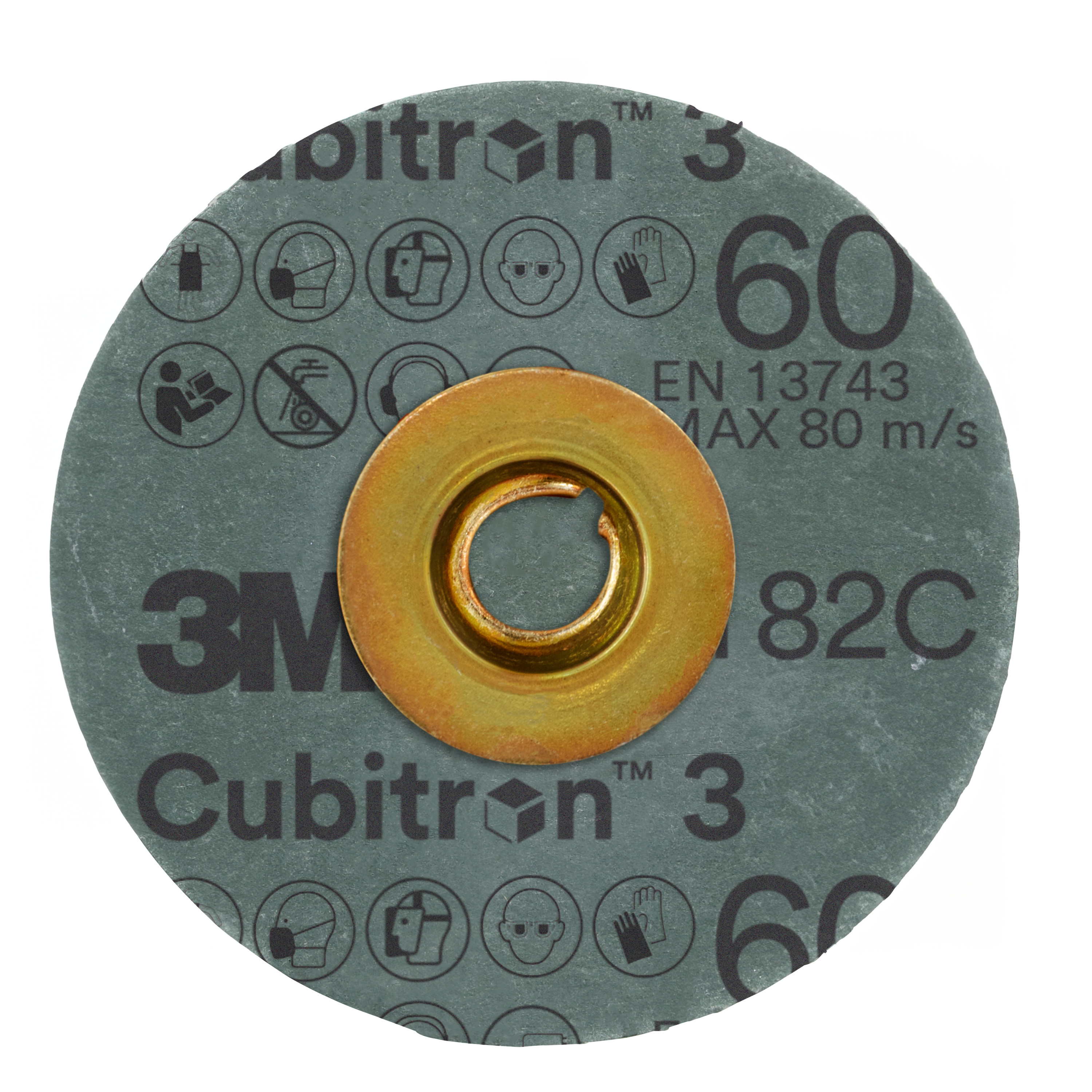 The 3M™ Cubitron™ 3 Roloc™ Fibre Disc 1182C is engineered to help operators take on a variety of tasks with less fatigue. This is made possible through this disc's exceptionally high cut rate that requires less pressure than conventional abrasives. This disc's stiff fiber backing and strong resin bond provide durability and tear resistance to help ensure operators can work on medium to high-pressure grinding projects — jobs made even easier thanks to re-engineered 3M Precision-Shaped Grain, which slices cleanly through metal, wears evenly, and continuously self-sharpens as the points break off.