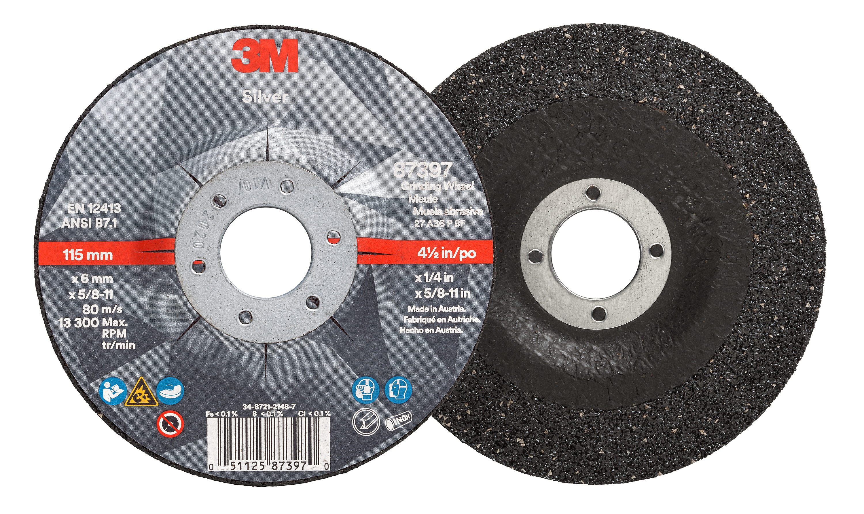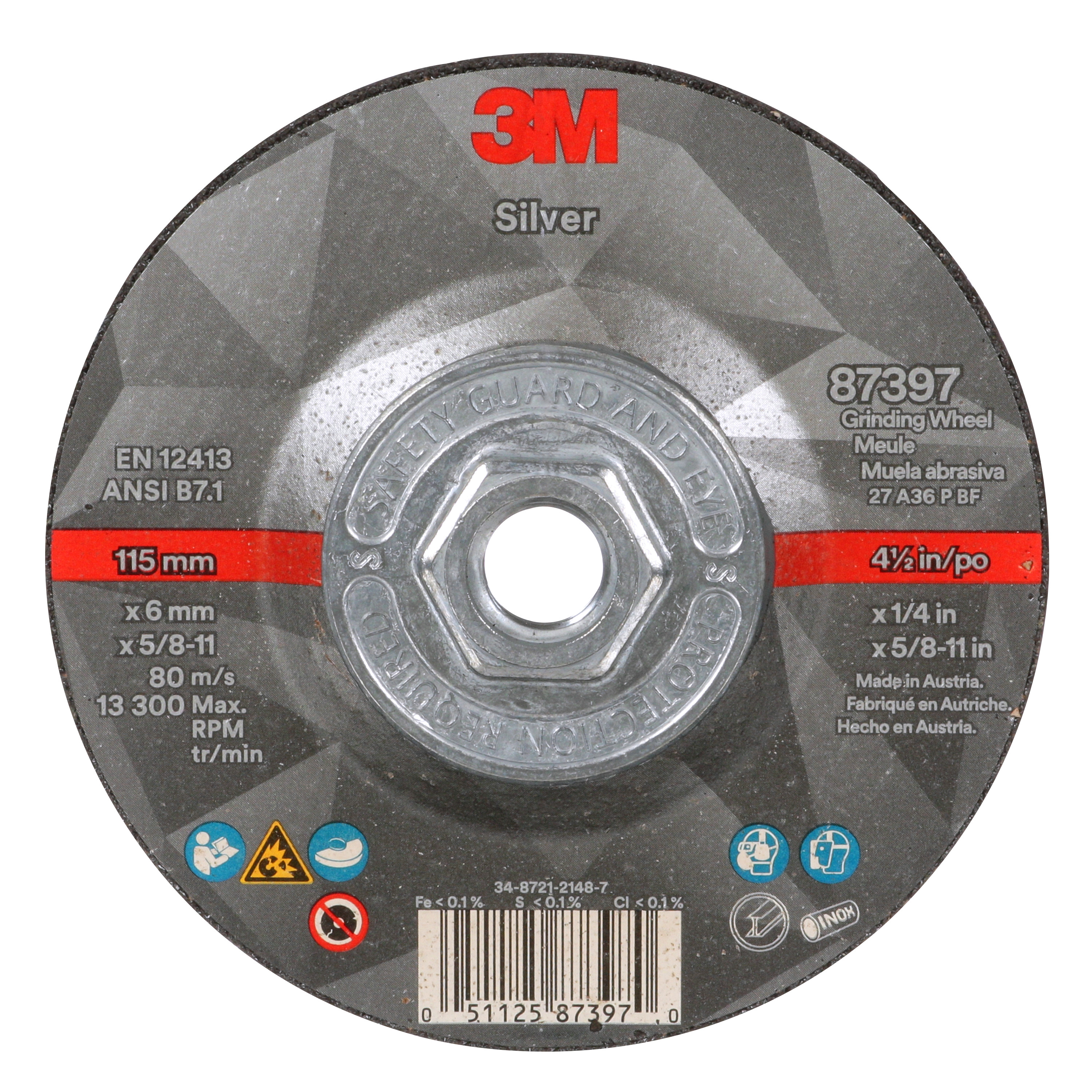 All Products>Abrasives>3M™ Silver Depressed Center Grinding Wheel, 87397, 36+, T27 Quick Change, 4.5 in x 1/4 in x 5/8 in-11, 10/Carton, 20 ea/Case