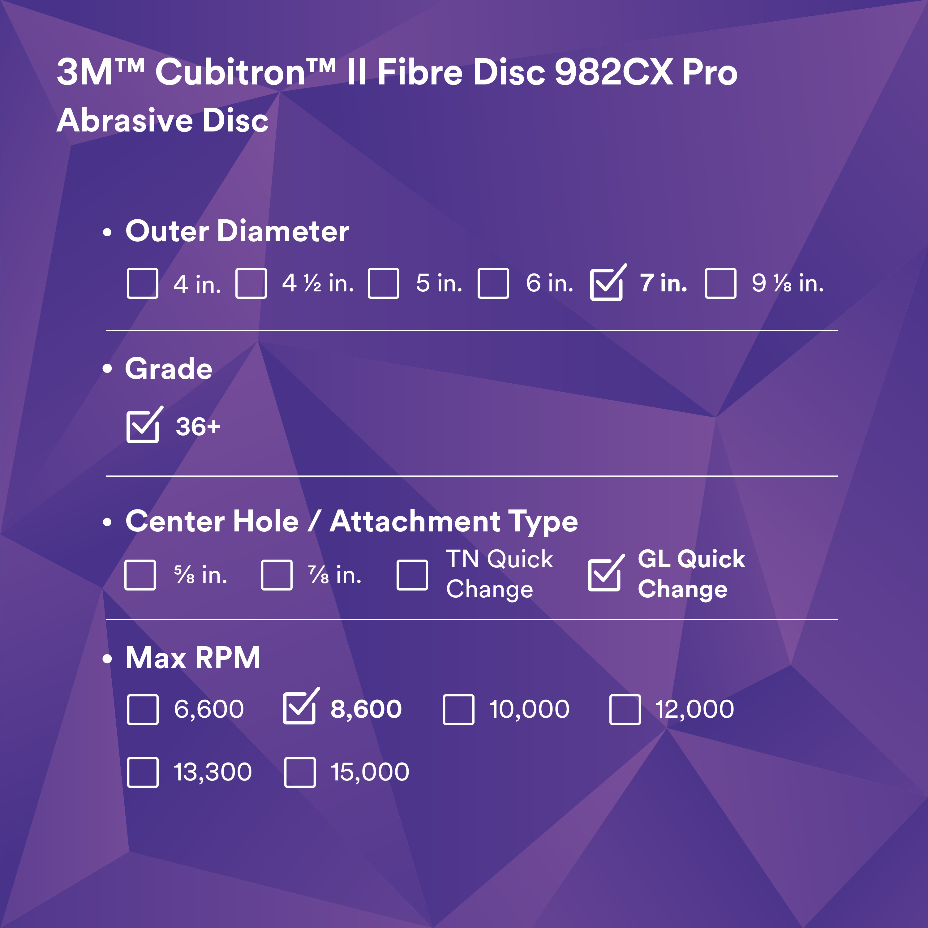 3M™ Cubitron™ II Fibre Disc 982CX Pro, 36+, GL Quick Change, 7 in, Die G700BB, 25/Bag, 100 ea/Case