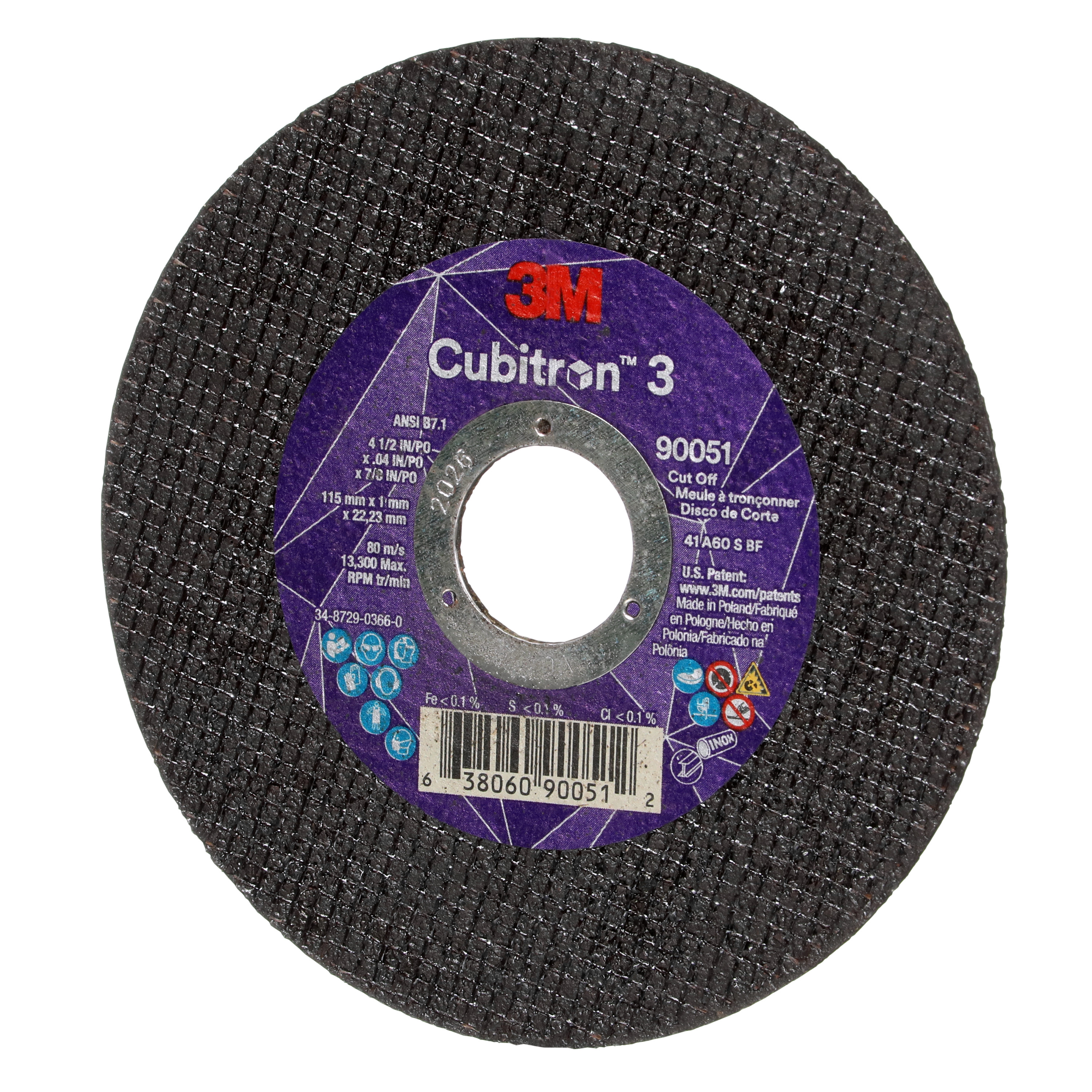 All Products>Abrasives>3M™ Cubitron™ 3 Cut-Off Wheel, 90051, 60+, T1, 4-1/2 in x 0.04 in x 7/8 in (115 x 1 x 22.23 mm), ANSI, 25/Pack, 50 ea/Case