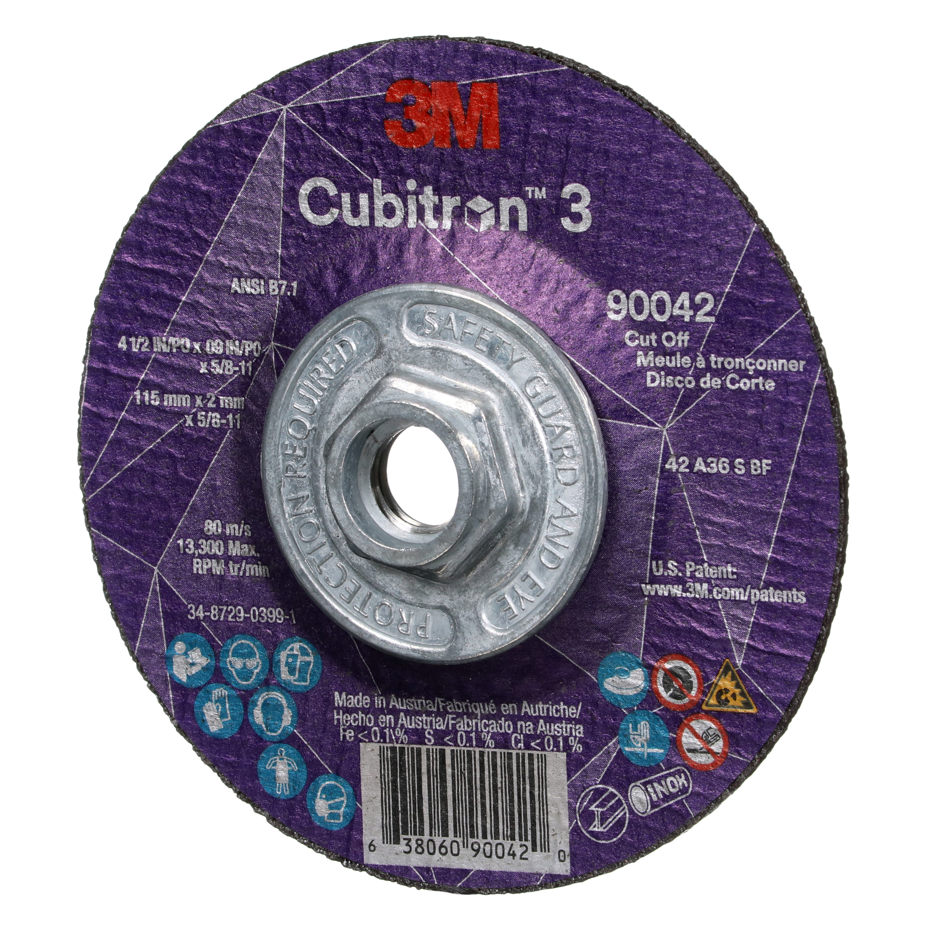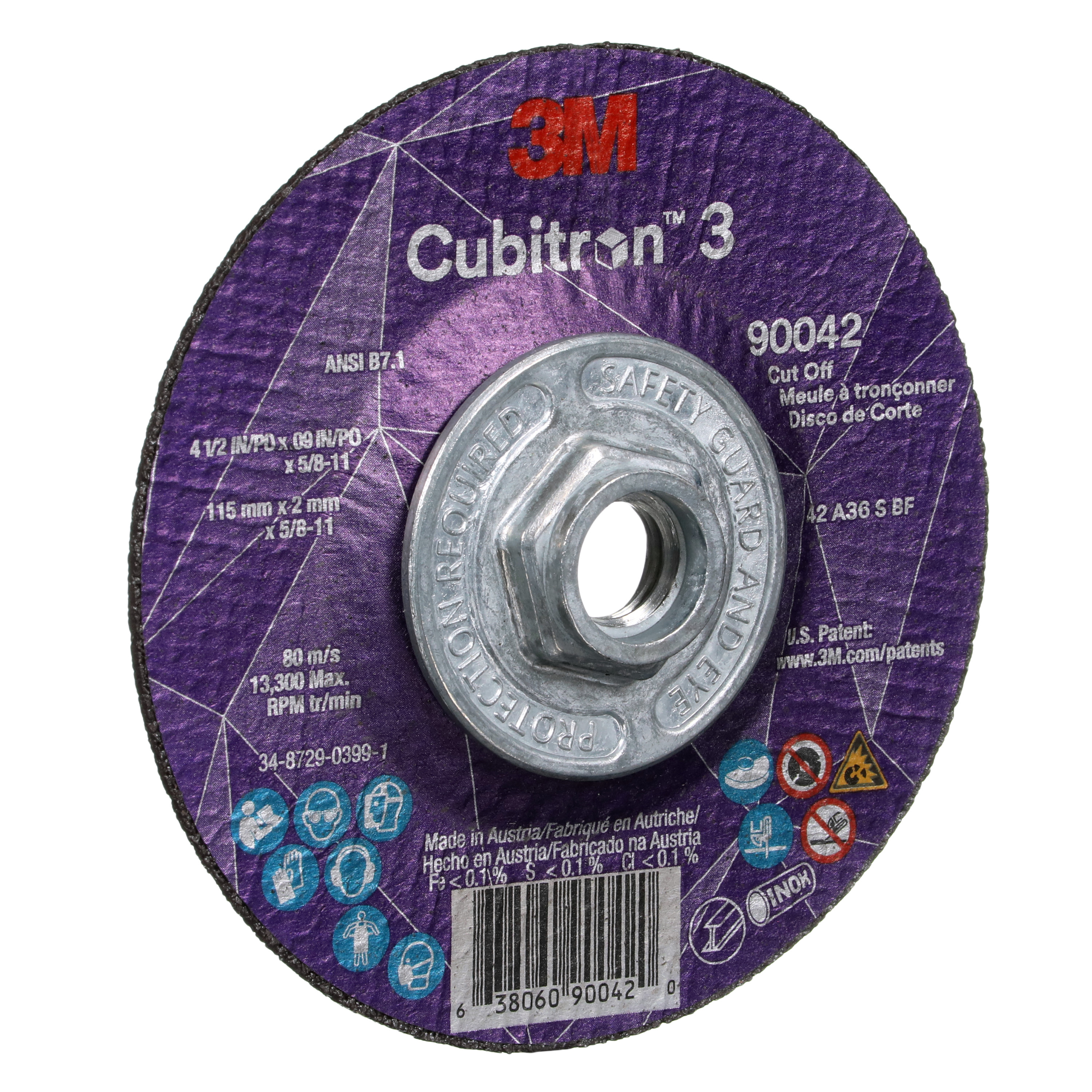 All Products>Abrasives>3M™ Cubitron™ 3 Cut-Off Wheel, 90042, 36+, T27, 4-1/2 in x 0.09 in x 5/8 in-11 (115 x 2 mm x 5/8-11 in), ANSI, 10 ea/Case