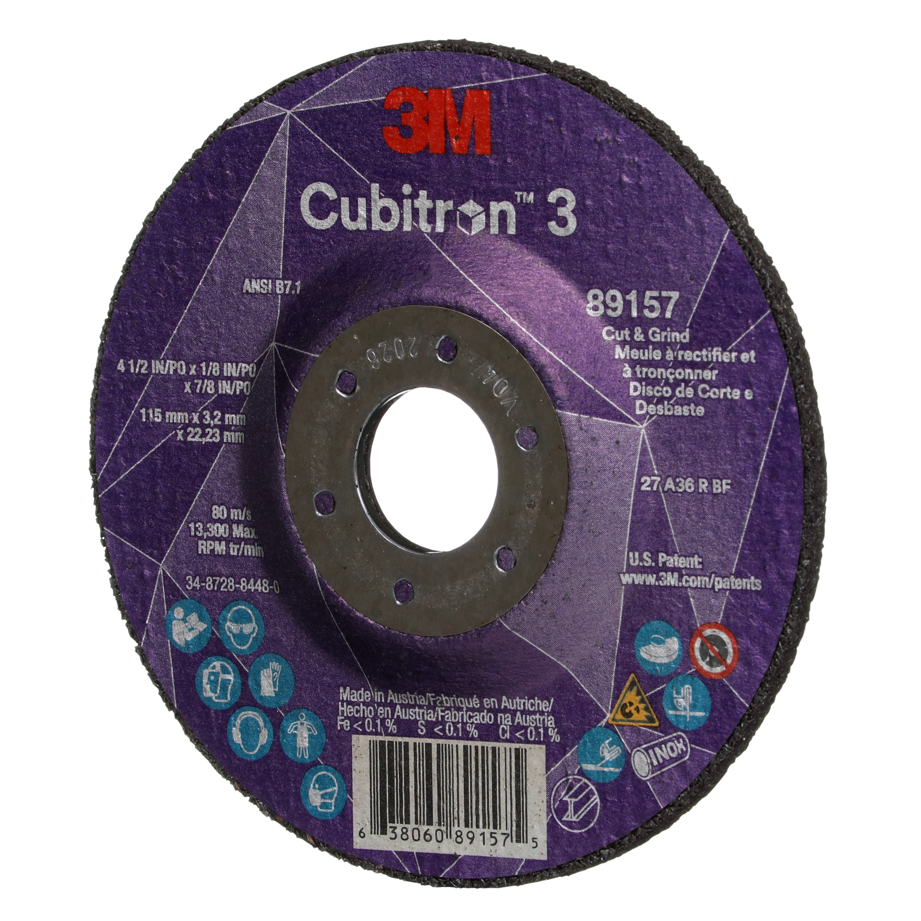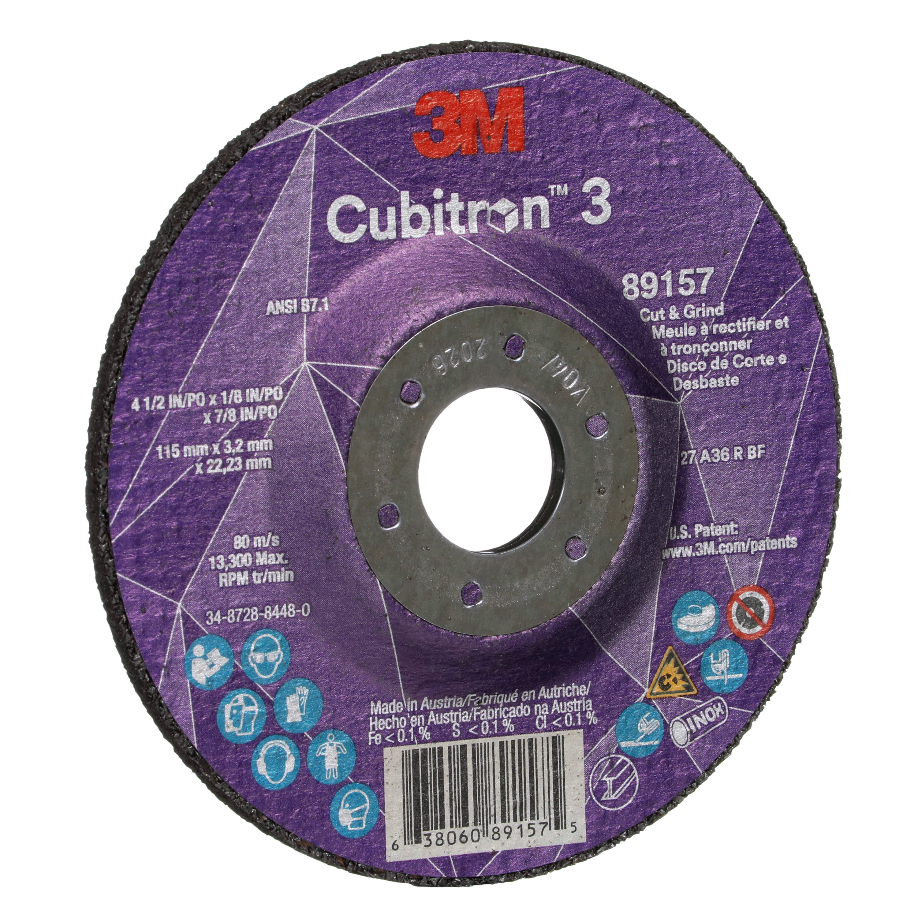 All Products>Abrasives>3M™ Cubitron™ 3 Cut and Grind Wheel, 89157, 36+, T27, 4-1/2 in x 1/8 in x 7/8 in (115 x 3.2 x 22.23 mm), ANSI, 10/Pack, 20 ea/Case