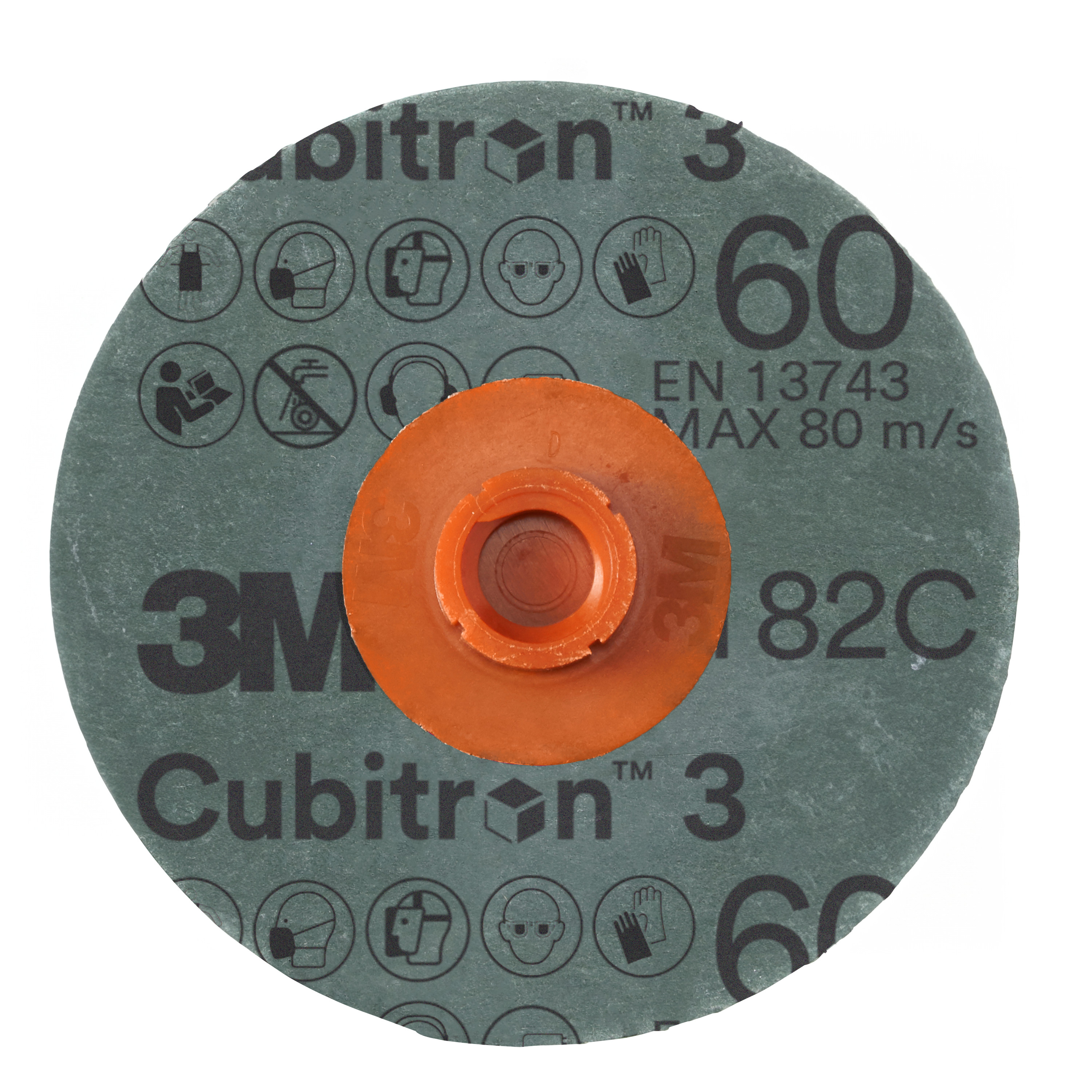 The 3M™ Cubitron™ 3 Roloc™ Fibre Disc 1182C is engineered to help operators take on a variety of tasks with less fatigue. This is made possible through this disc's exceptionally high cut rate that requires less pressure than conventional abrasives. This disc's stiff fiber backing and strong resin bond provide durability and tear resistance to help ensure operators can work on medium to high-pressure grinding projects — jobs made even easier thanks to re-engineered 3M Precision-Shaped Grain, which slices cleanly through metal, wears evenly, and continuously self-sharpens as the points break off.