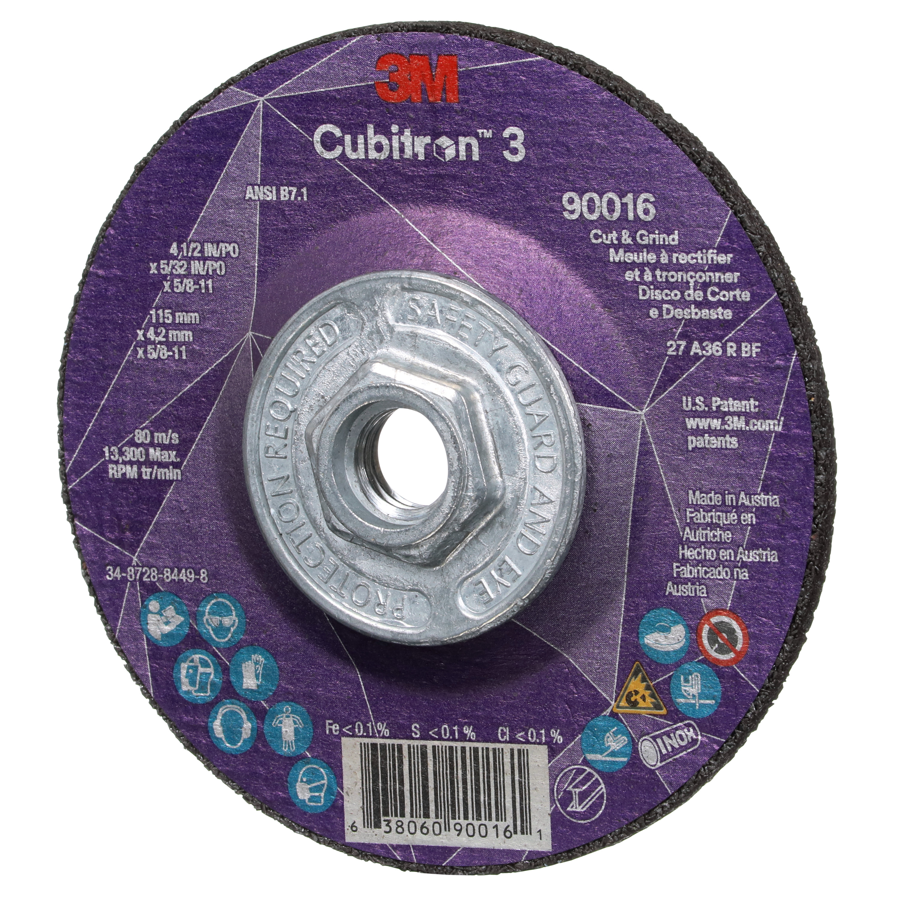 All Products>Abrasives>3M™ Cubitron™ 3 Cut and Grind Wheel, 90016, 36+, T27, 4-1/2 in x 5/32 in x 5/8 in-11 (115 x 4.2 mm x 5/8-11 in), ANSI, 10 ea/Case