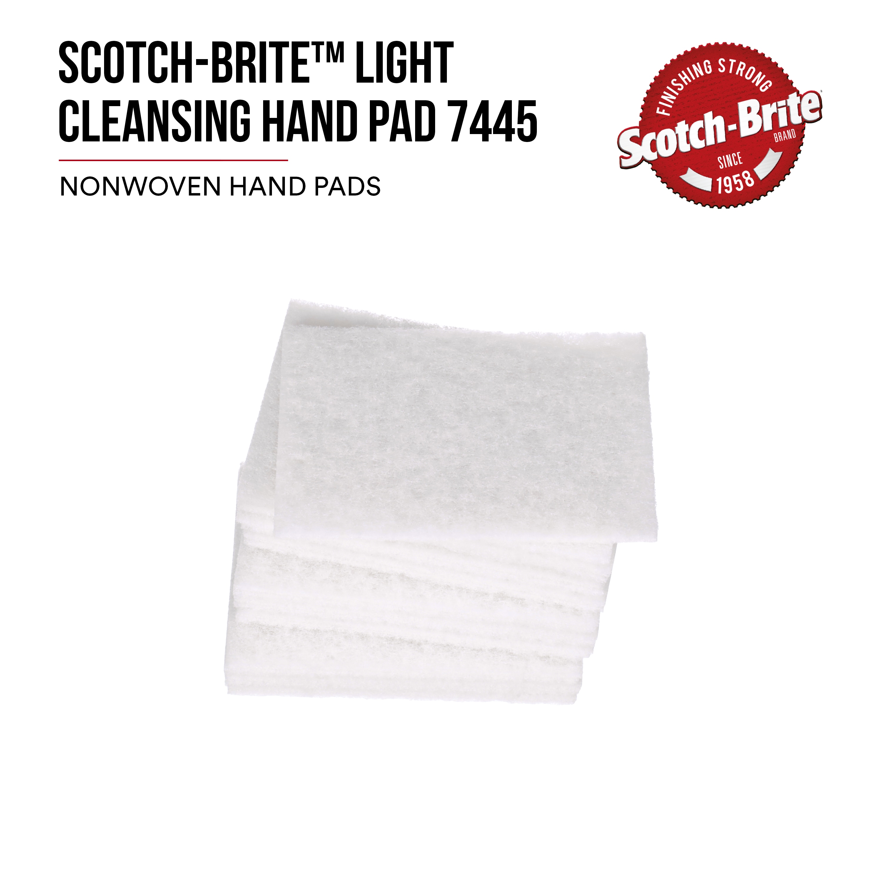 All Products>Abrasives>Scotch-Brite™ Light Cleansing Hand Pad 7445B, HP-HP, Nepheline Syenite Super Fine, White, 6 in x 9 in, 60 ea/Case, Bulk