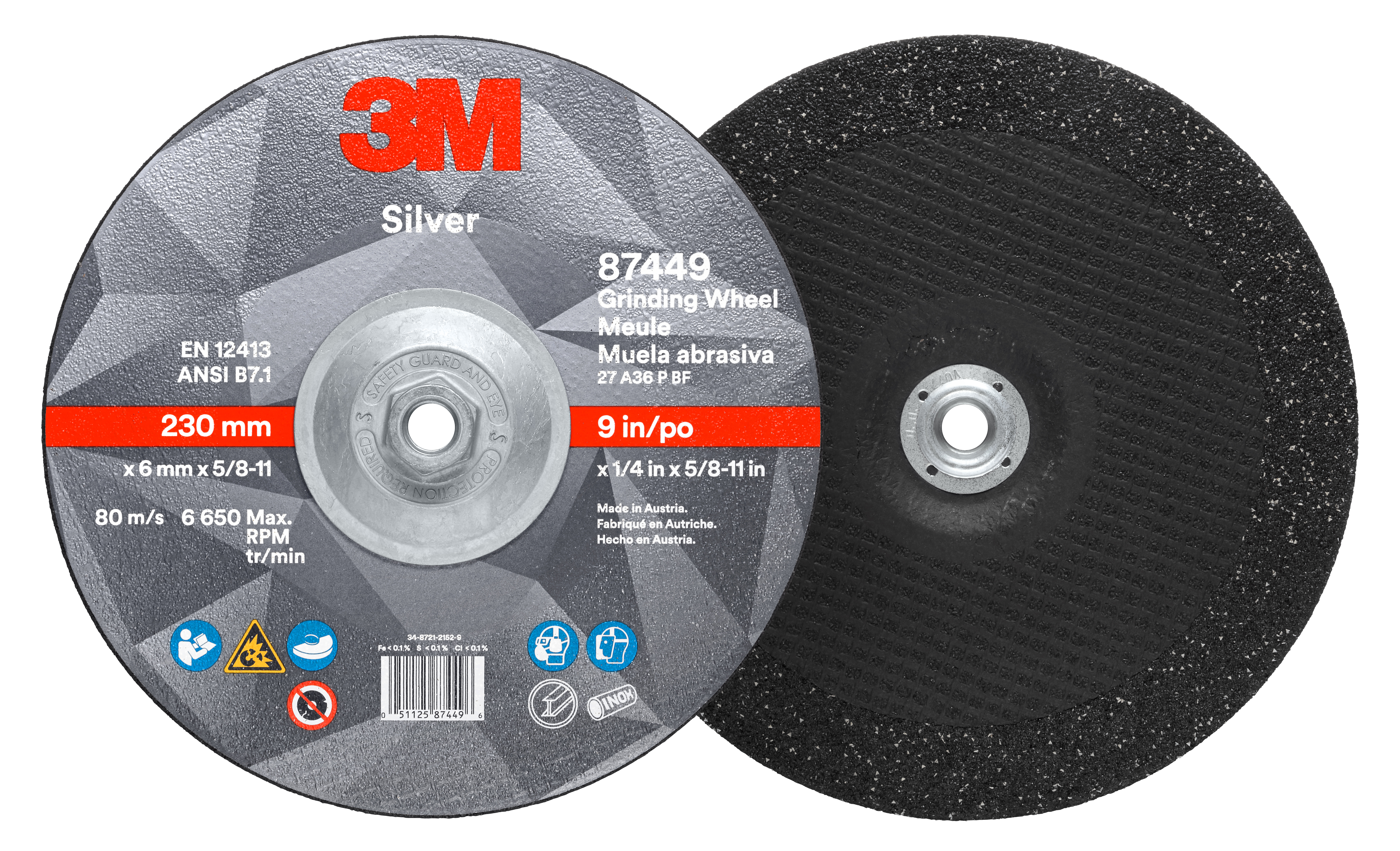 All Products>Abrasives>3M™ Silver Depressed Center Grinding Wheel, 87449, 36+, T27 Quick Change, 9 in x 1/4 in x 5/8 in-11, 10/Carton, 20 ea/Case