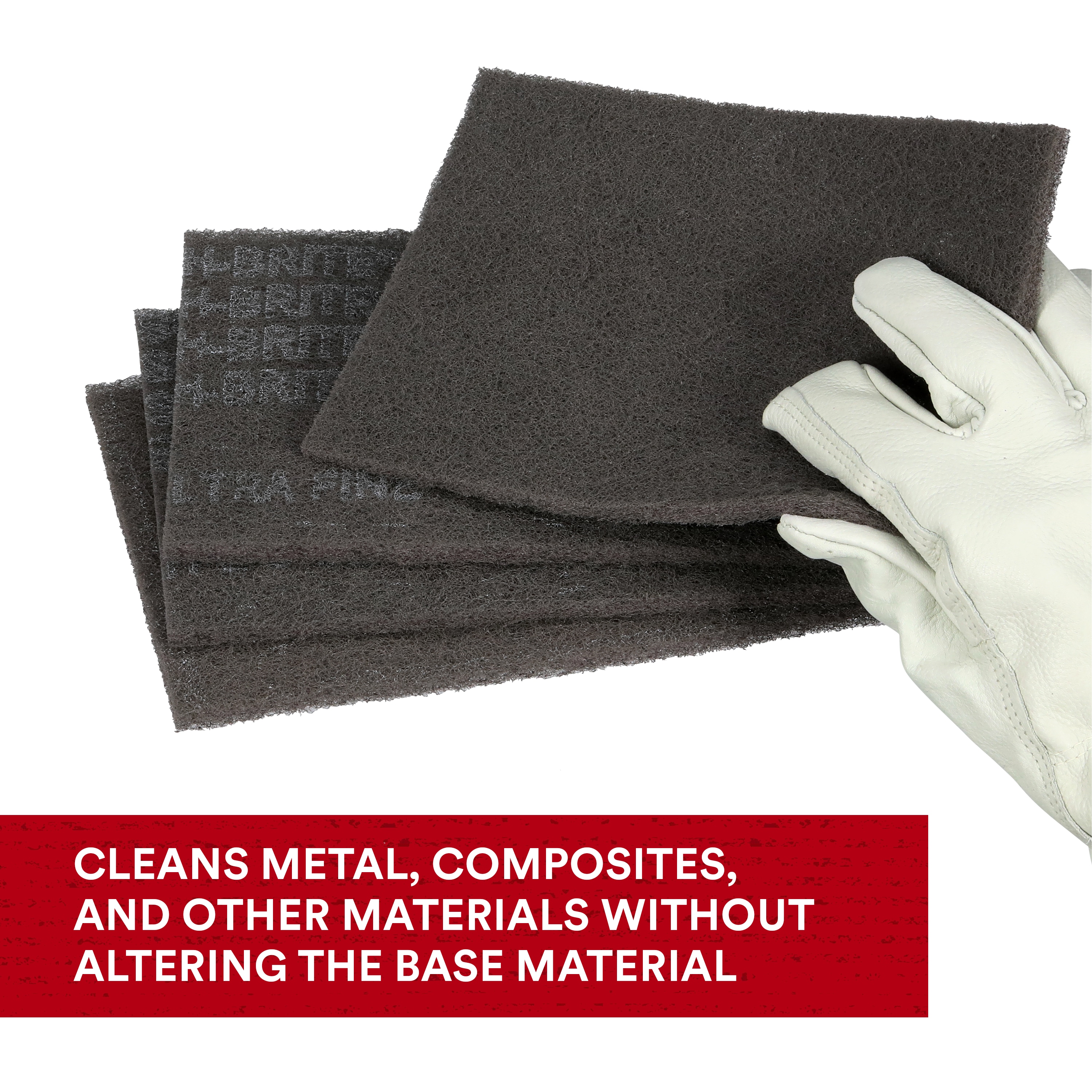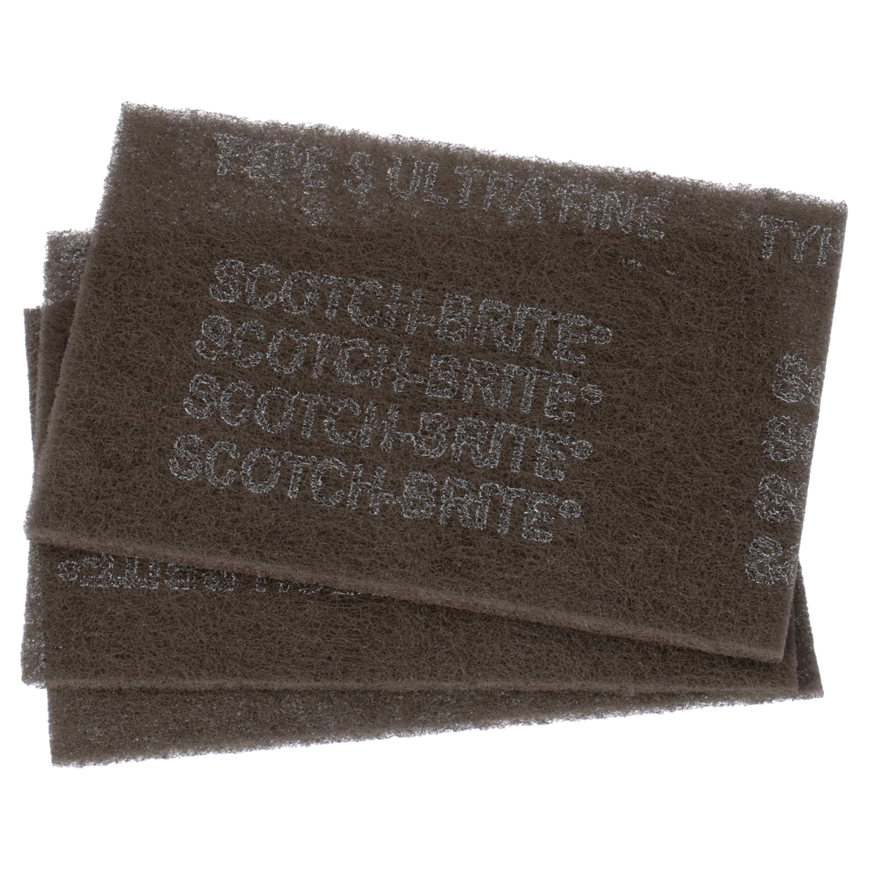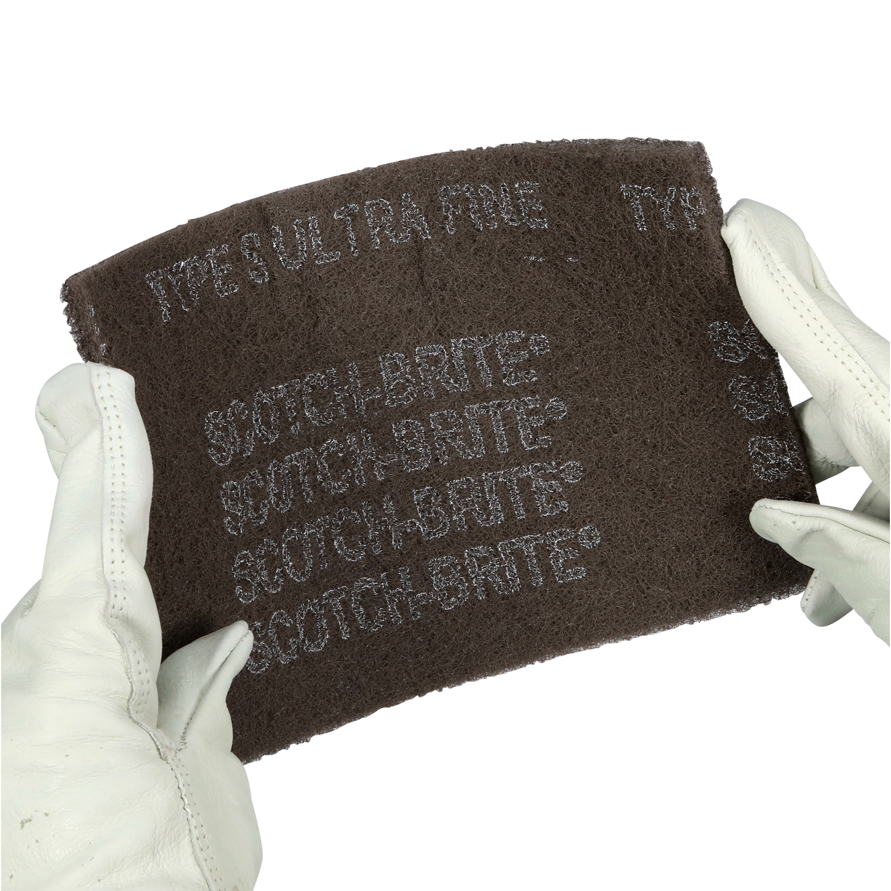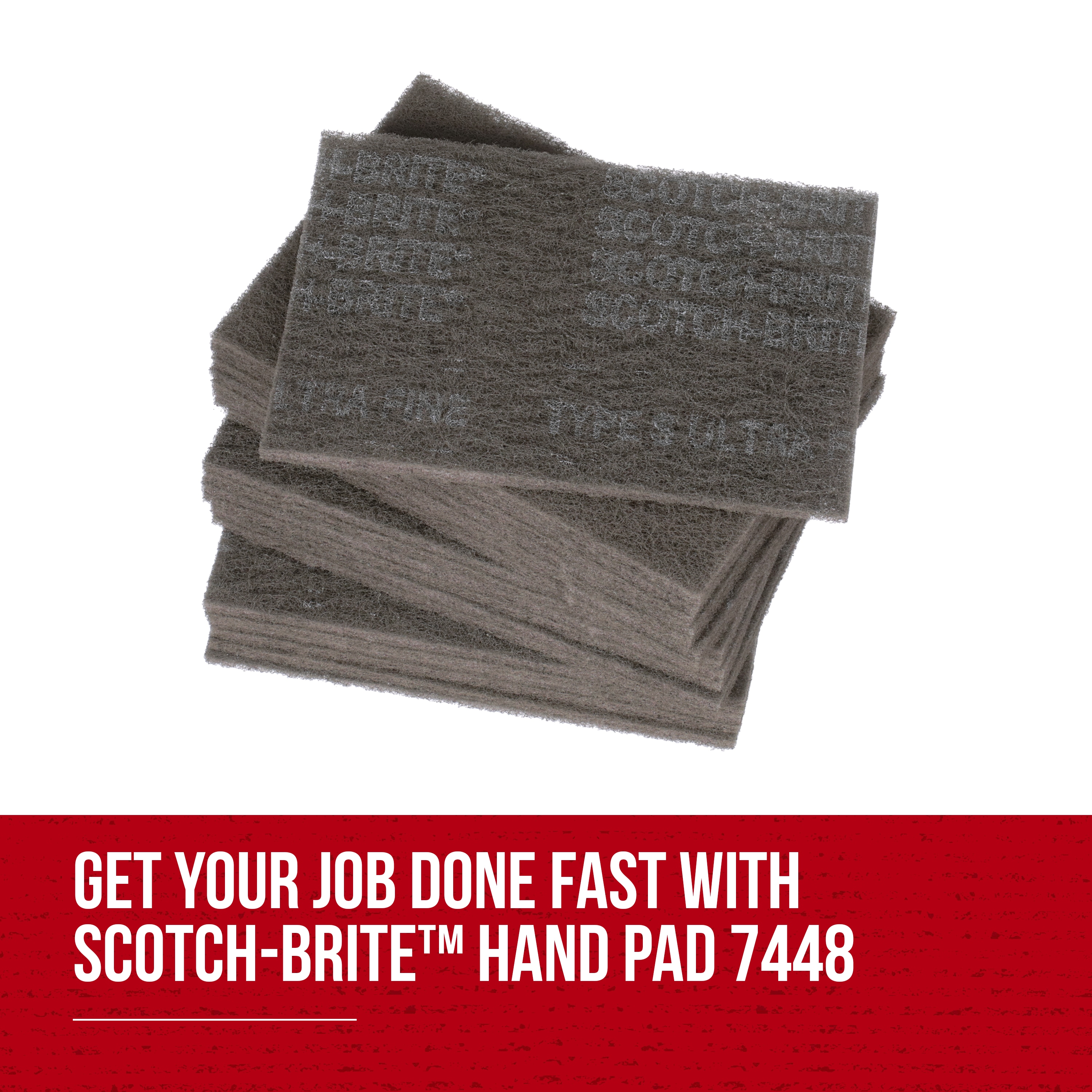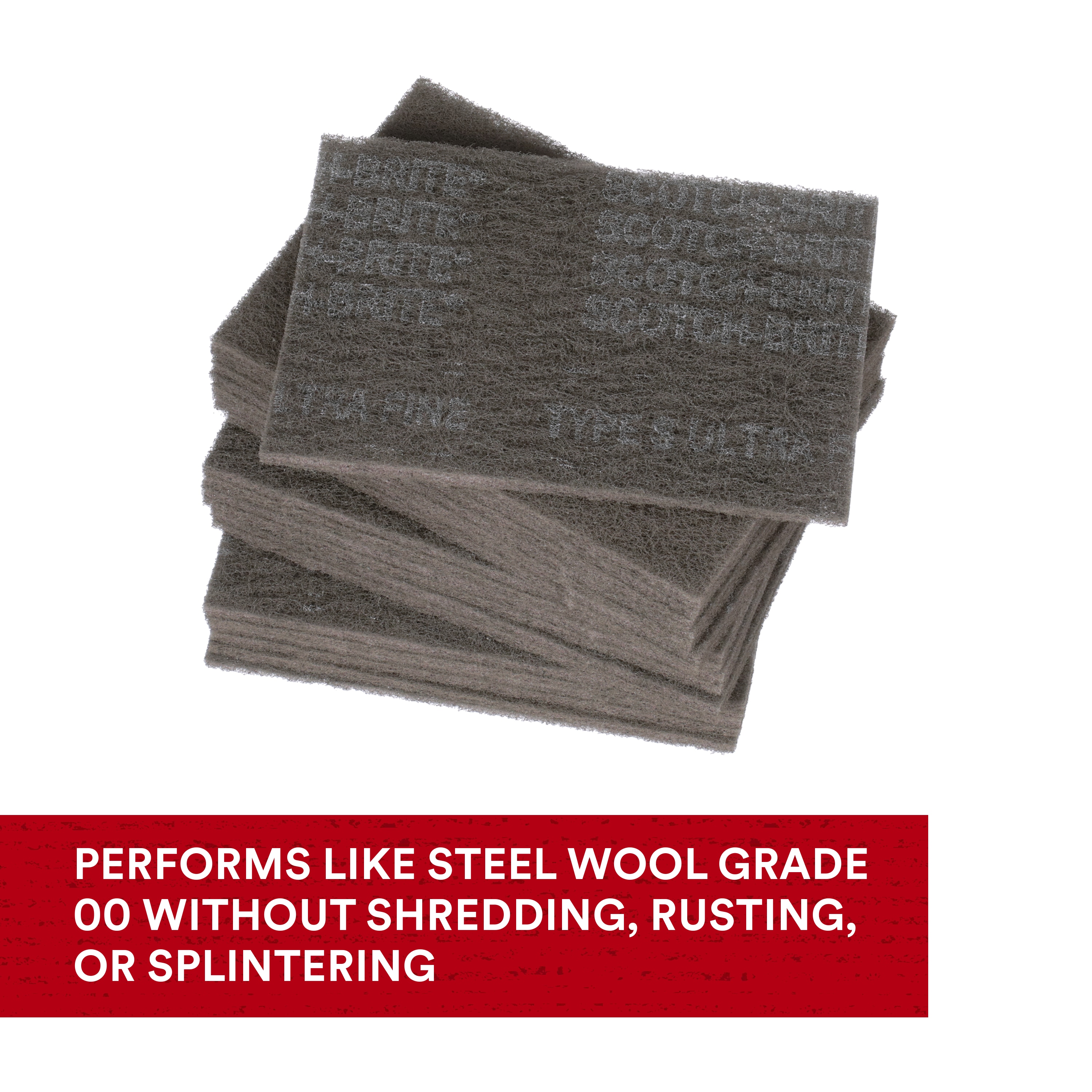 The Scotch-Brite™ Ultra Fine Pro Hand Pad 7448 combines durability for long life, flexibility for reaching tight areas, and can be used in place of steel wool for conditioning metal surfaces and paint prep. Unlike fine steel wool, Scotch-Brite pads will not shred during use, rust after use, or leave fine metal splinters.