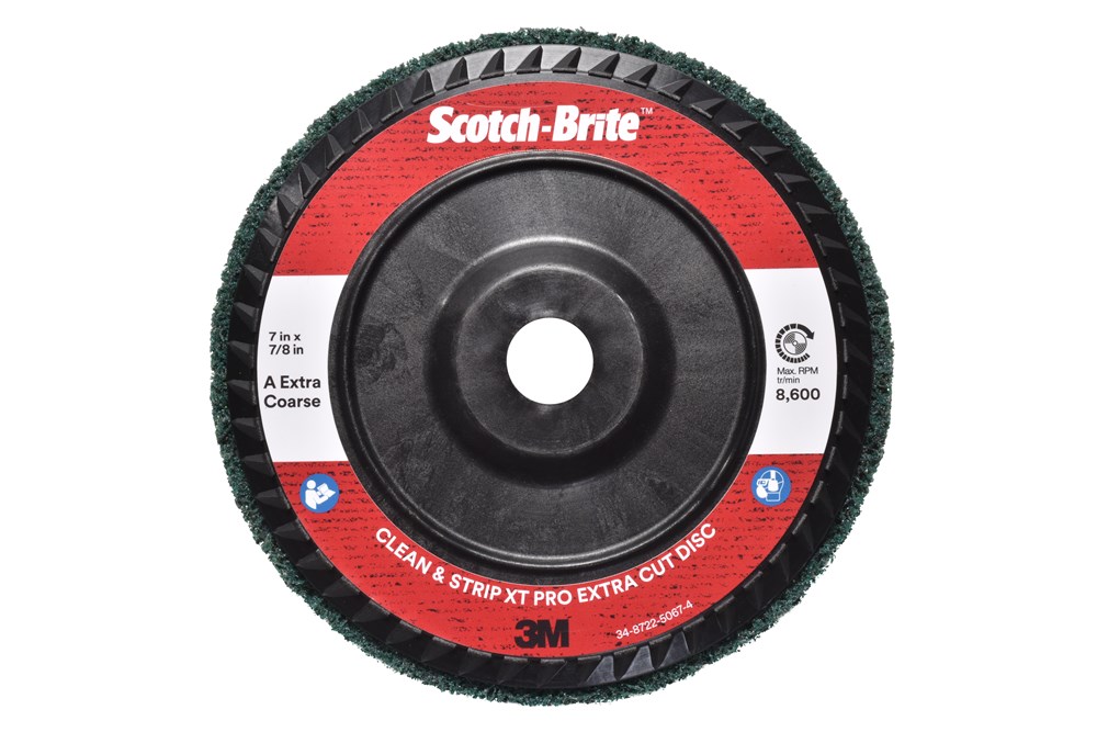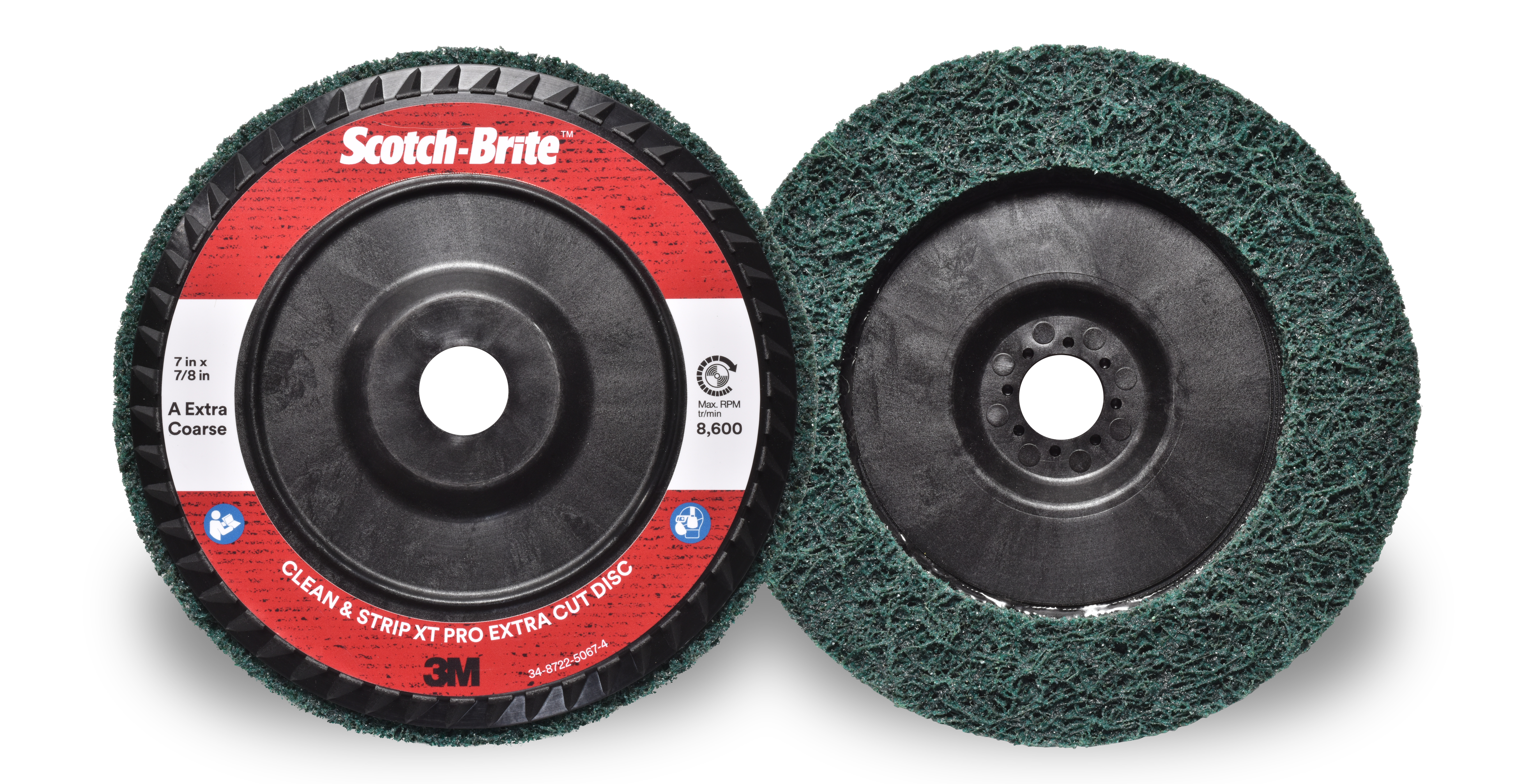 3M designed the Scotch-Brite™ Clean and Strip XT Pro Extra Cut Disc with aluminum oxide abrasive mineral because of its ability to remove heavy coatings and simultaneously scratch and clean to the bare metal underneath without leaving divots. This means that operators can remove a coating from a workpiece and get it ready for welding or adhesive application with the same disc – saving the time of switching abrasives.