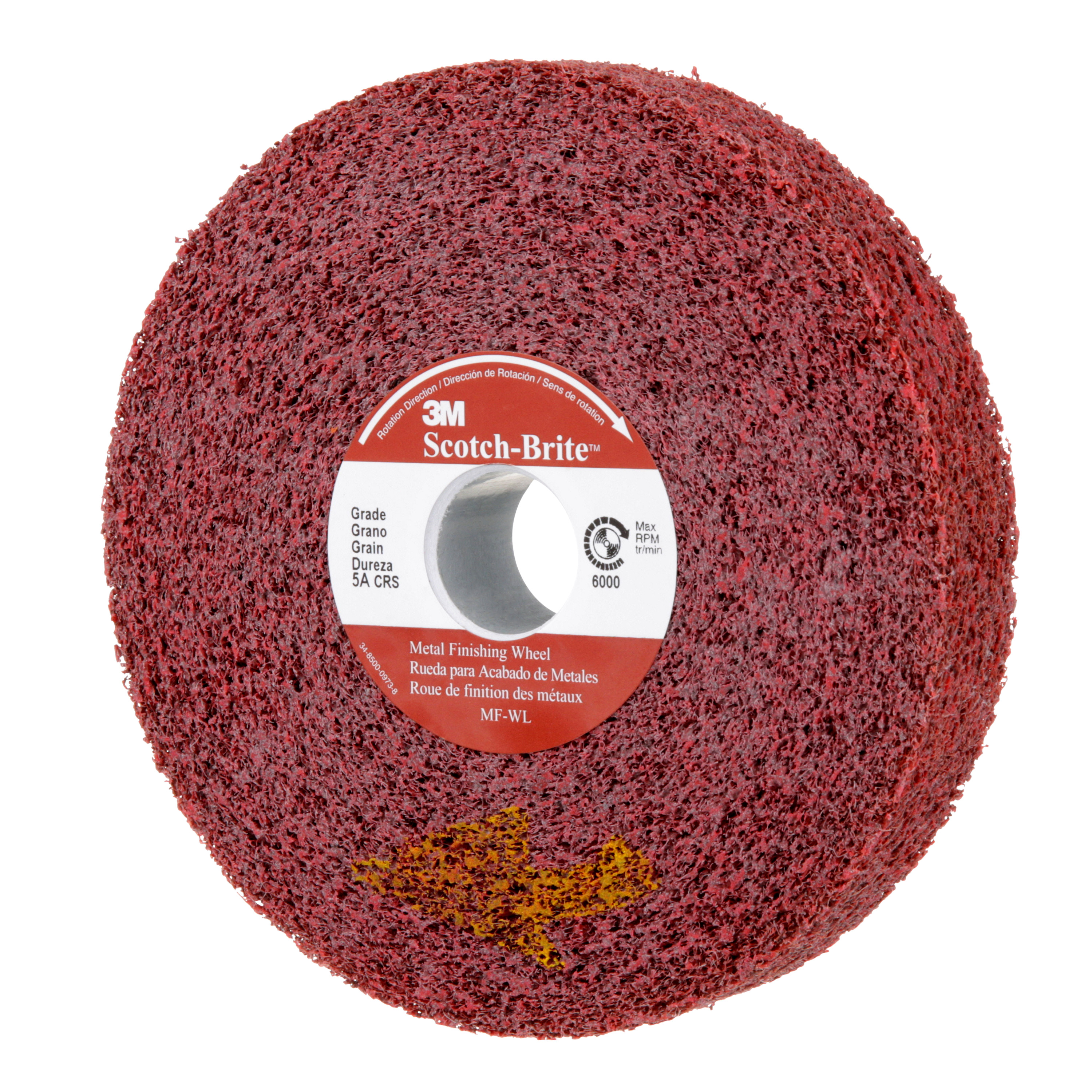 Scotch-Brite™ Metal Finishing Wheel uses aluminum oxide abrasive. Due to its high cut-rate, hardness, strength, and low heat retention, aluminum oxide mineral is widely used in grinding applications in addition to sanding and finishing use. Aluminum oxide is suitable on a wide variety of substrates in both woodworking and metalworking, including ferrous alloys.