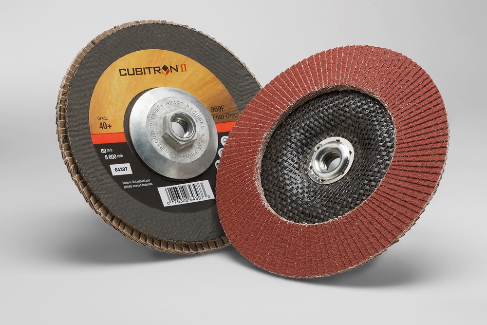 Keeps Cutting After Other Discs Quit3M™ Cubitron™ II Flap Disc 969F – powered by 3M Precision-Shaped grain and a tough polyester backing – is the highest-performing 3M flap disc for demanding applications like heavy grinding, edge deburring and beveling. It also features a grinding aid that helps it run cool to maintain cutting efficiency on heat-sensitive metals. All of these attributes make 3M™ Cubitron™ II Flap Disc 969F a good match for projects that require an equally durable and versatile abrasive disc. Flap Disc DesignFlap discs are the ideal choice for a wide range of applications on a variety of metals. The abrasive flaps offer a long-lasting supply of fresh abrasives in a load-resistant design. Designed for use with a right-angle grinder, flap discs allow you to breeze through a wide range of applications with less chance of gouging – even for less-experienced grinders. Powered by 3M Precision-Shaped Grain3M™ Cubitron™ II Flap Disc 969F features proprietary 3M Precision-Shaped Grain – a grain design that continually fractures into sharp points that slice cleanly through metal, unlike traditional abrasives which tend to plow through the substrate. The grains fracture evenly and continuously to expose new sharp edges to keep the disc cutting efficiently. The result is that 3M™ Cubitron™ II products out-cut and outlast conventional ceramic industrial abrasives. Applications