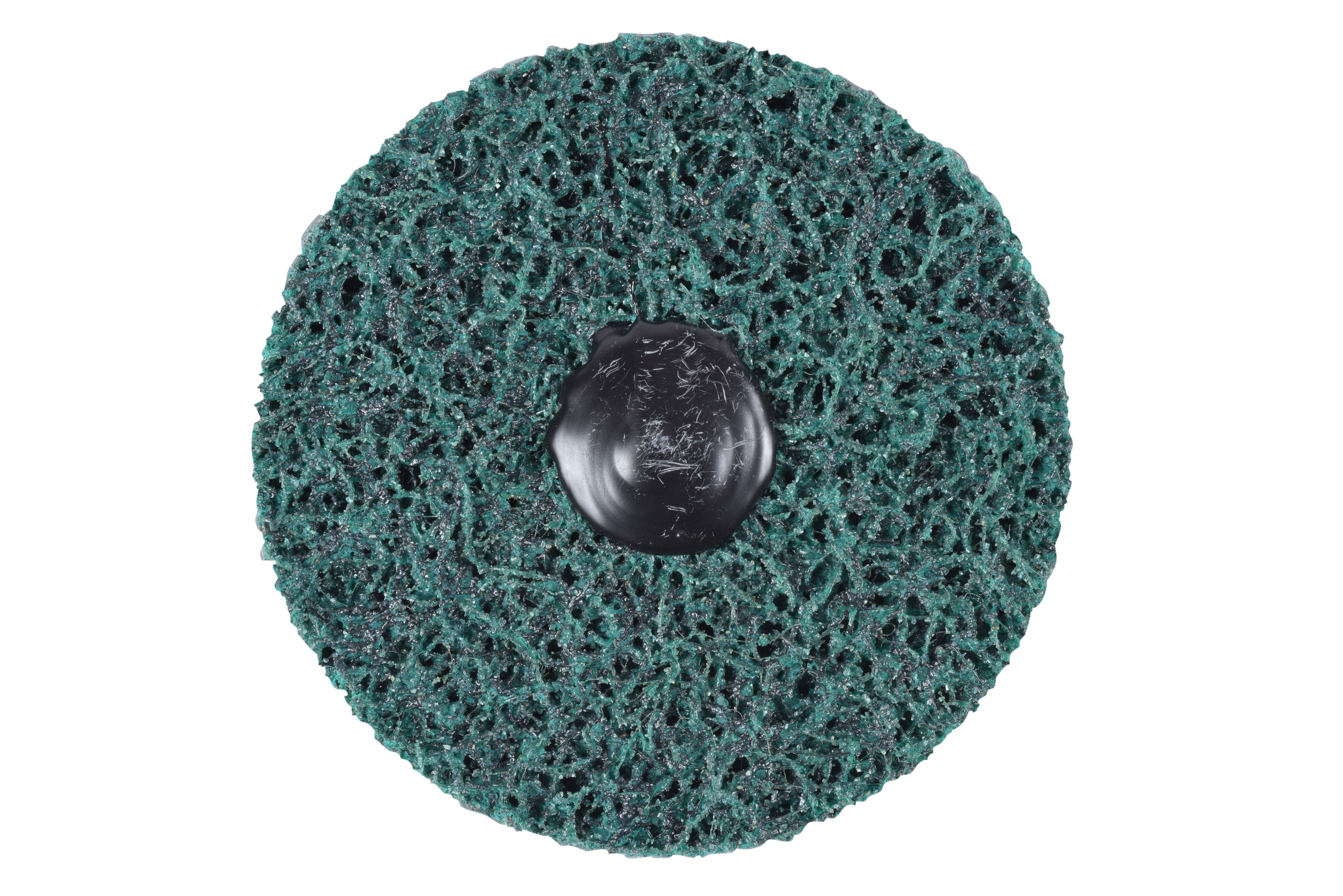 To engineer the Scotch-Brite™ Roloc™+ Clean and Strip XT Pro Extra Cut Disc, aluminum oxide mineral is combined with non-woven nylon fibers using resin. Aluminum oxide is a very hard mineral that delivers a high cut rate, commonly used in high-pressure applications like cutting and weld removal. The resin bond strengthens the fiber web and allows it to gradually break down to reveal new fibers and sharp mineral – delivering a consistent cut over the life of the abrasive. The combination of fiber strands, resin and abrasive mineral forms a thick, open web. Gaps in the web allow swarf to escape, minimizing loading of the abrasive.