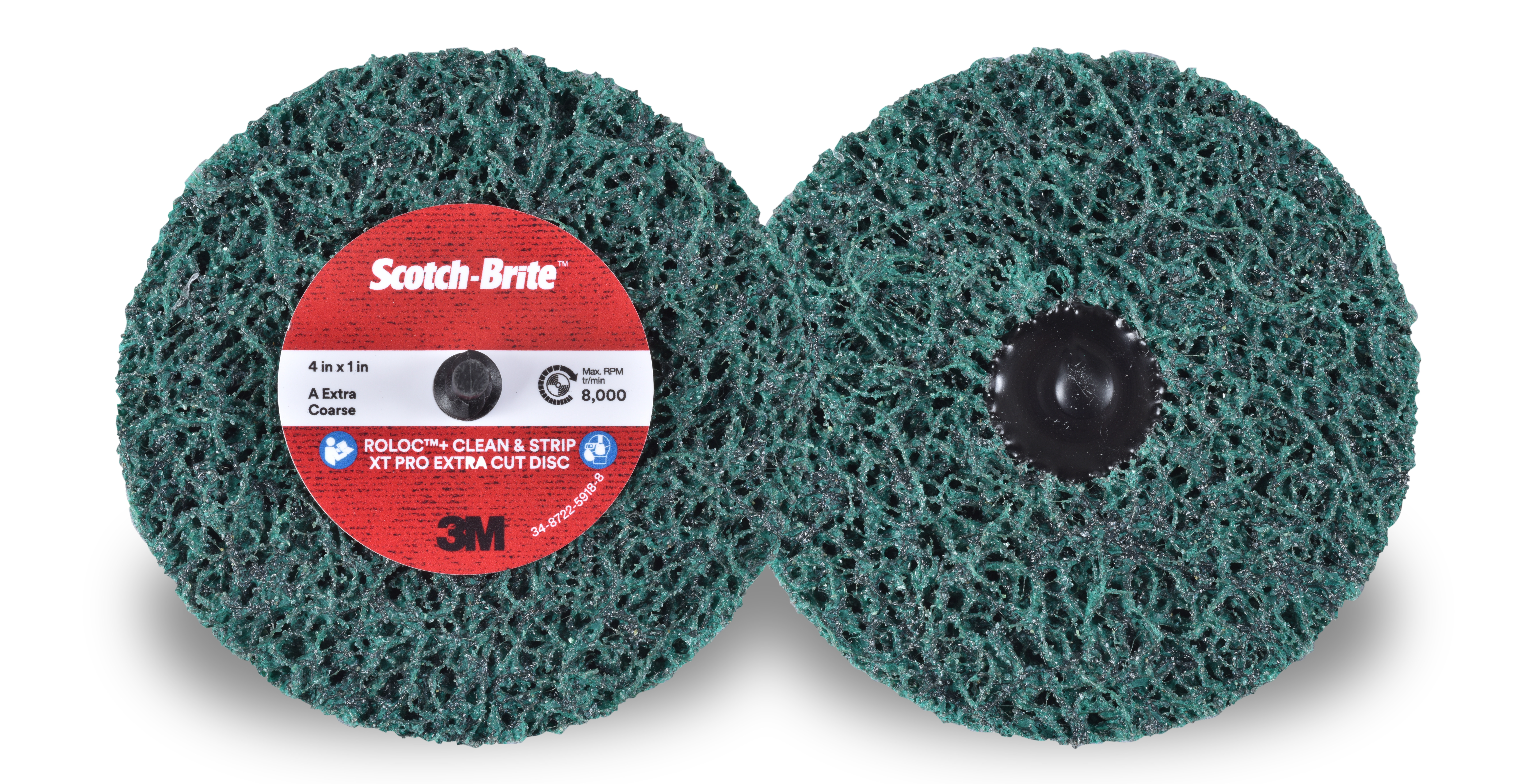In addition to its high conformability, the Scotch-Brite™ Roloc™+ Clean and Strip XT Pro Extra Cut Disc offers low vibration, decreased chunking, a high speed rating and long life. That all adds up to a disc you can spin onto your disc sander or die grinder with confidence.