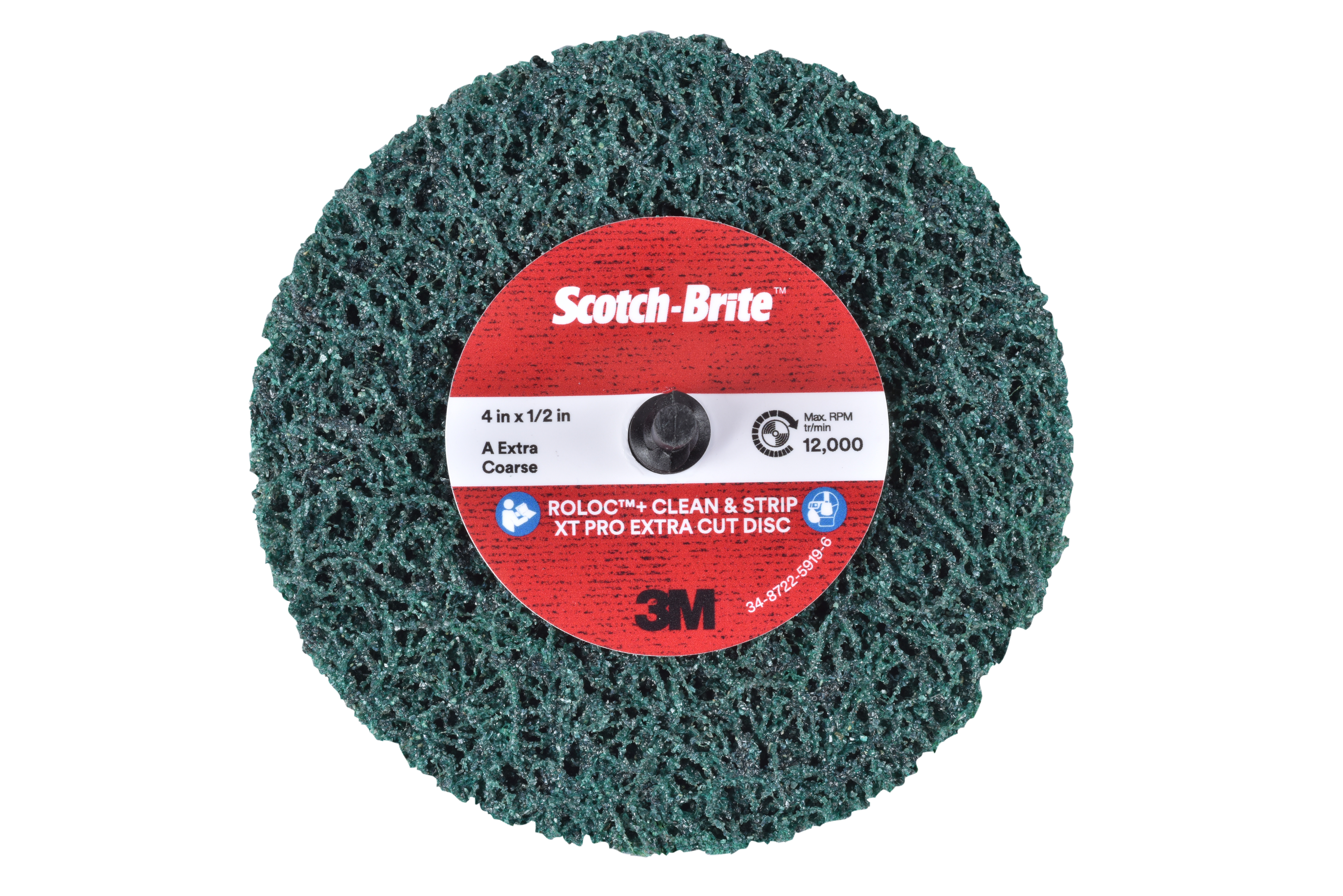 Scotch-Brite™ Roloc™+ Clean and Strip XT Pro Extra Cut Disc, XC-DR+, A/O Extra Coarse, TR+, Green, 4 in x 1/2 in, 10 ea/Case
