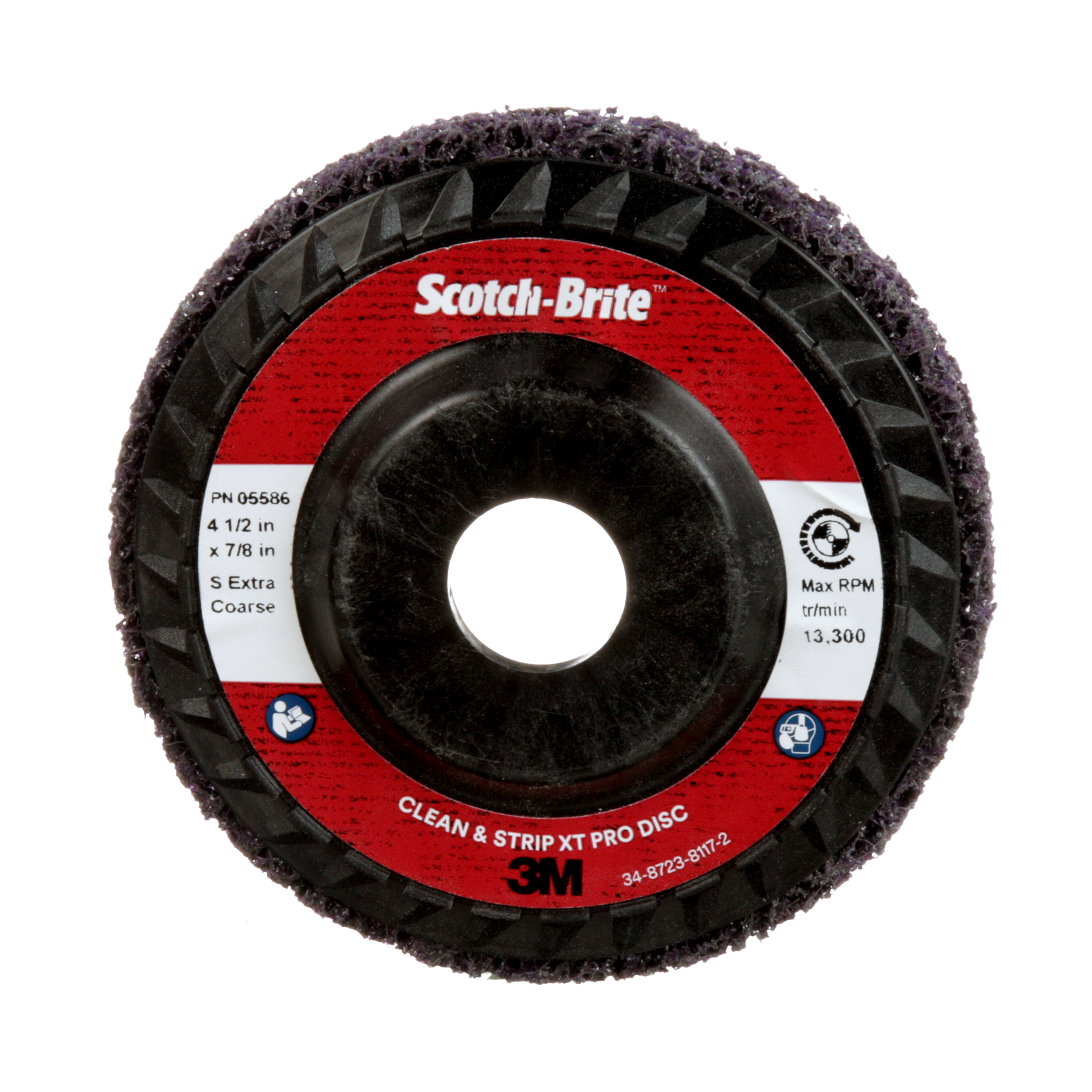 All Products>Abrasives>Scotch-Brite™ Clean and Strip XT Pro Disc, XO-DC, SiC Extra Coarse, Purple, 4-1/2 in x 7/8 in, Type 27, 10 ea/Case