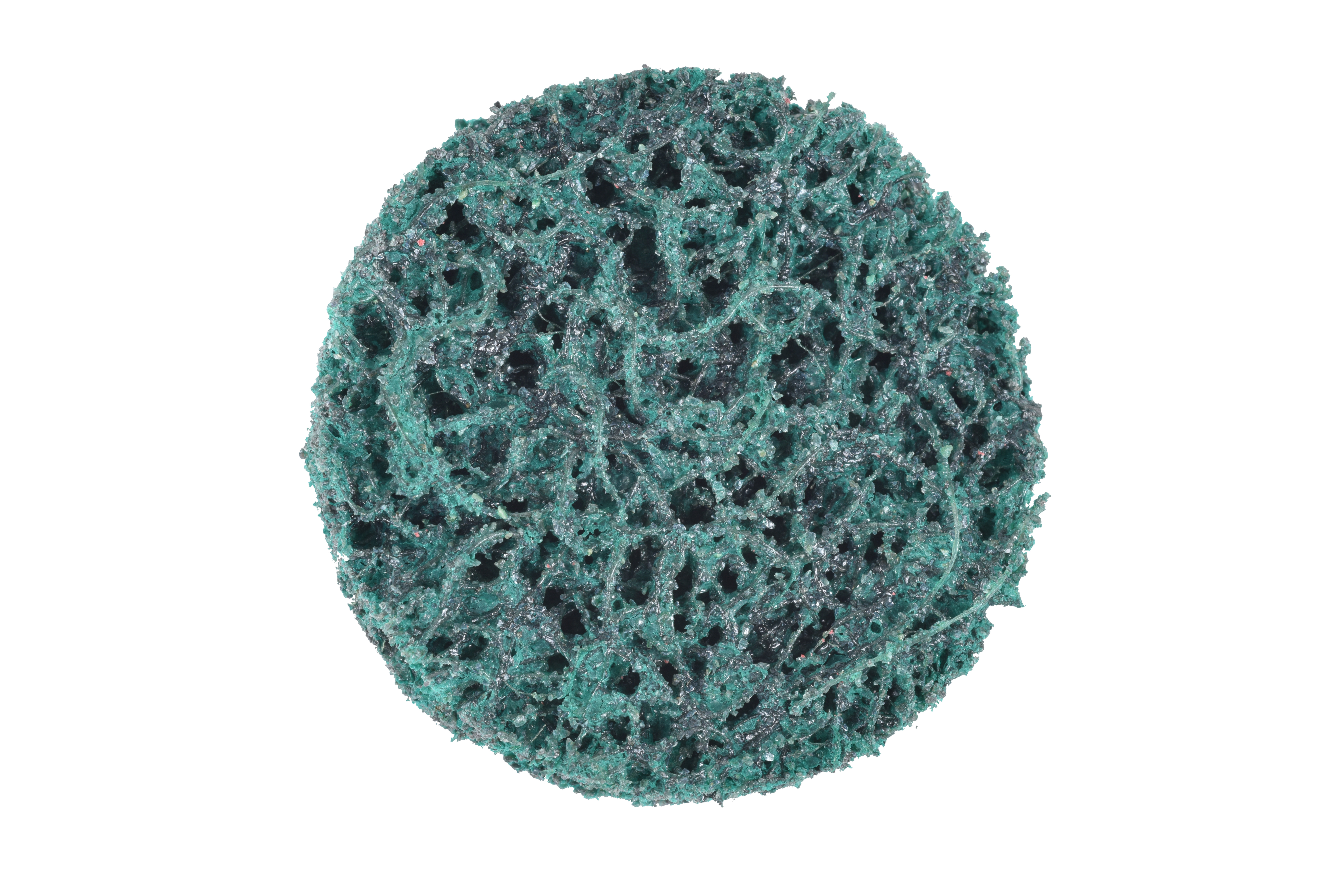 To engineer the Scotch-Brite™ Roloc™ Clean and Strip XT Pro Extra Cut Disc, aluminum oxide mineral is combined with non-woven nylon fibers using resin. Aluminum oxide is a very hard mineral that delivers a high cut rate, commonly used in high-pressure applications like cutting and weld removal. The resin bond strengthens the fiber web and allows it to gradually break down to reveal new fibers and sharp mineral – delivering a consistent cut over the life of the abrasive. The combination of fiber strands, resin and abrasive mineral forms a thick, open web. Gaps in the web allow swarf to escape, minimizing loading of the abrasive.