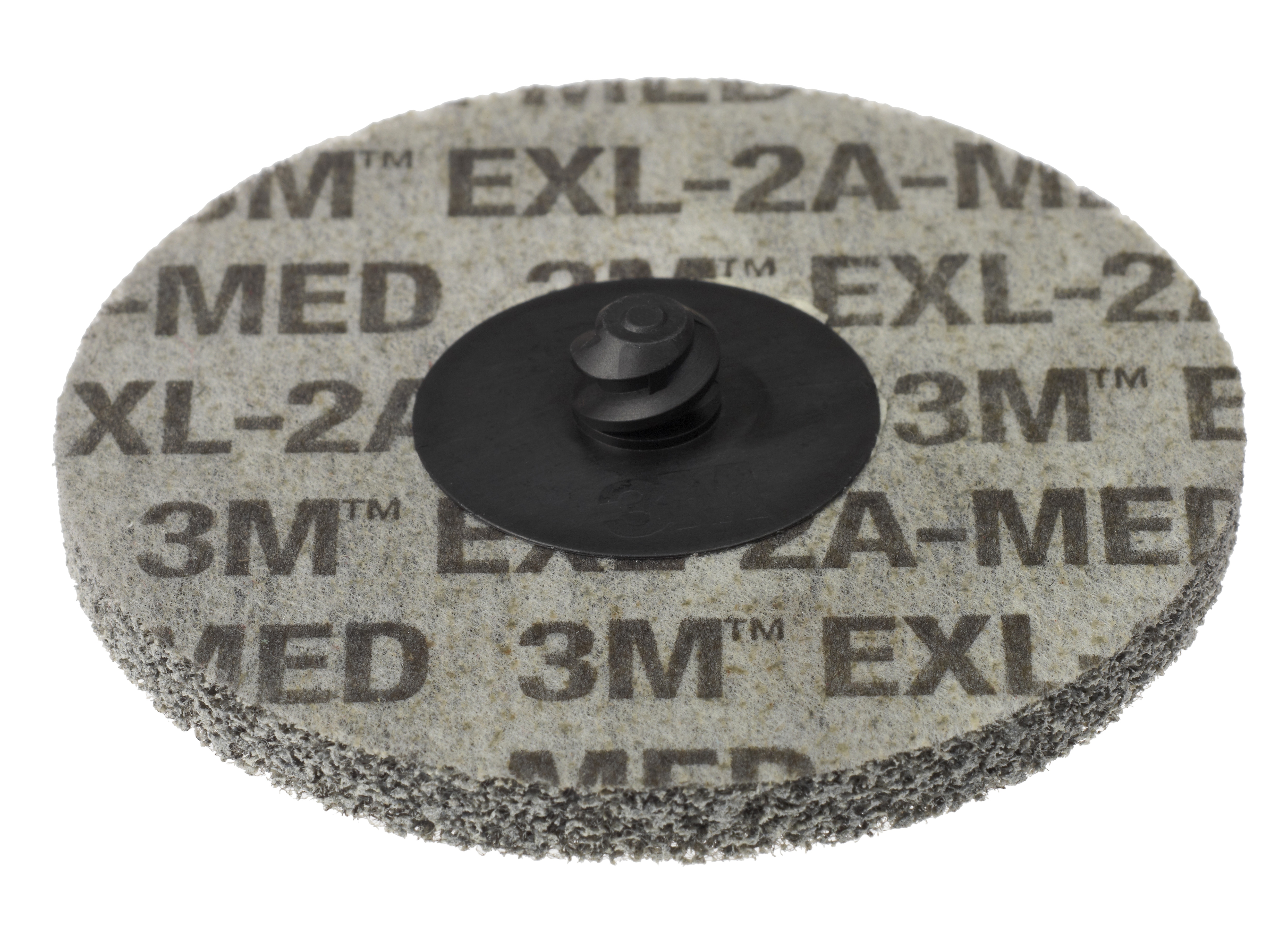 EXL material in the higher densities is chosen to be extremely tough, delivering aggressive cutting power for effective deburring of edges and corners without damaging the part. The lower densities are soft and conformable and work well for finishing contoured surfaces. This disc also features the 3M™ Roloc™ Quick Release System for quick and easy disc changes. Roloc discs allow use of both the edge and surface of the wheel without interruption of mounting hardware. Available grades: Fine, Medium, and Course. .