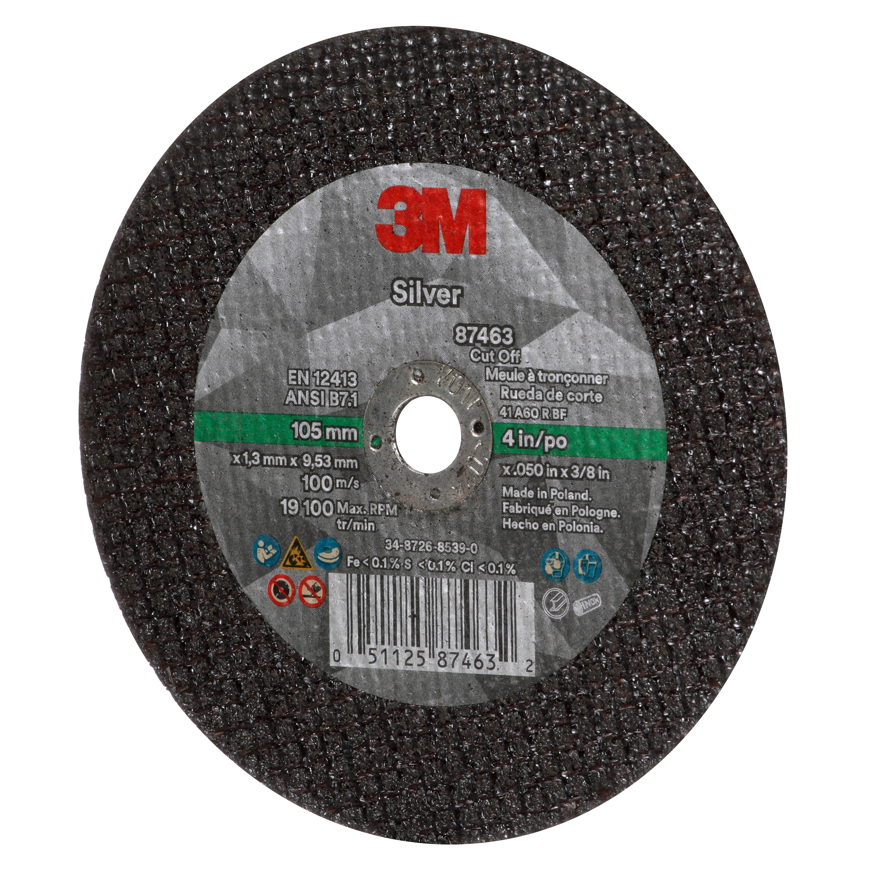 All Products>Abrasives>3M™ Silver Cut-Off Wheel, 87463, 36+, T1, 4 in x 0.05 in x 3/8 in, 50 ea/Case