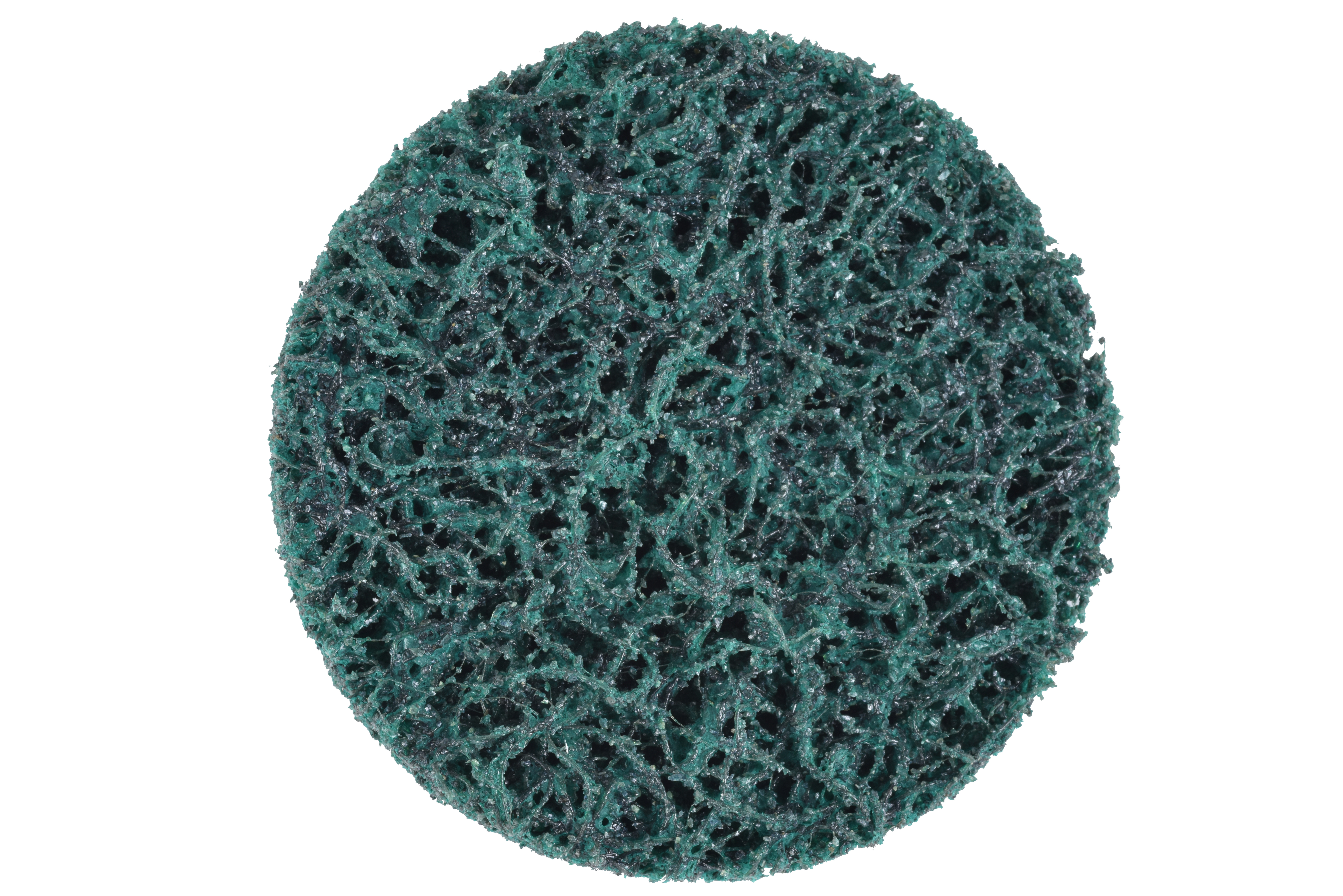 To engineer the Scotch-Brite™ Roloc™ Clean and Strip XT Pro Extra Cut Disc, aluminum oxide mineral is combined with non-woven nylon fibers using resin. Aluminum oxide is a very hard mineral that delivers a high cut rate, commonly used in high-pressure applications like cutting and weld removal. The resin bond strengthens the fiber web and allows it to gradually break down to reveal new fibers and sharp mineral – delivering a consistent cut over the life of the abrasive. The combination of fiber strands, resin and abrasive mineral forms a thick, open web. Gaps in the web allow swarf to escape, minimizing loading of the abrasive.