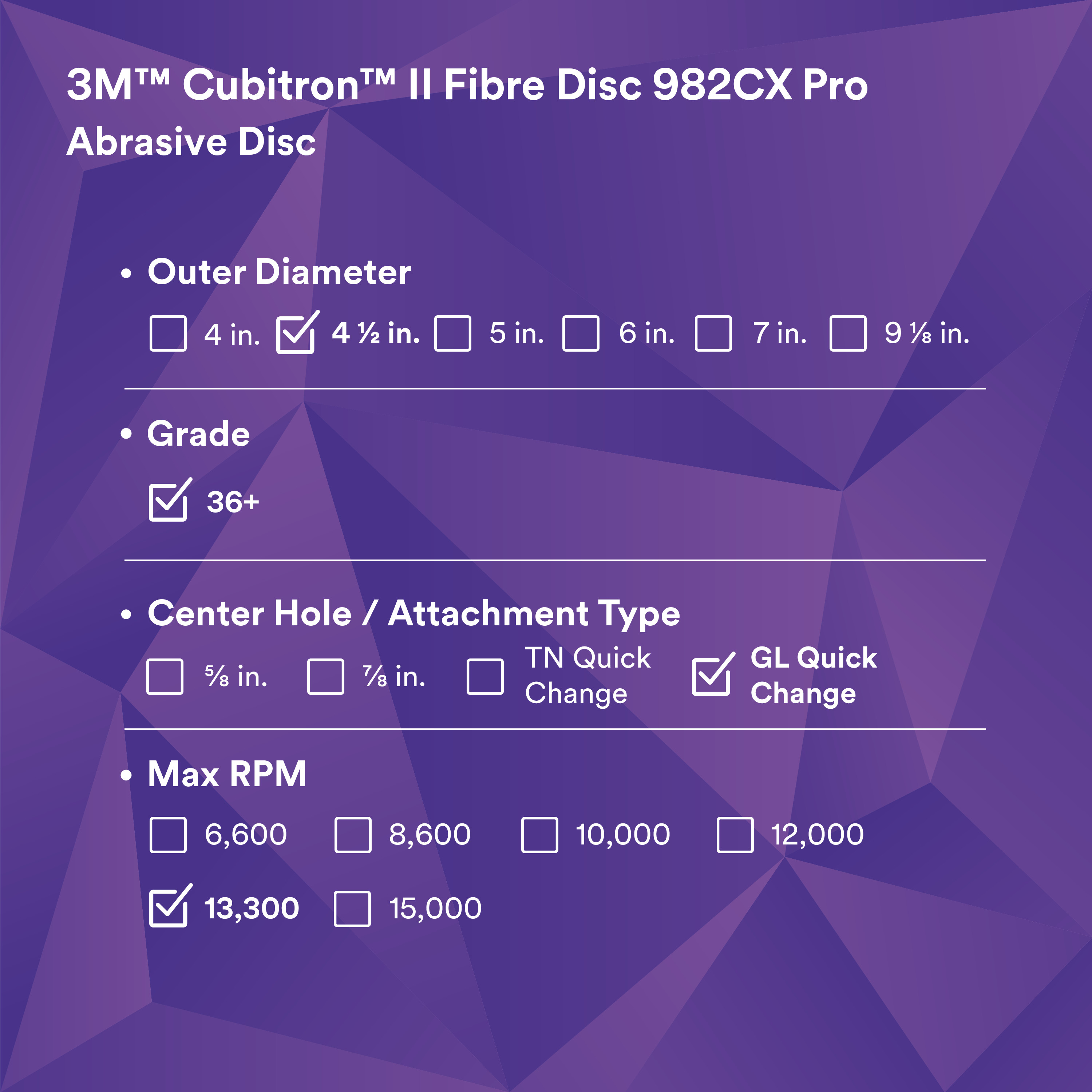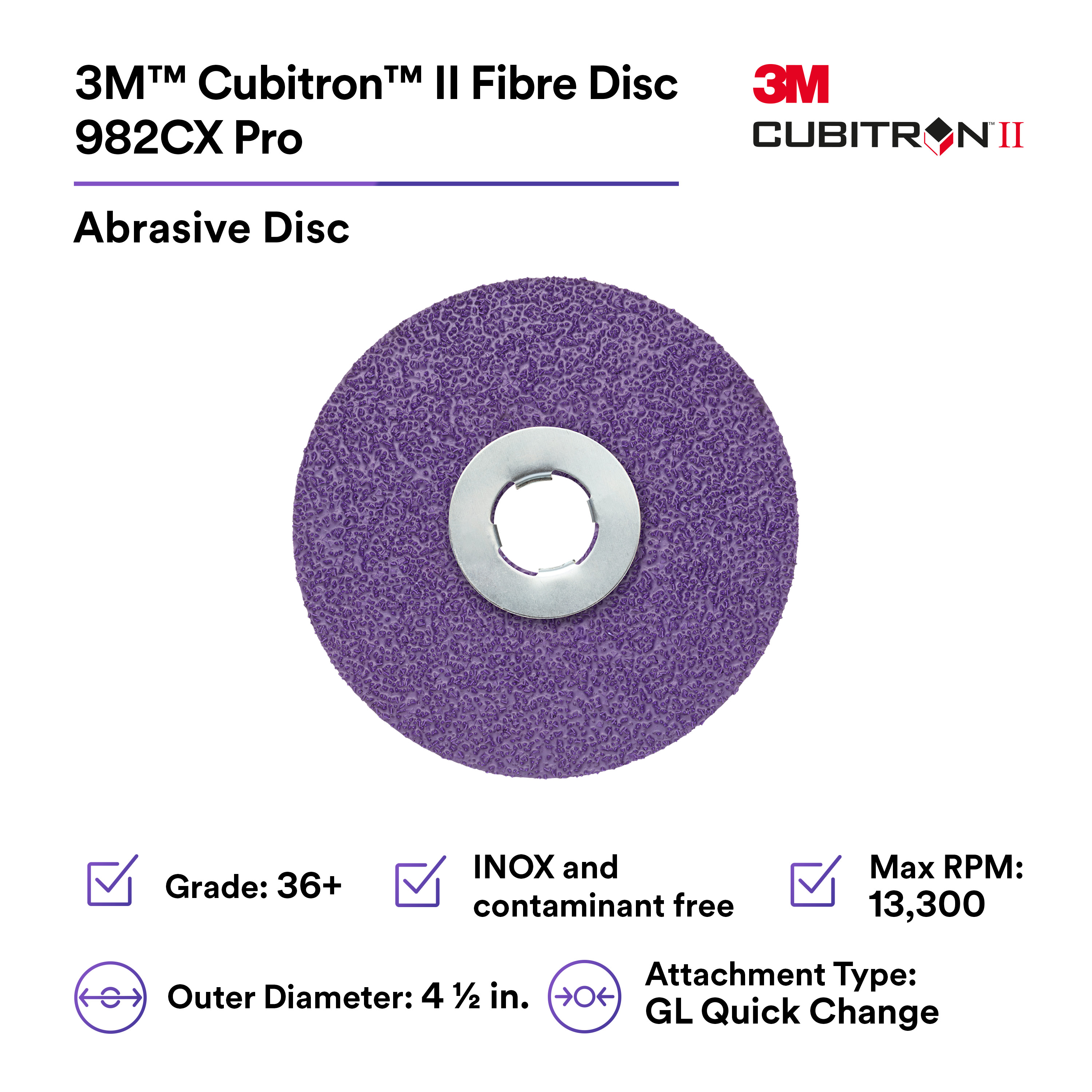 3M™ Cubitron™ II Fibre Disc 982CX Pro, 36+, GL Quick Change, 4-1/2 in, Die G450E, 25/Bag, 100 ea/Case