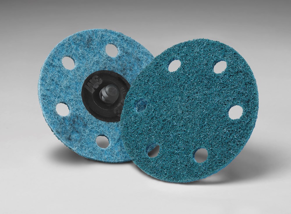 Scotch-Brite™ surface conditioning products were developed with abrasives incorporated into non-woven nylon or synthetic fibers. Combining abrasives with the fibers creates an abrasive system that delivers consistent results for the life of the product. The open-web material runs cool, reducing the risk of part discoloration and warping. The fibers are load resistant and keep the abrasive minerals cutting at high performance by limiting clogging of the fibers, which also extends the life of the disc.
