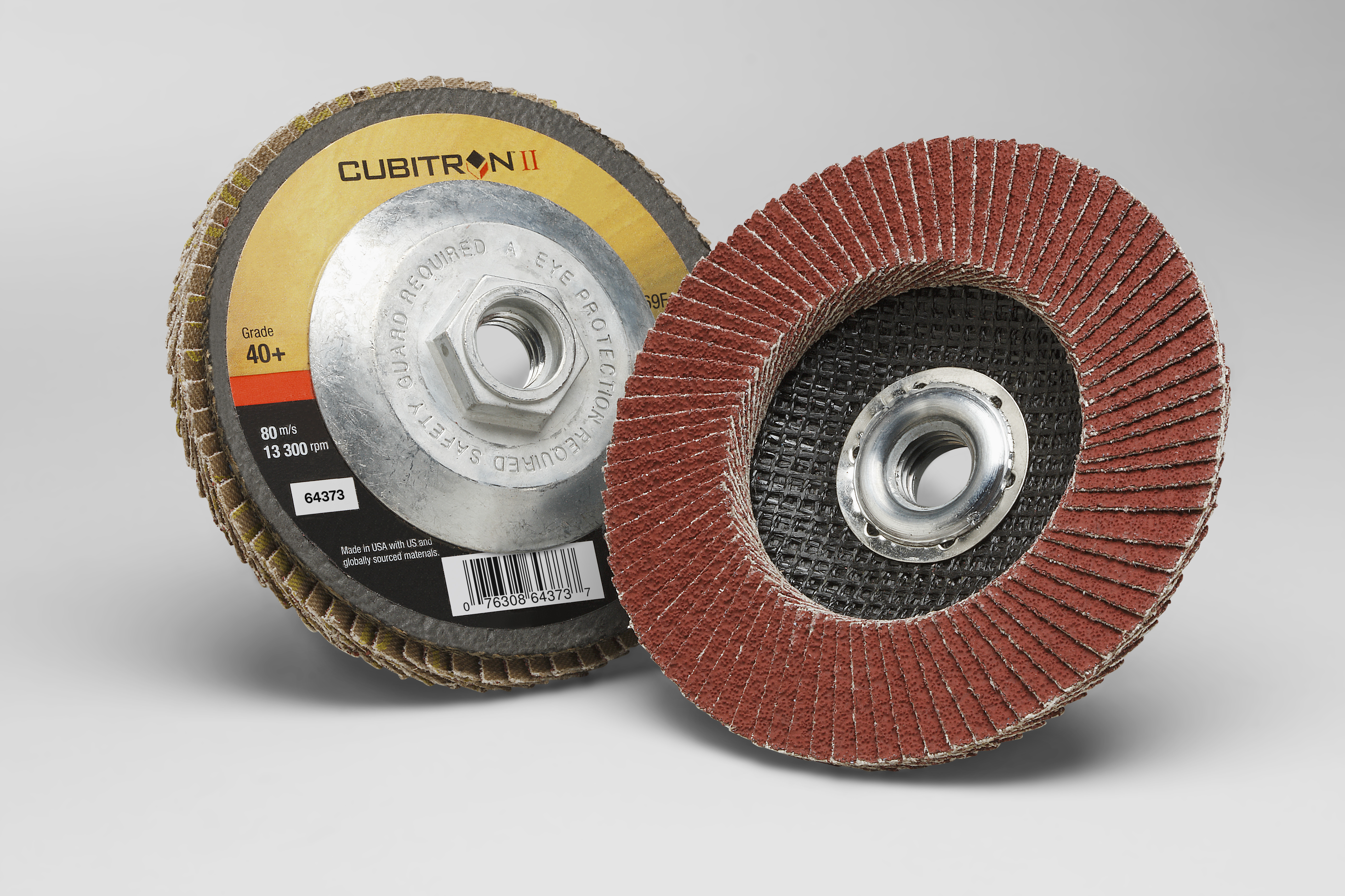 Keeps Cutting After Other Discs Quit3M™ Cubitron™ II Flap Disc 969F – powered by 3M Precision-Shaped grain and a tough polyester backing – is the highest-performing 3M flap disc for demanding applications like heavy grinding, edge deburring and beveling. It also features a grinding aid that helps it run cool to maintain cutting efficiency on heat-sensitive metals. All of these attributes make 3M™ Cubitron™ II Flap Disc 969F a good match for projects that require an equally durable and versatile abrasive disc. Flap Disc DesignFlap discs are the ideal choice for a wide range of applications on a variety of metals. The abrasive flaps offer a long-lasting supply of fresh abrasives in a load-resistant design. Designed for use with a right-angle grinder, flap discs allow you to breeze through a wide range of applications with less chance of gouging – even for less-experienced grinders. Powered by 3M Precision-Shaped Grain3M™ Cubitron™ II Flap Disc 969F features proprietary 3M Precision-Shaped Grain – a grain design that continually fractures into sharp points that slice cleanly through metal, unlike traditional abrasives which tend to plow through the substrate. The grains fracture evenly and continuously to expose new sharp edges to keep the disc cutting efficiently. The result is that 3M™ Cubitron™ II products out-cut and outlast conventional ceramic industrial abrasives. Applications